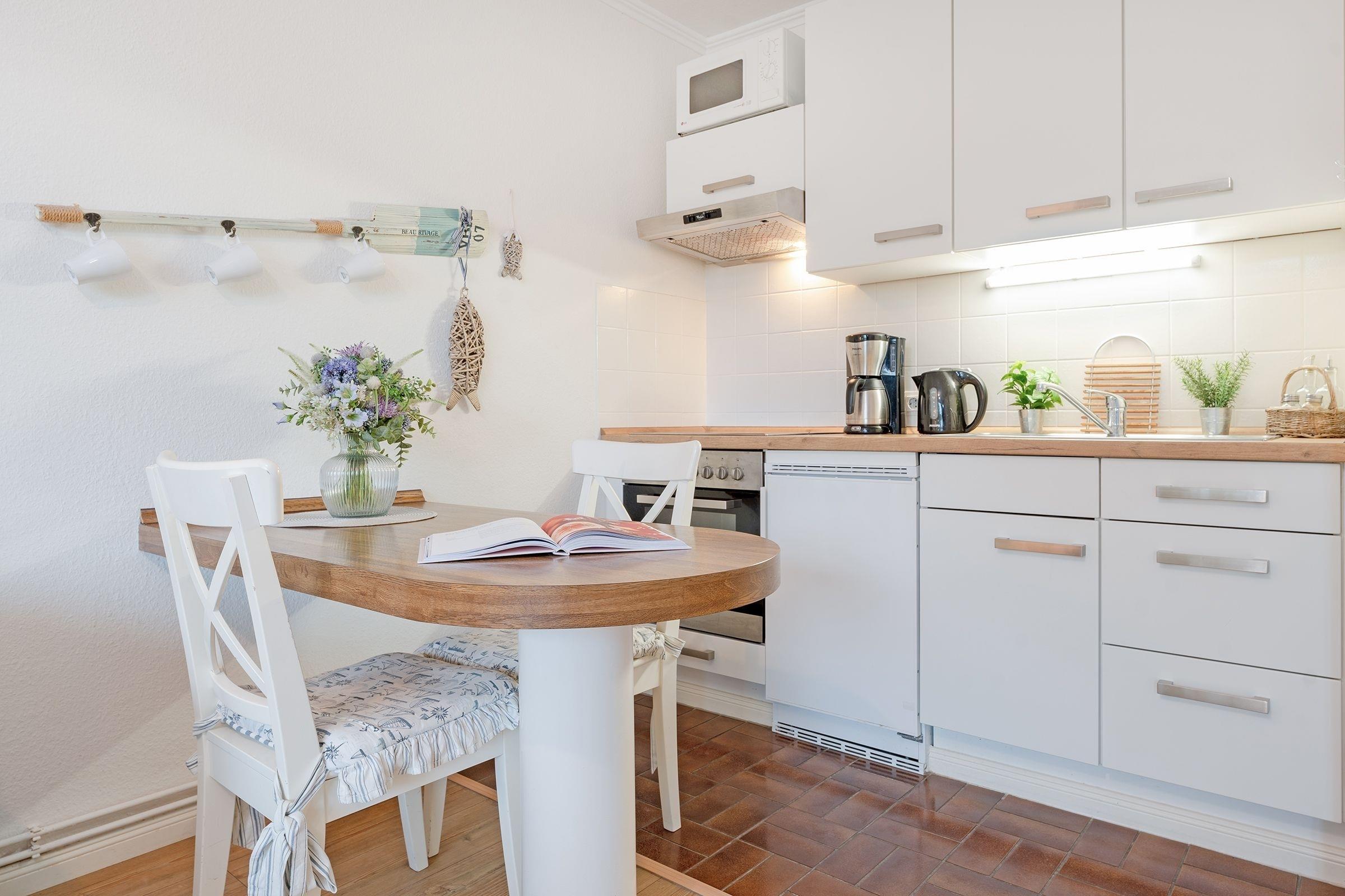 Die moderne Küchenzeile ist in den Wohnraum integriert und erfreut im Urlaub mit Alltagshelfern wie Ceranherd, Backofen und Mikrowelle. Genießen Sie die erste Tasse Kaffee am geselligen Esstresen mit Platz für zwei. Das kleine, aber feine Badezimmer ist geschmackvoll gestaltet und sorgt mit Regendusche, Fön und beleuchtetem Spiegel für gute Laune.