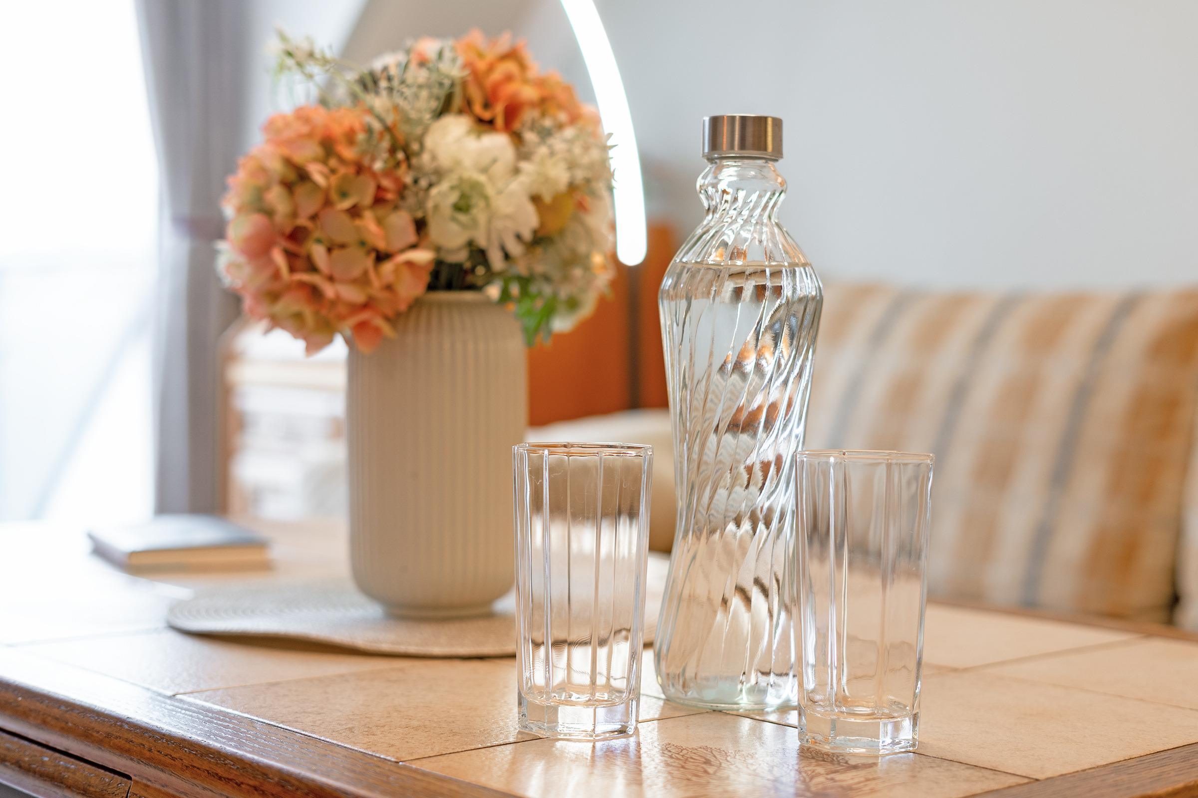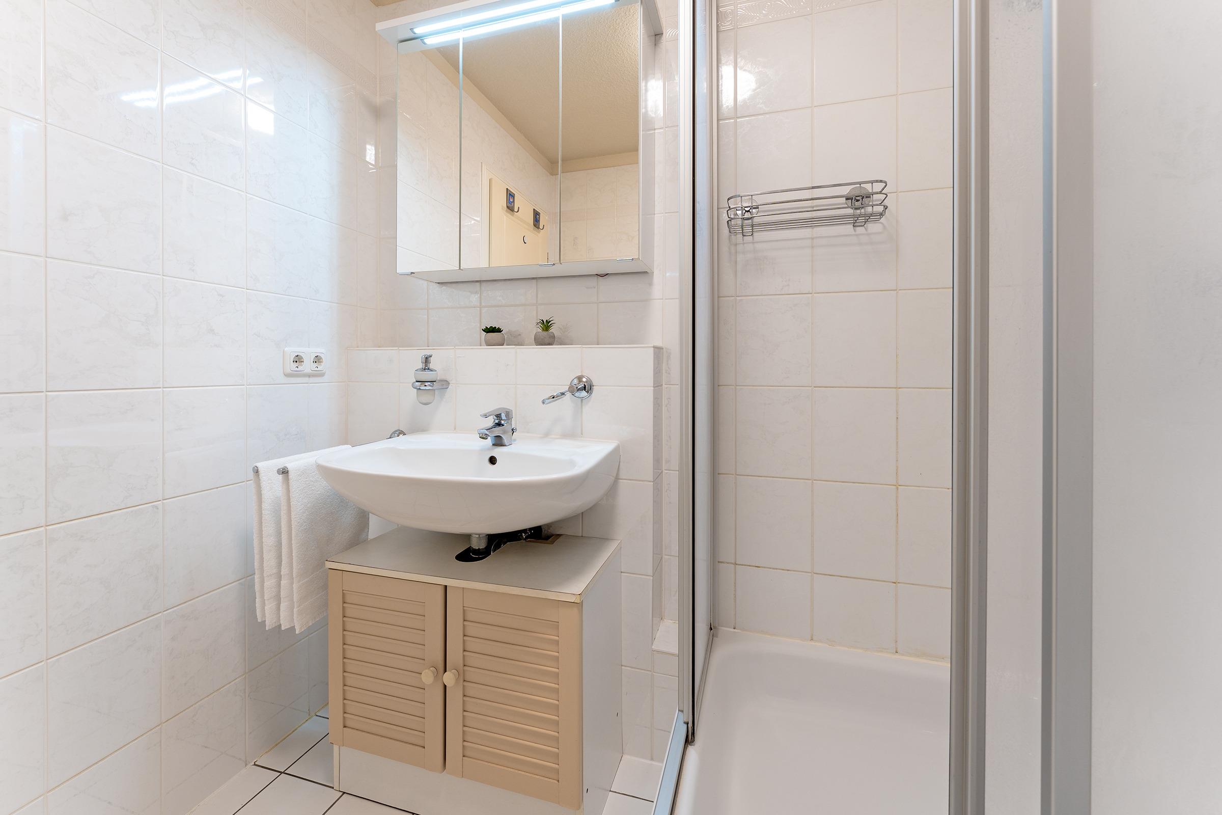 Es gibt einen Schlafraum mit einem Doppelbett (2x 90x200 cm) und ein helles Duschbad. Im Wohnraum befinden sich eine Couchgarnitur mit einem Sessel, welche zu einer weiteren Schlafgelegenheit (90x200 cm) umgewandelt werden kann, eine Musikanlage und ein TV. Die Küchenzeile ist ausgestattet mit Kühlschrank mit Gefrierfach, Geschirrspüler, 2-Plattenherd, Mikrowelle, Kaffeemaschine, Wasserkocher und Toaster. Der Couchtisch kann zum Esstisch umfunktioniert werden. Der Balkon bietet eine schöne Ausrichtung und verfügt über Gartenmöbel.