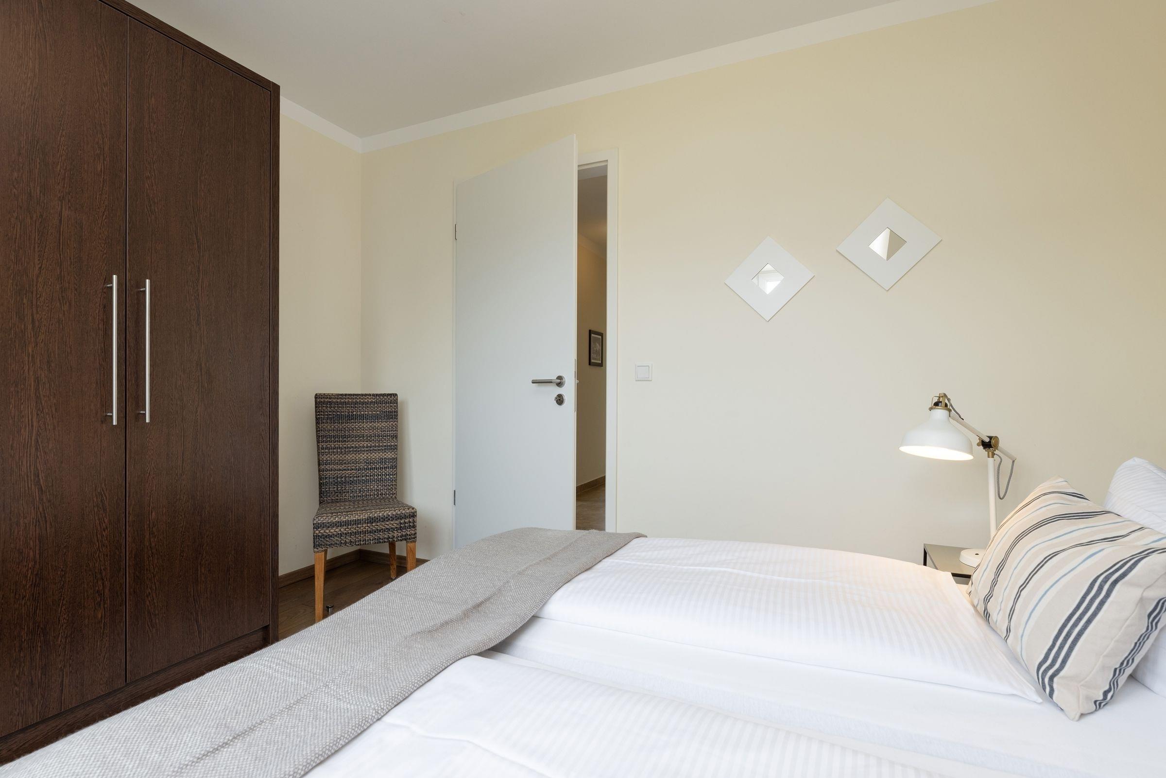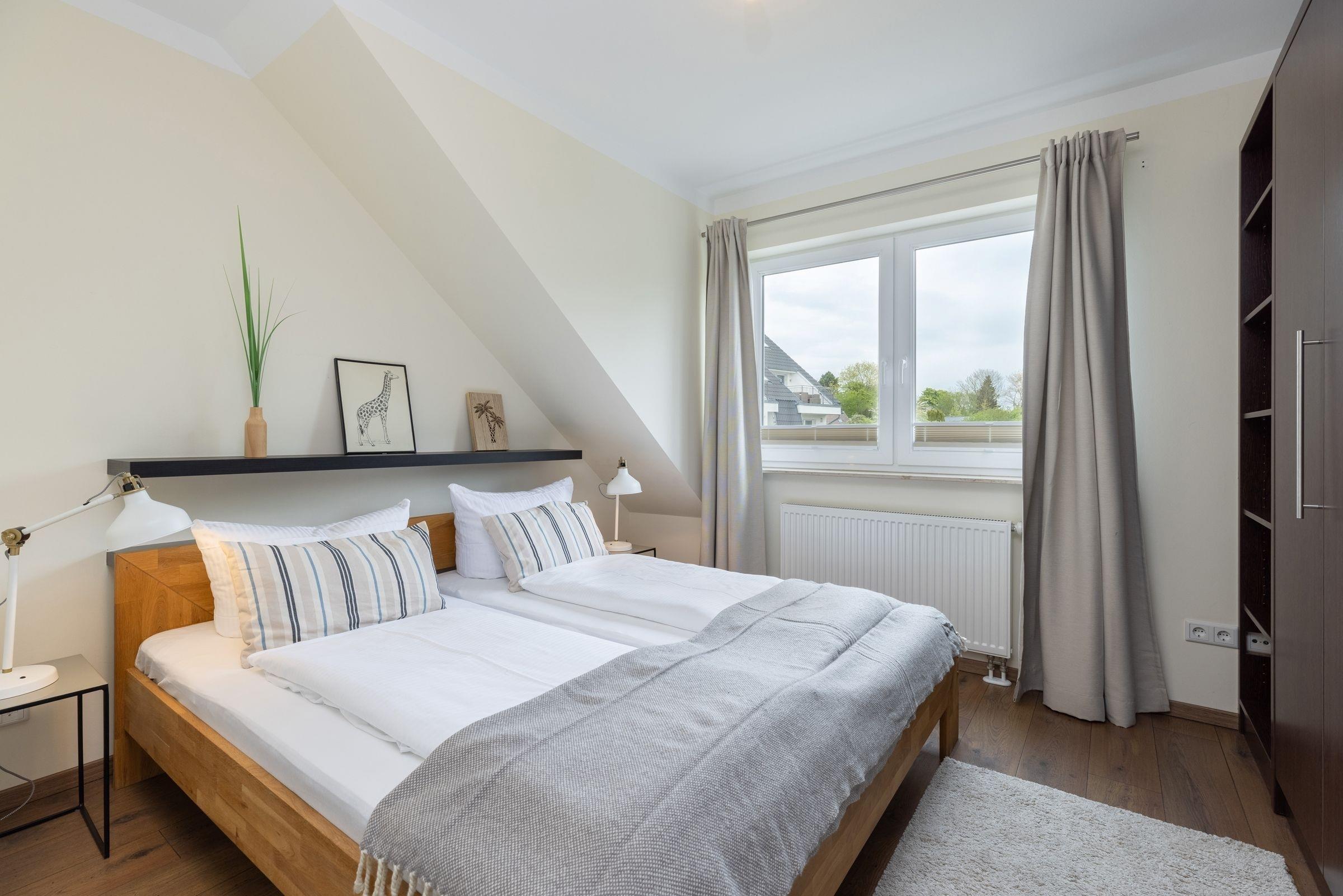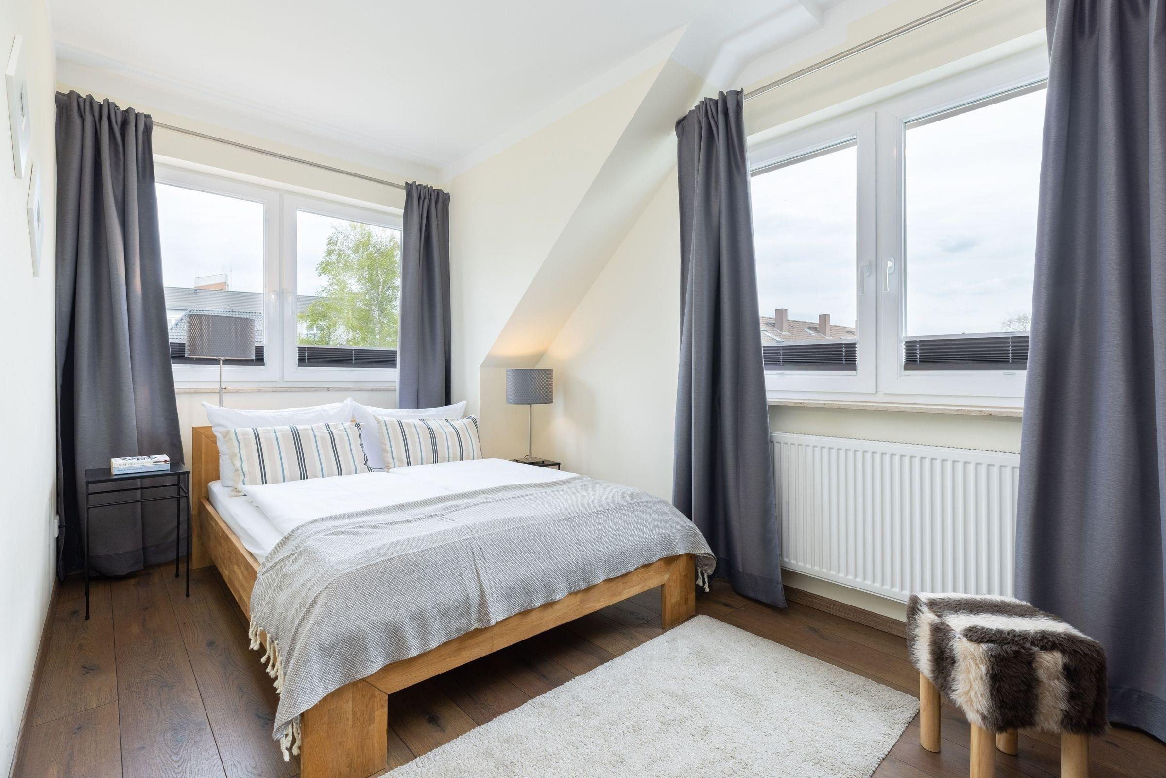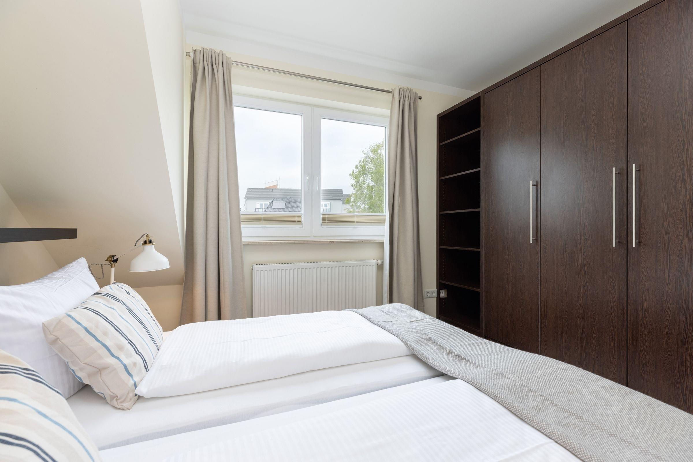 Schlafzimmer 1: 1 Doppelbett (2x 90x200 cm), Kleiderschrank, Verdunkelung (Plissees)