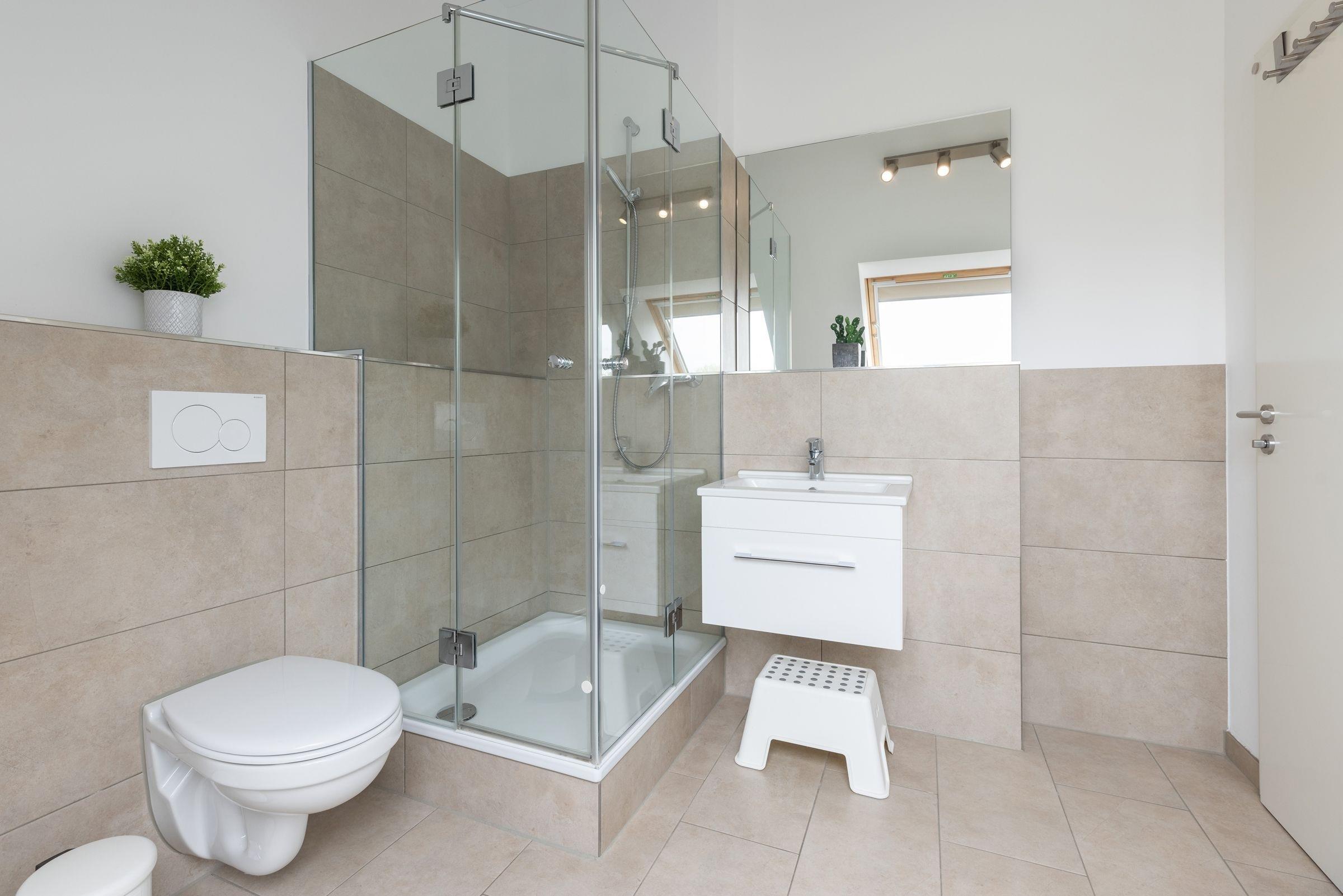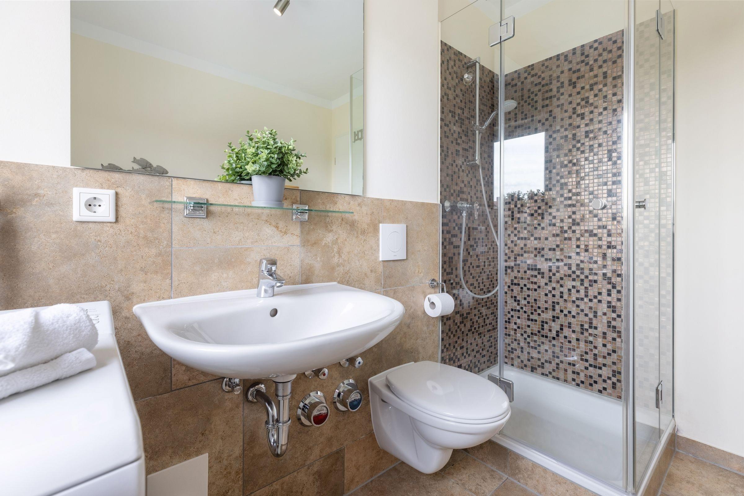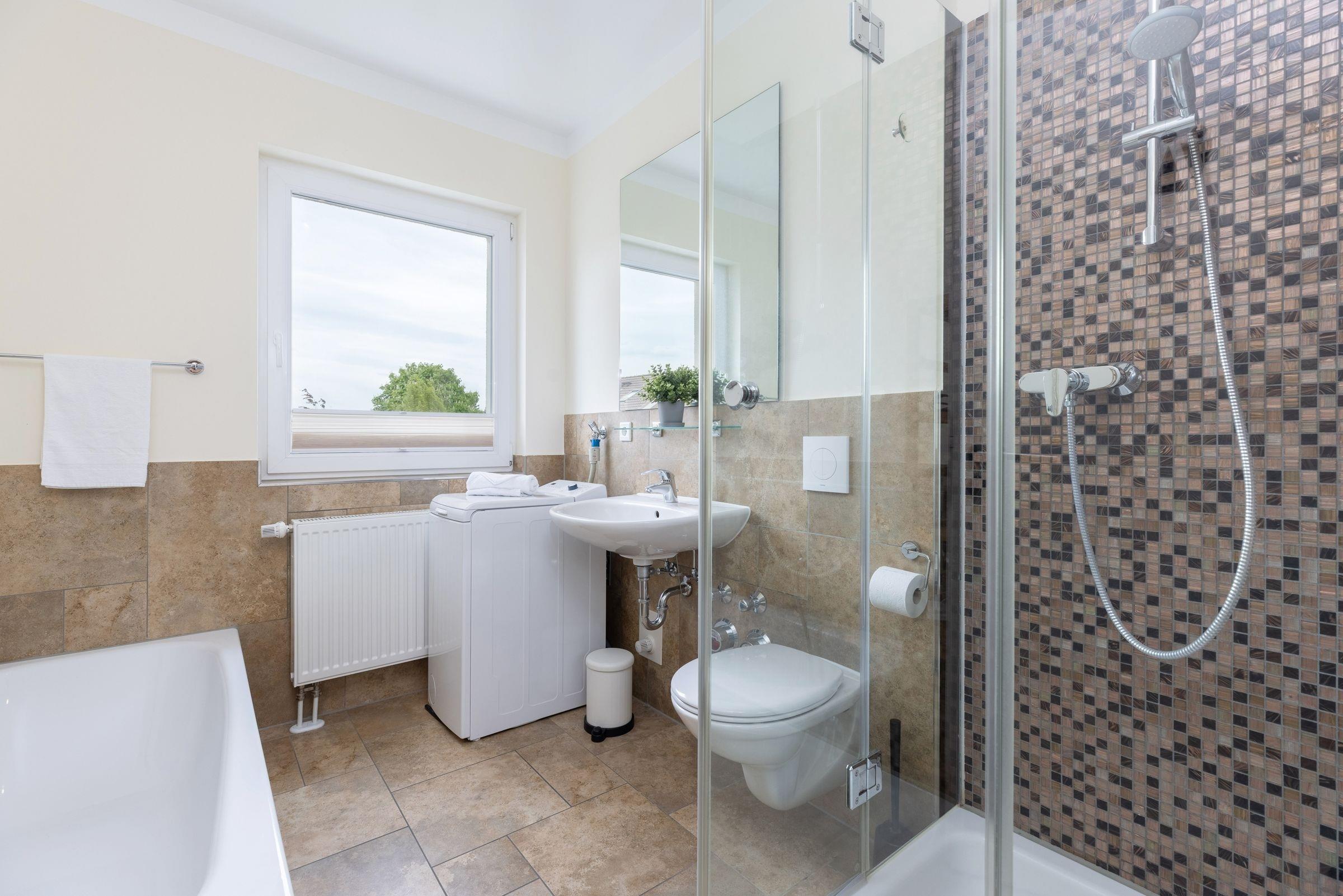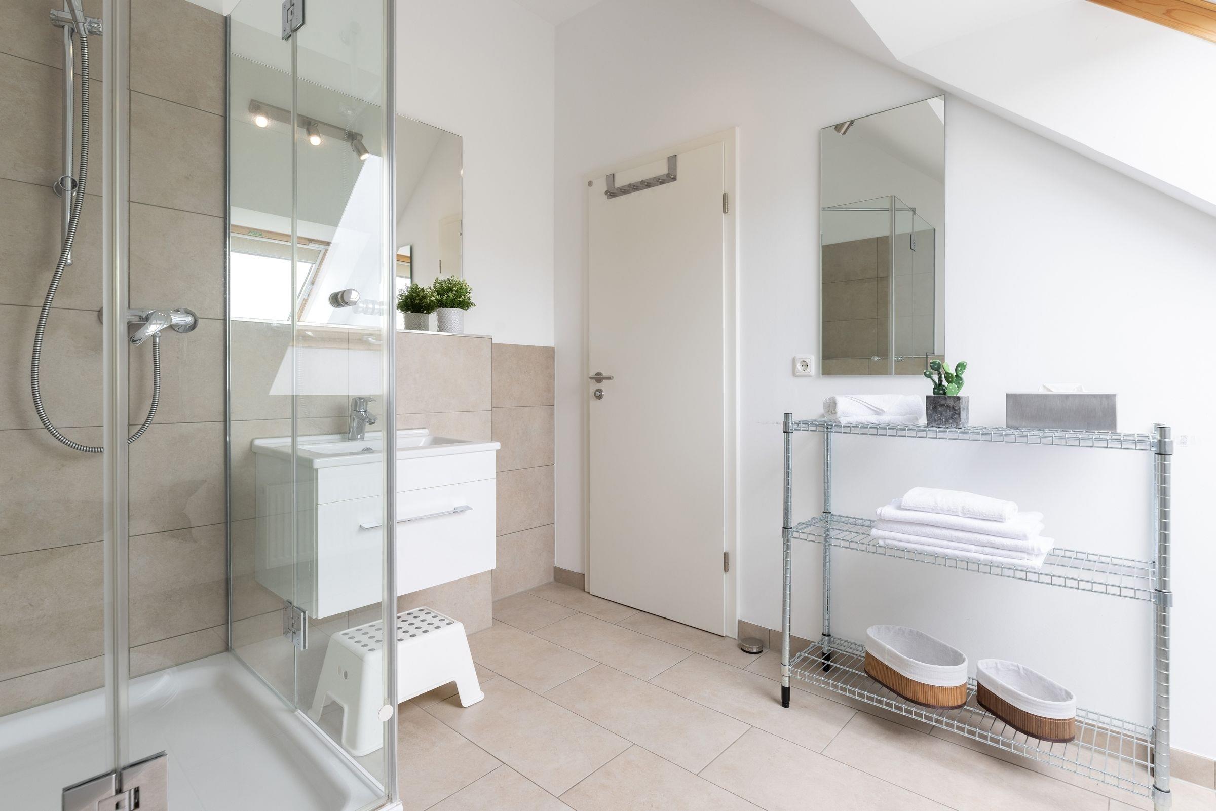 Hier stehen Ihnen drei Schlafräume zur Verfügung, von denen zwei mit einem Doppelbett (je 2x 90x200 cm), und eines mit einem kleinen Doppelbett (140x200 cm) ausgestattet ist. Für einen erholsamen Schlaf sorgen Verdunkelungsplissees in allen Schlafräumen. Das große, moderne Badezimmer verfügt über eine Dusche und zusätzliche über eine Badewanne. Im hellen, lichtdurchfluteten Wohnraum befinden sich eine moderne und gemütliche Couchgarnitur, ein DVD-Player und ein LCD-TV. Hier können Sie die Abende bei guter Musik oder einem spannenden Film ausklingen lassen. Die offene und im Wohnraum integrierte Küchenzeile ist ausgestattet mit Kühlschrank inkl. Gefrierfach, 4-Plattenceranherd, Backofen, Geschirrspüler, Kaffeemaschine, Wasserkocher und Toaster. Außerdem steht hier der große Esstisch für bis zu 6 Personen bereit. Von diesem Zimmer gelangen Sie auf den großzügige Balkon der eine schöne Ausrichtung in Richtung Sonne bietet und über bequeme Lounge-Gartenmöbel verfügt, also steht auch den lauwarmen, sternenklaren Abenden im Freien nichts im Weg. Über eine Treppe gelangen Sie in die 2. Etage, in der sich eines der 3 vorhandenen Schlafzimmer, sowie ein weiteres Duschbad befindet.