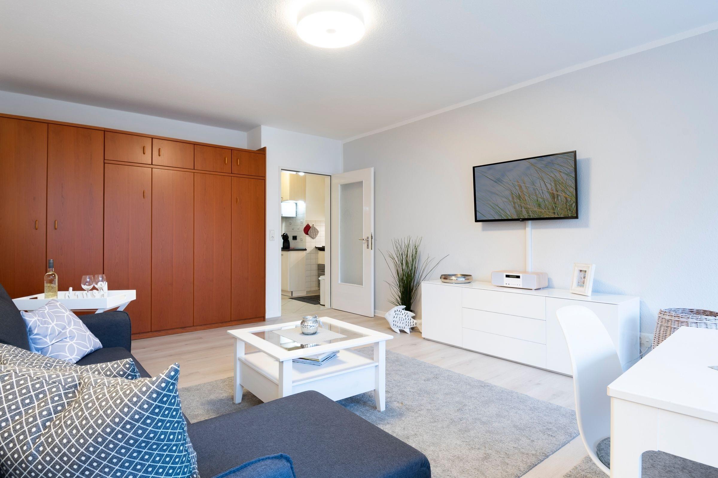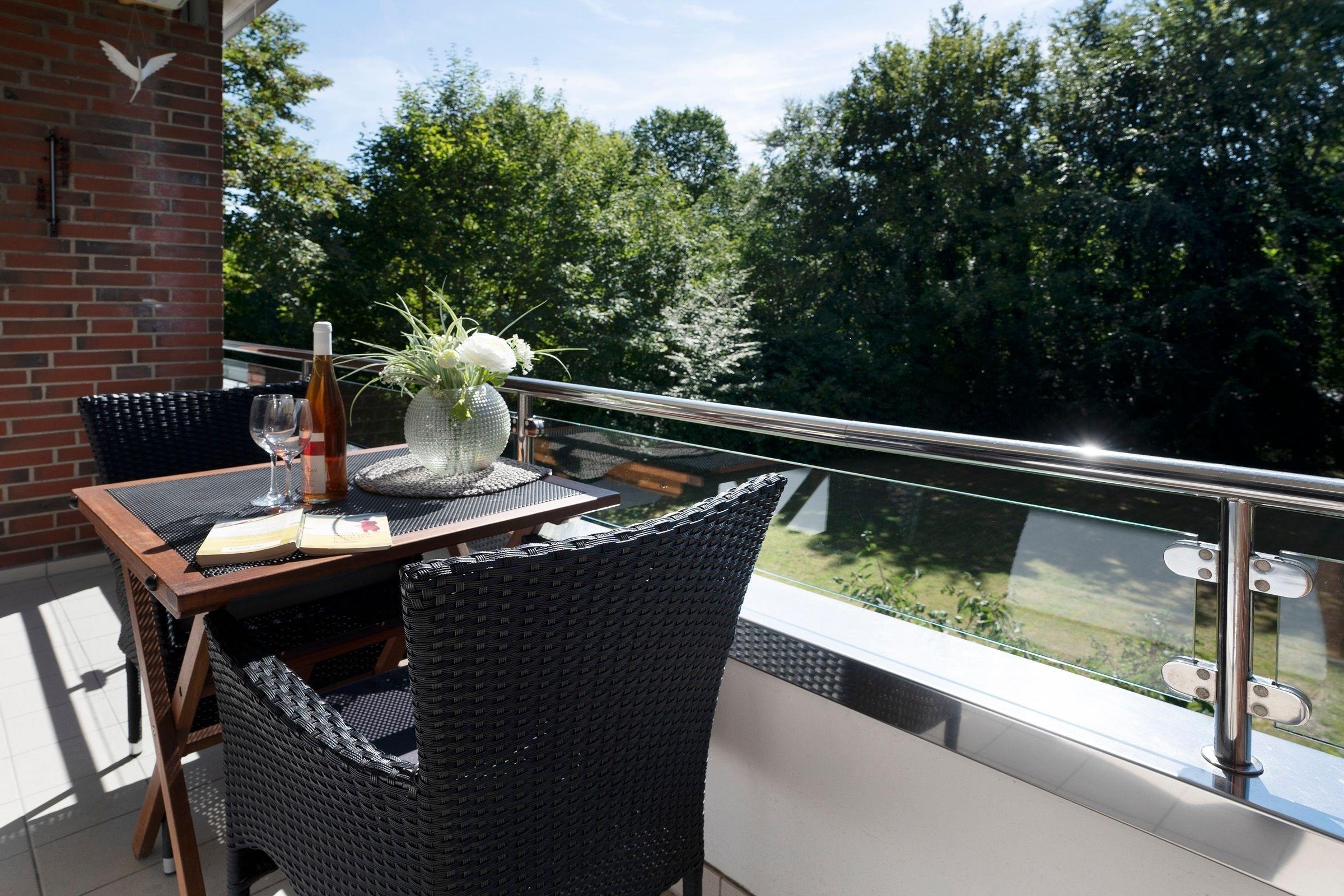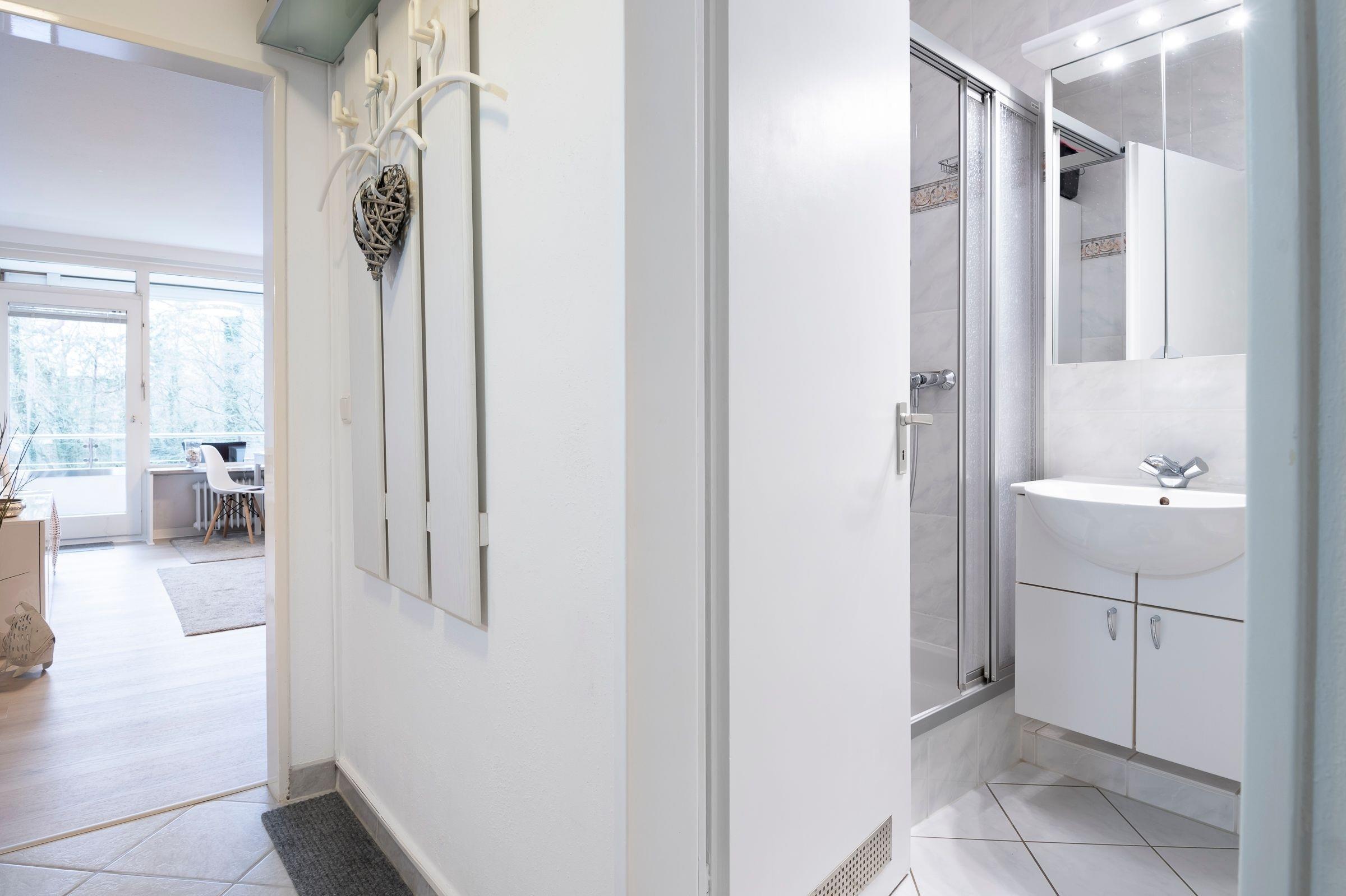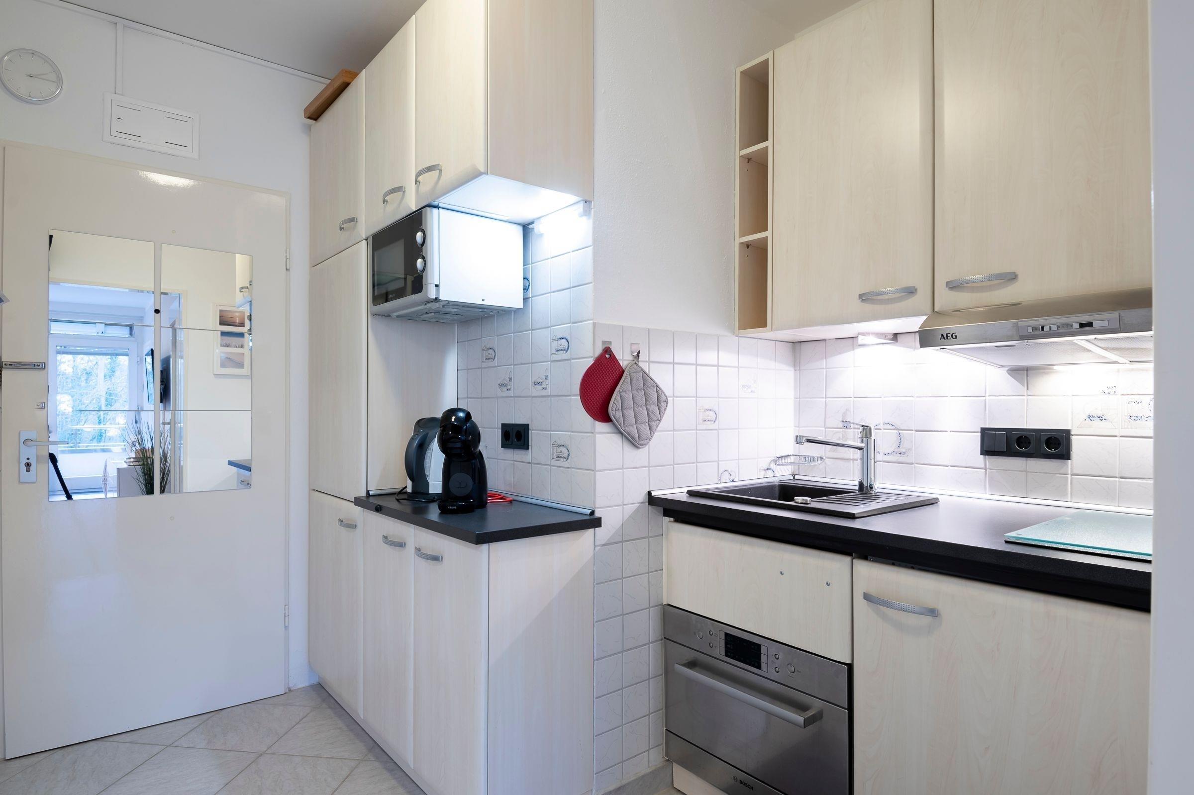 Bequem parken Sie Ihren PKW hinter dem Appartementhaus, jetzt sind es nur noch ein paar Schritte bis zu Ihrem Urlaubsdomizil. Mit dem Fahrstuhl oder über das Treppenhaus gelangen Sie in der Ferienwohnung. Sie öffnen die Wohnungstür und sind gleich in Ihrer modernen Küche. Die separate gut ausgestattete Küche lässt Sie problemlos kleinere Gerichte zuzubereiten. Hier sorgen Alltagshelfer wie Mikrowelle und Spülmaschine für gute Laune, zudem gibt es zusätzlich zur regulären Kaffeemaschine eine Kaffee-Kapselmaschine für frische Kaffeevariationen zum Frühstück. Das Duschbad liegt rechts neben dem Flur. Der Wohn- und Schlafbereich ist mit einem Schrankbett (für 1 Person), Sessel, Sofa und einen Essbereich eingerichtet. Von hier aus haben Sie einen Blick ins Grüne, können Ihr Frühstück auf dem Balkon genießen oder es sich an lauschigen Sommerabenden mit einem Buch gemütlich machen. In Ihrem Schlafzimmer erwartet Sie ein Doppelbett (160x200 cm), dort können Sie ungestört träumen. Verdunklungsplissees dunkeln das Schlafzimmer ausreichend ab.