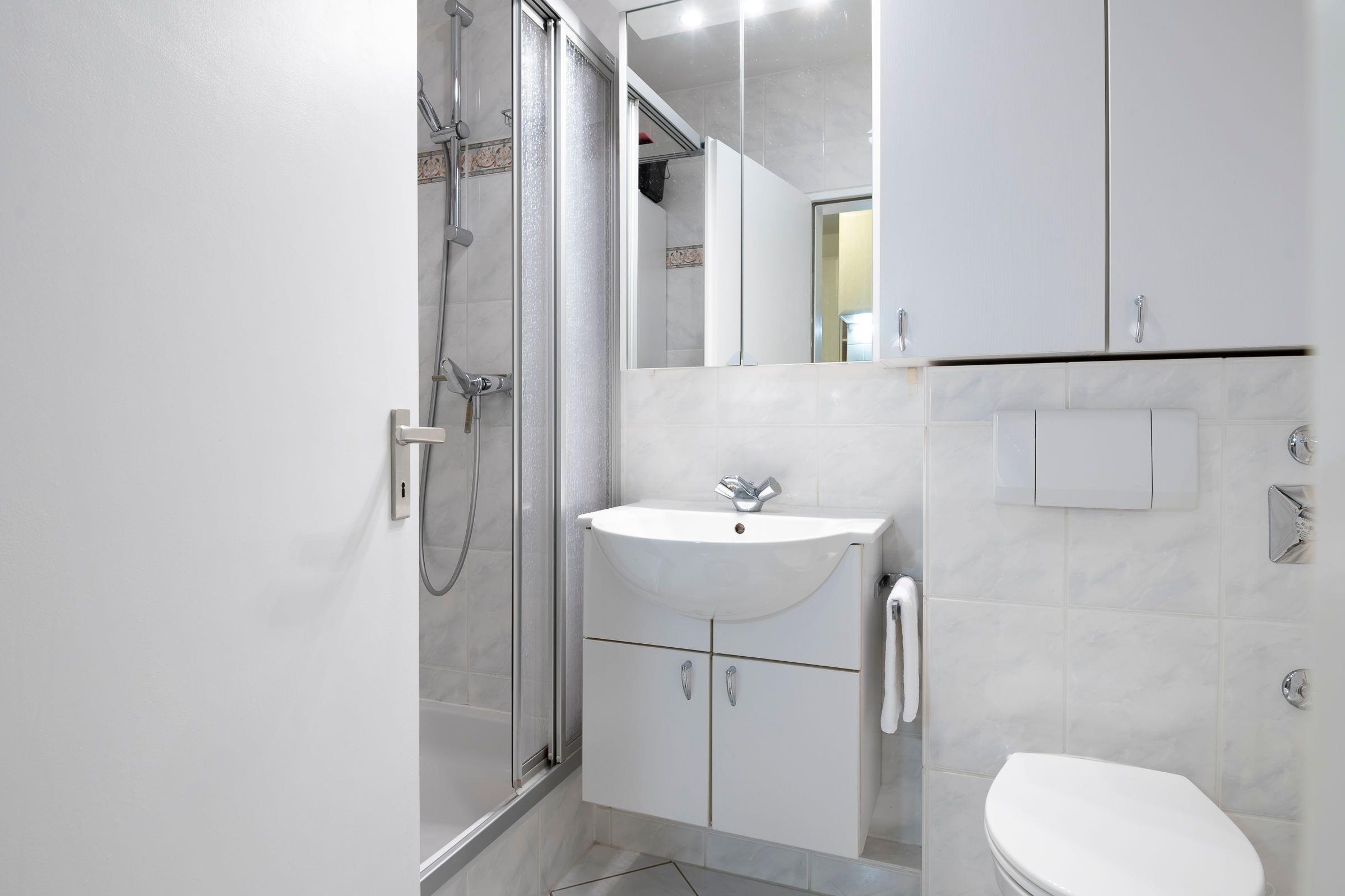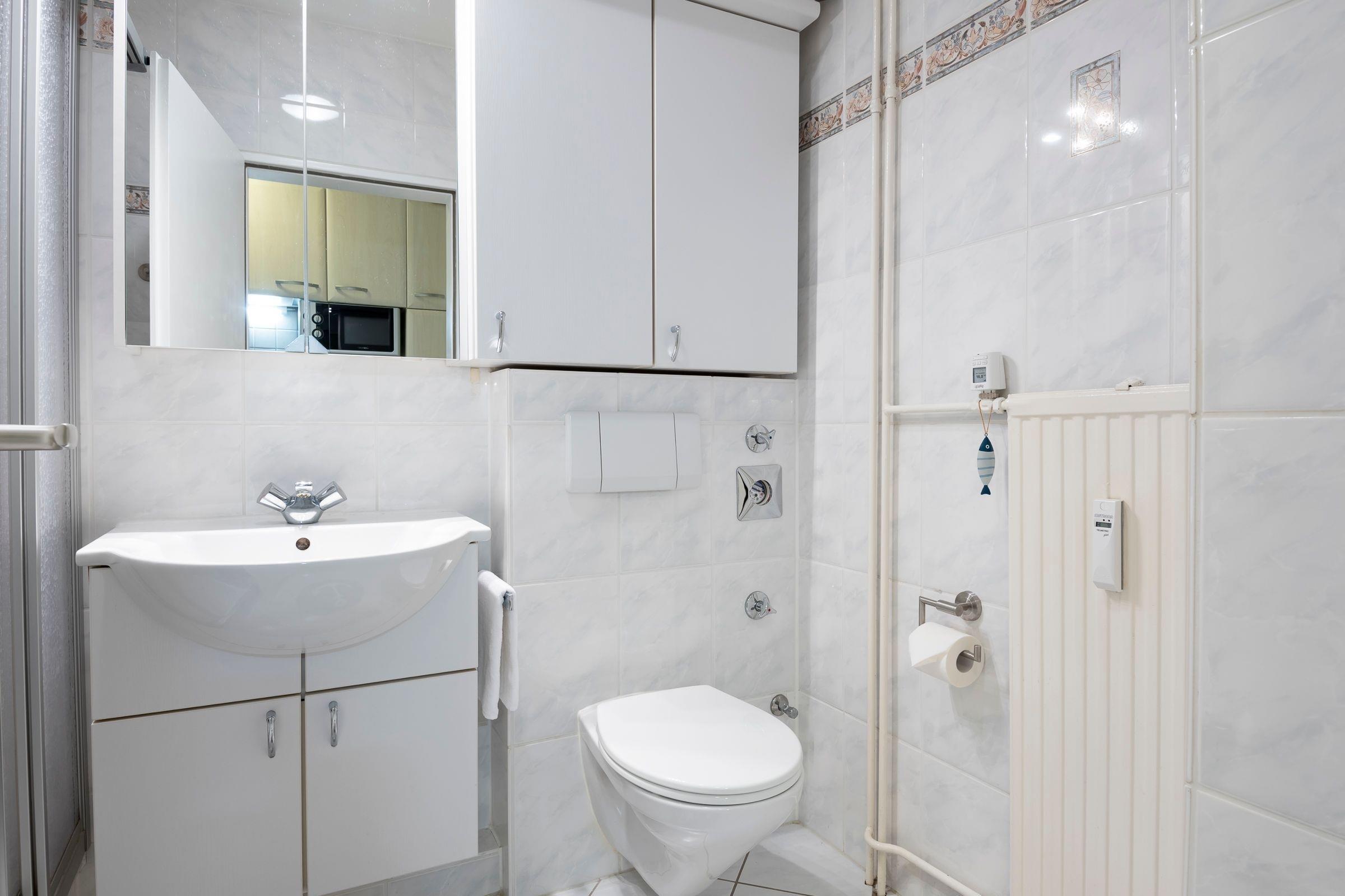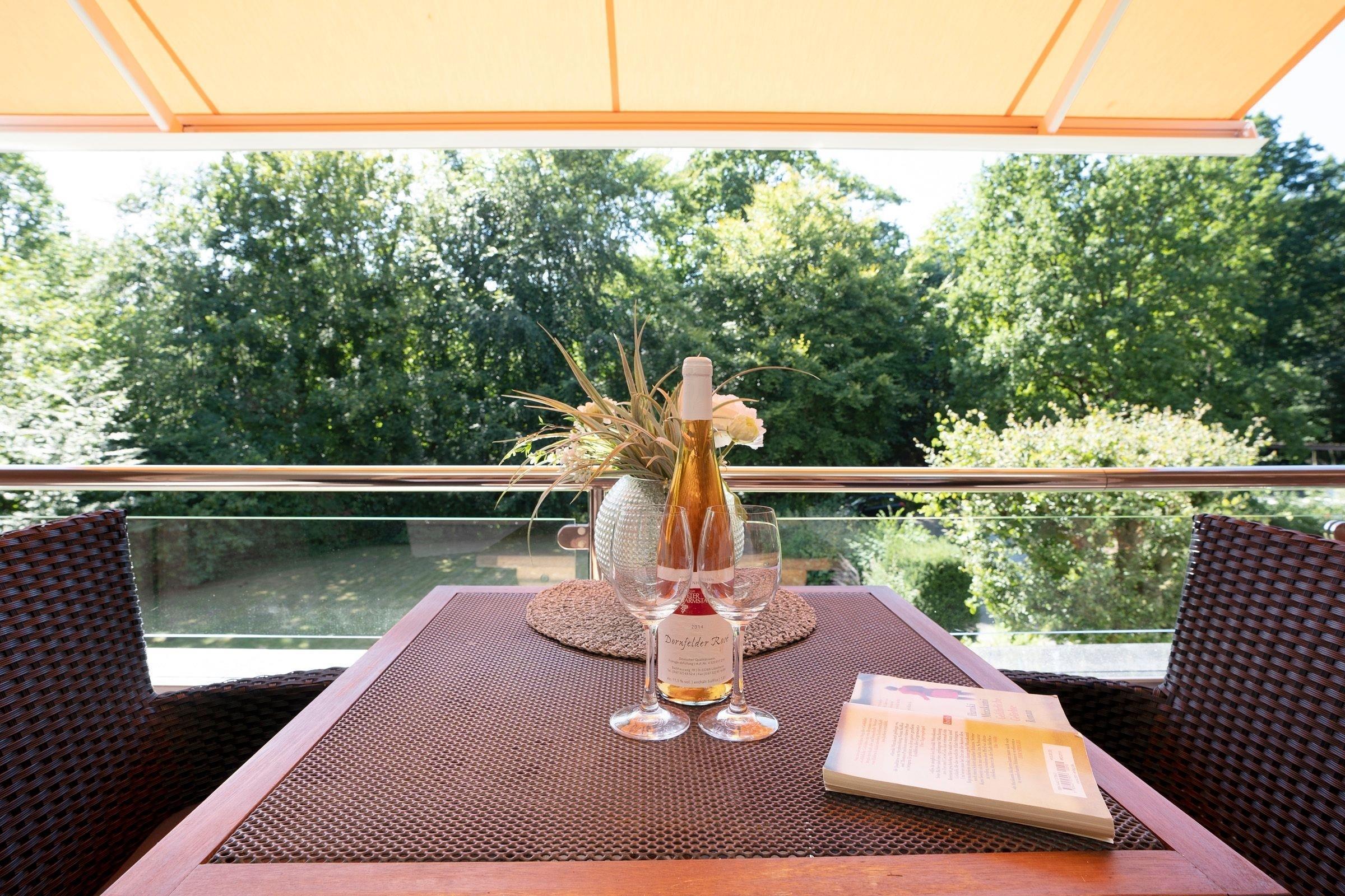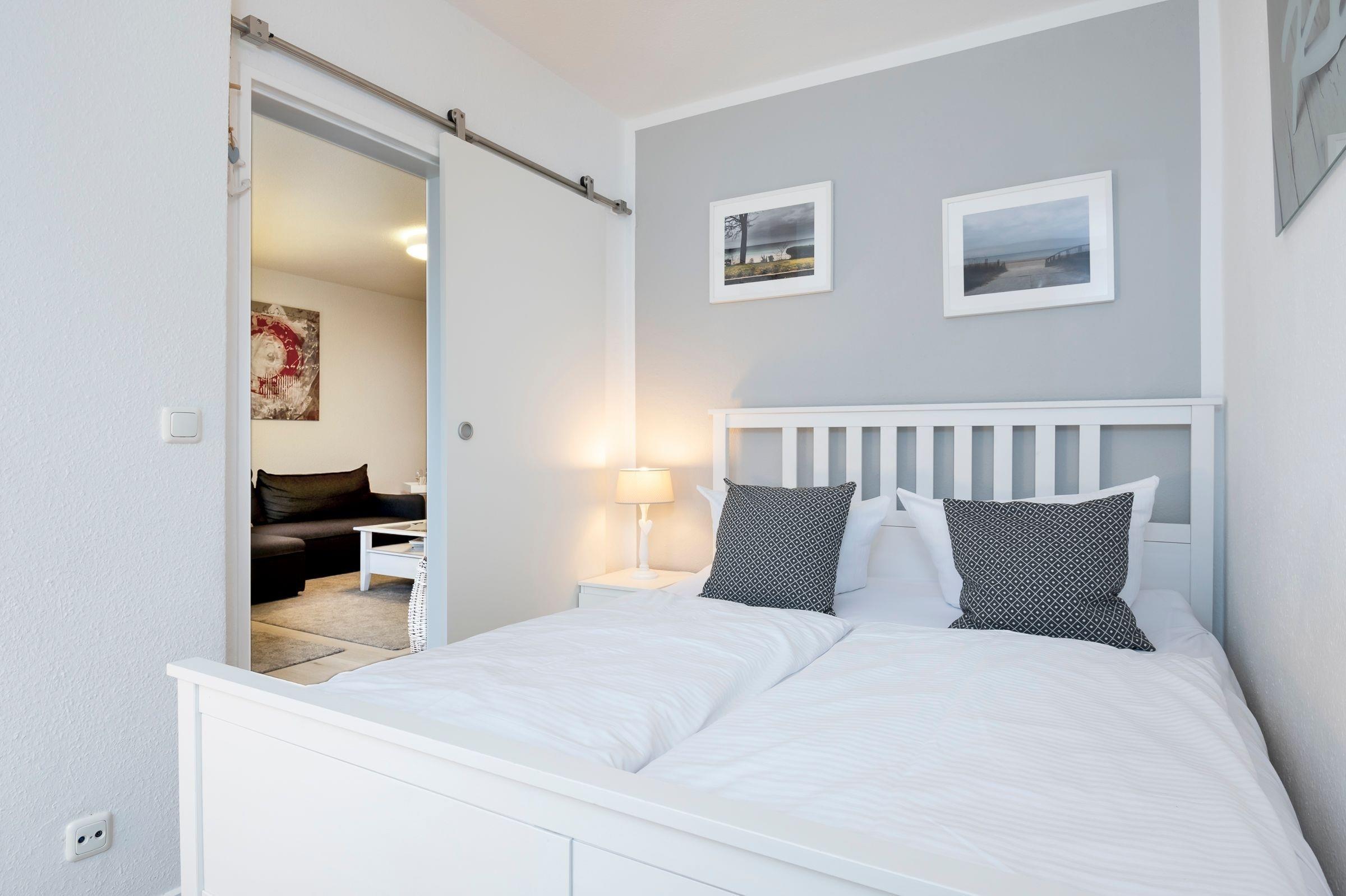 Bequem parken Sie Ihren PKW hinter dem Appartementhaus, jetzt sind es nur noch ein paar Schritte bis zu Ihrem Urlaubsdomizil. Mit dem Fahrstuhl oder über das Treppenhaus gelangen Sie in der Ferienwohnung. Sie öffnen die Wohnungstür und sind gleich in Ihrer modernen Küche. Die separate gut ausgestattete Küche lässt Sie problemlos kleinere Gerichte zuzubereiten. Hier sorgen Alltagshelfer wie Mikrowelle und Spülmaschine für gute Laune, zudem gibt es zusätzlich zur regulären Kaffeemaschine eine Kaffee-Kapselmaschine für frische Kaffeevariationen zum Frühstück. Das Duschbad liegt rechts neben dem Flur. Der Wohn- und Schlafbereich ist mit einem Schrankbett (für 1 Person), Sessel, Sofa und einen Essbereich eingerichtet. Von hier aus haben Sie einen Blick ins Grüne, können Ihr Frühstück auf dem Balkon genießen oder es sich an lauschigen Sommerabenden mit einem Buch gemütlich machen. In Ihrem Schlafzimmer erwartet Sie ein Doppelbett (160x200 cm), dort können Sie ungestört träumen. Verdunklungsplissees dunkeln das Schlafzimmer ausreichend ab.