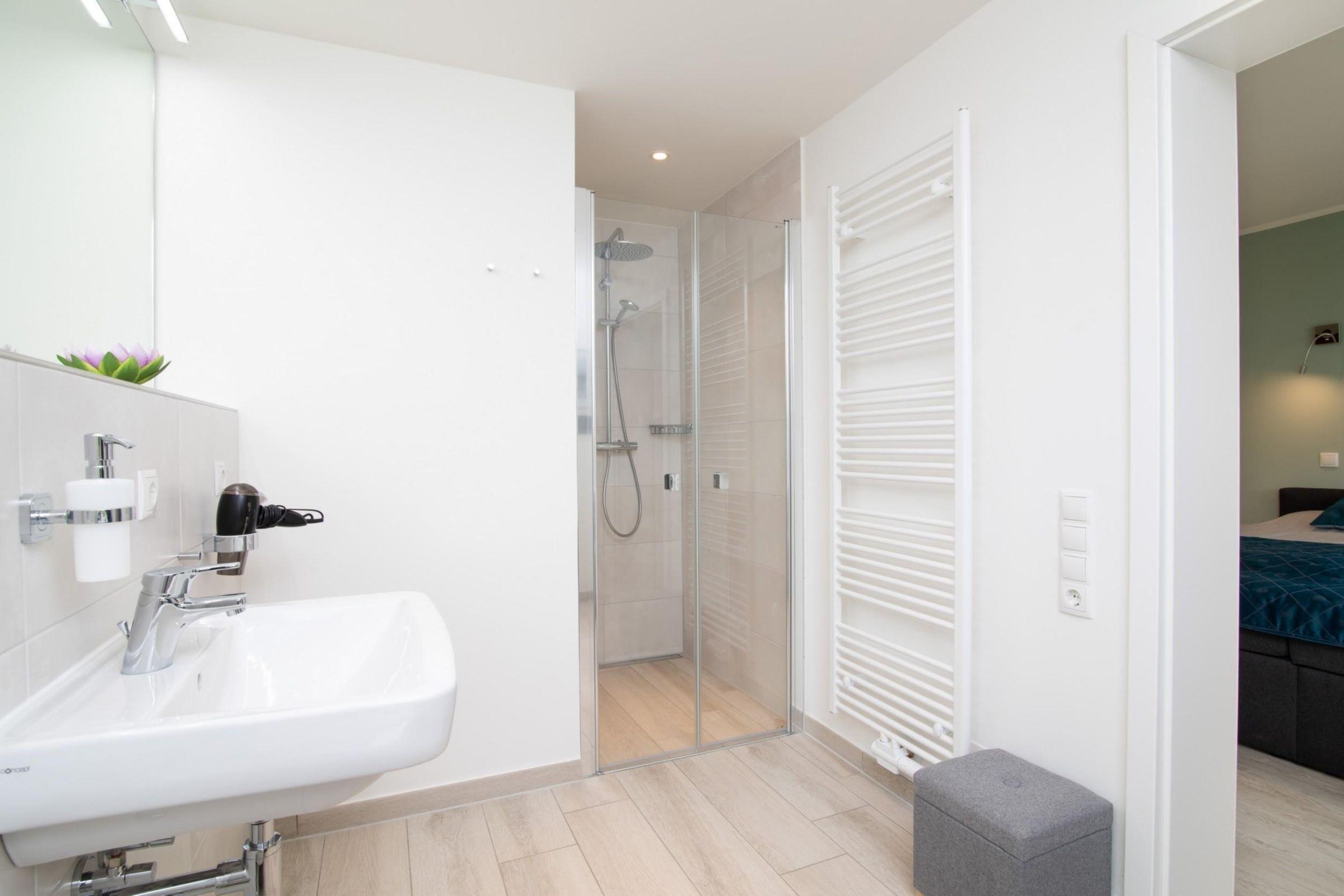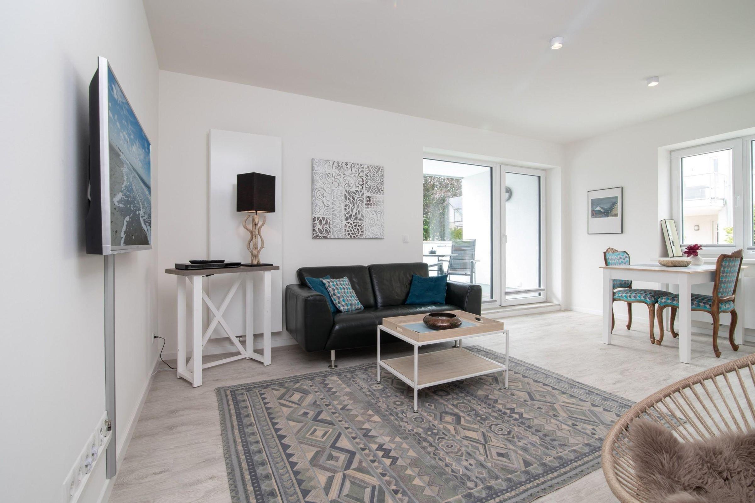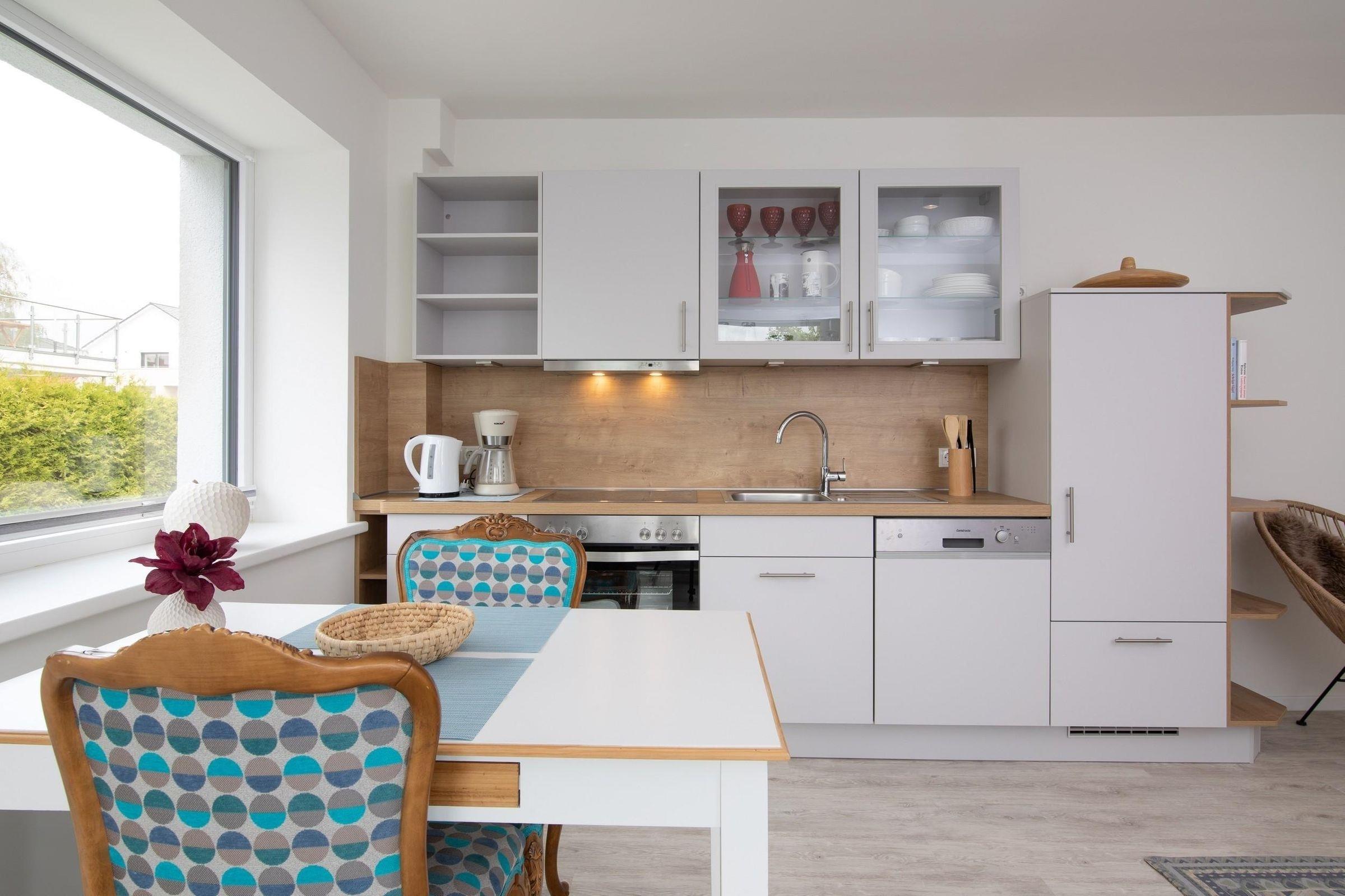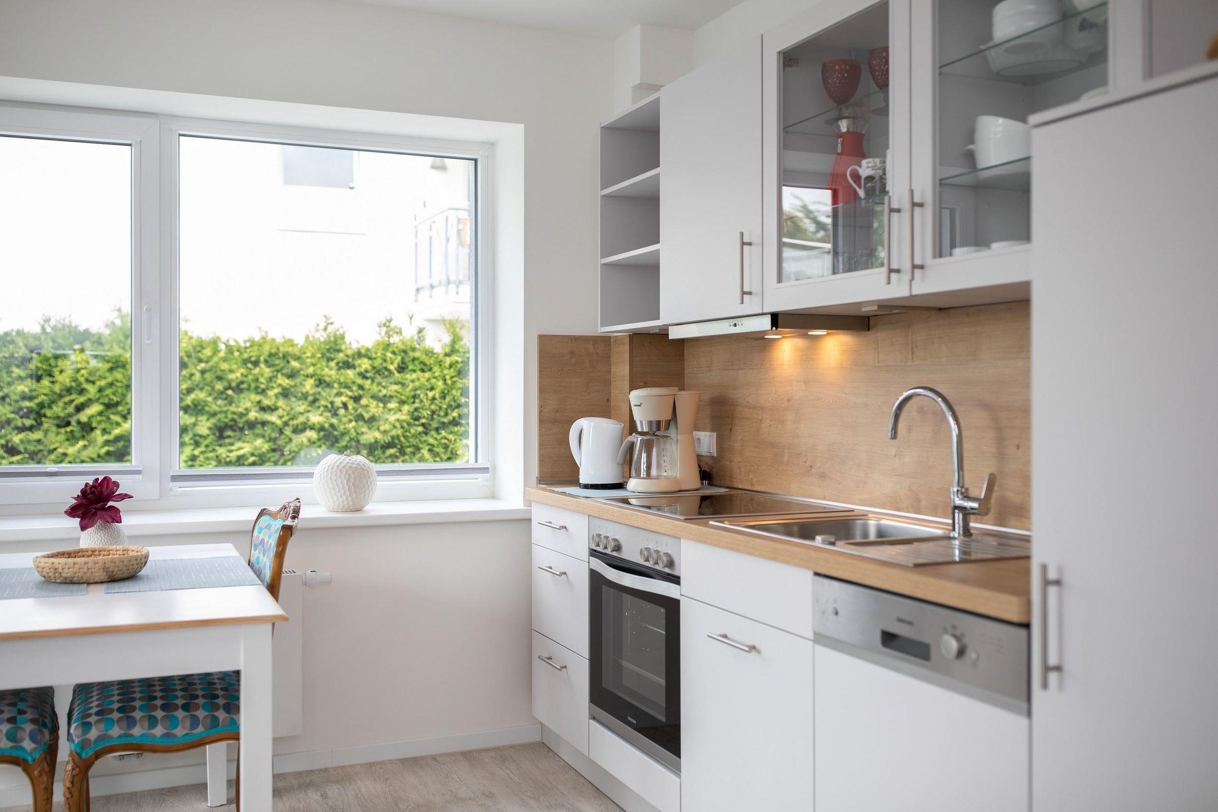 Ein separates Schlafzimmer mit komfortablem Boxspringbett (180x200cm) lädt zu erholsamen Stunden nach langen Strandtagen ein. Das stilvolle Designbad überzeugt mit Annehmlichkeiten wie bodentiefer Wellnessdusche, Schminkspiegel und Fußbodenheizung. In der offen gestalteten, gut ausgestatteten Küchen mit hochwertigen Alltagshelfern wie Backofen, Spülmaschine, Nespresso-Kapselmaschine sowie 4-Platten-Ceranfeld lassen sich im Handumdrehen leckere Ferienmahlzeiten zubereiten. Machen Sie es sich im lichtdurchfluteten Wohnbereich mit gemütlichem Sofa und Flat-TV bequem. Vom Wohnzimmer aus führt ein direkter Zugang zum überdachten, möblierten Balkon. Atmen Sie durch und genießen Sie den Blick ins Grüne – Ruhe, Entspannung und ein Hauch von Ostsee in der Ferne. Erholung pur!