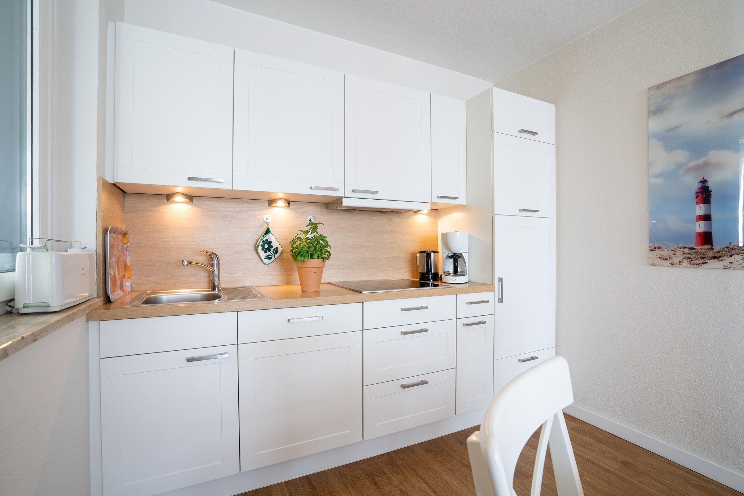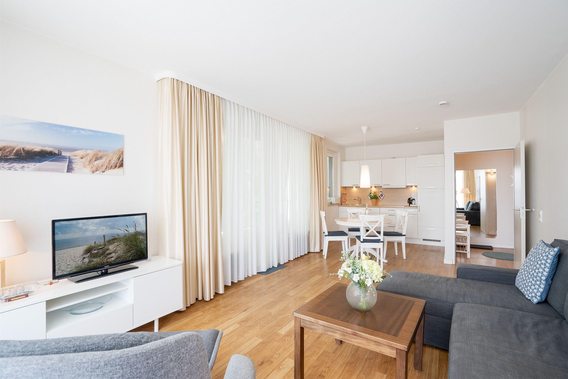 Auf einer Wohnfläche von ca. 54 m² begrüßt Sie diese gemütliche 2-Zimmer-Ferienwohnung mit offenem Wohn-/Schlafbereich und integrierter Küche, Duschbad, separatem Schlafzimmer und Balkon mit seitlichem Meerblick nur wenige Meter von der Ostsee entfernt. Bis zu 2 Erwachsene und 1 Kind finden hier bequem Platz.