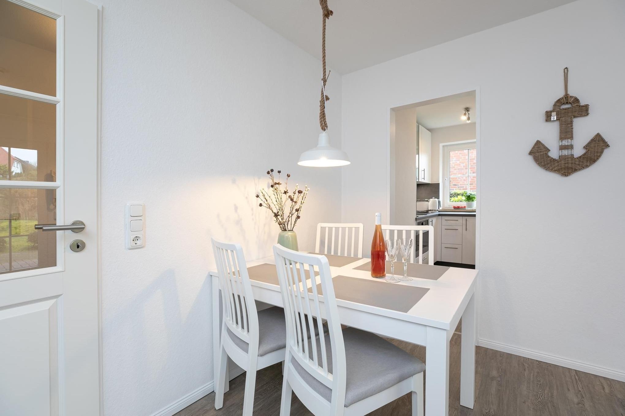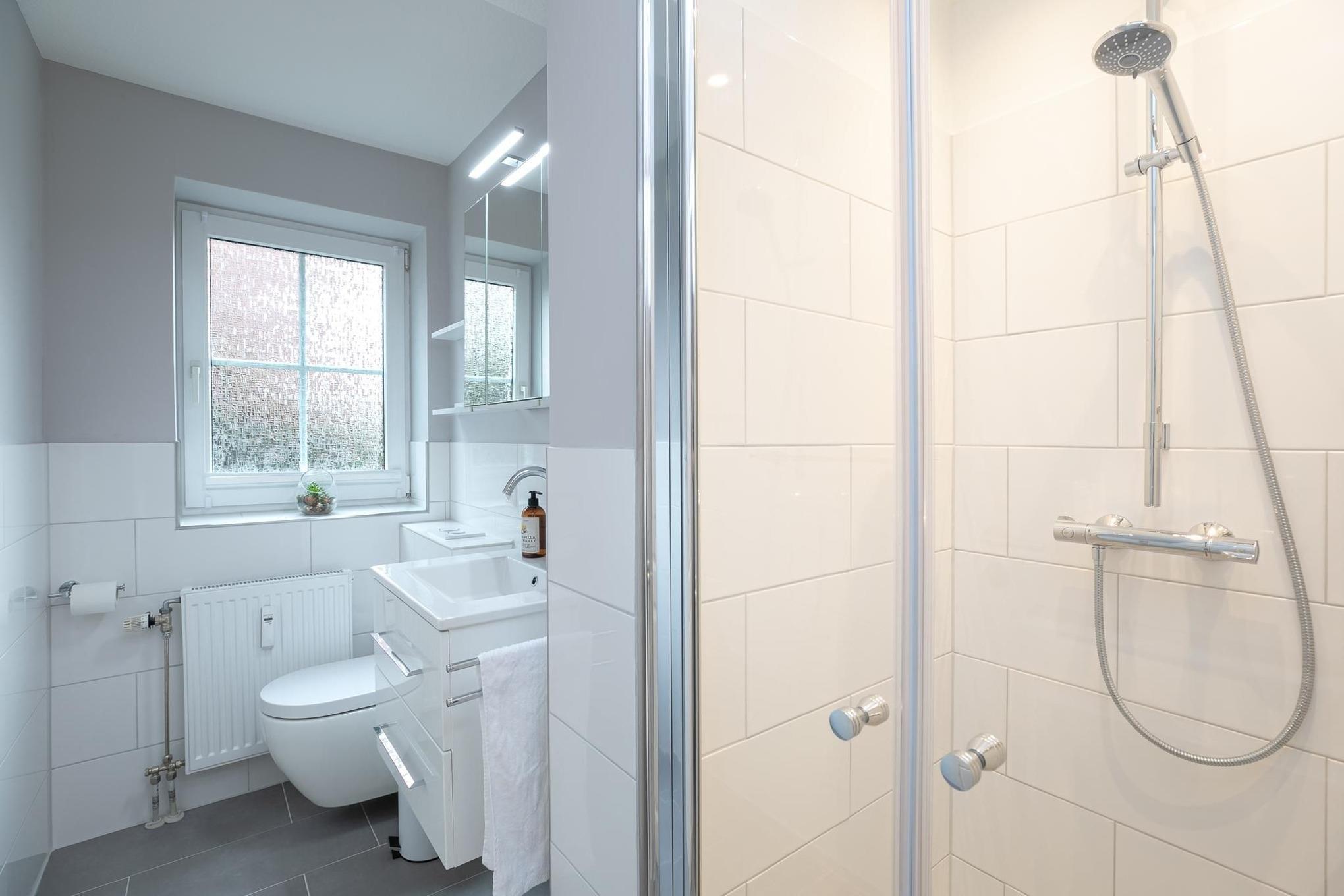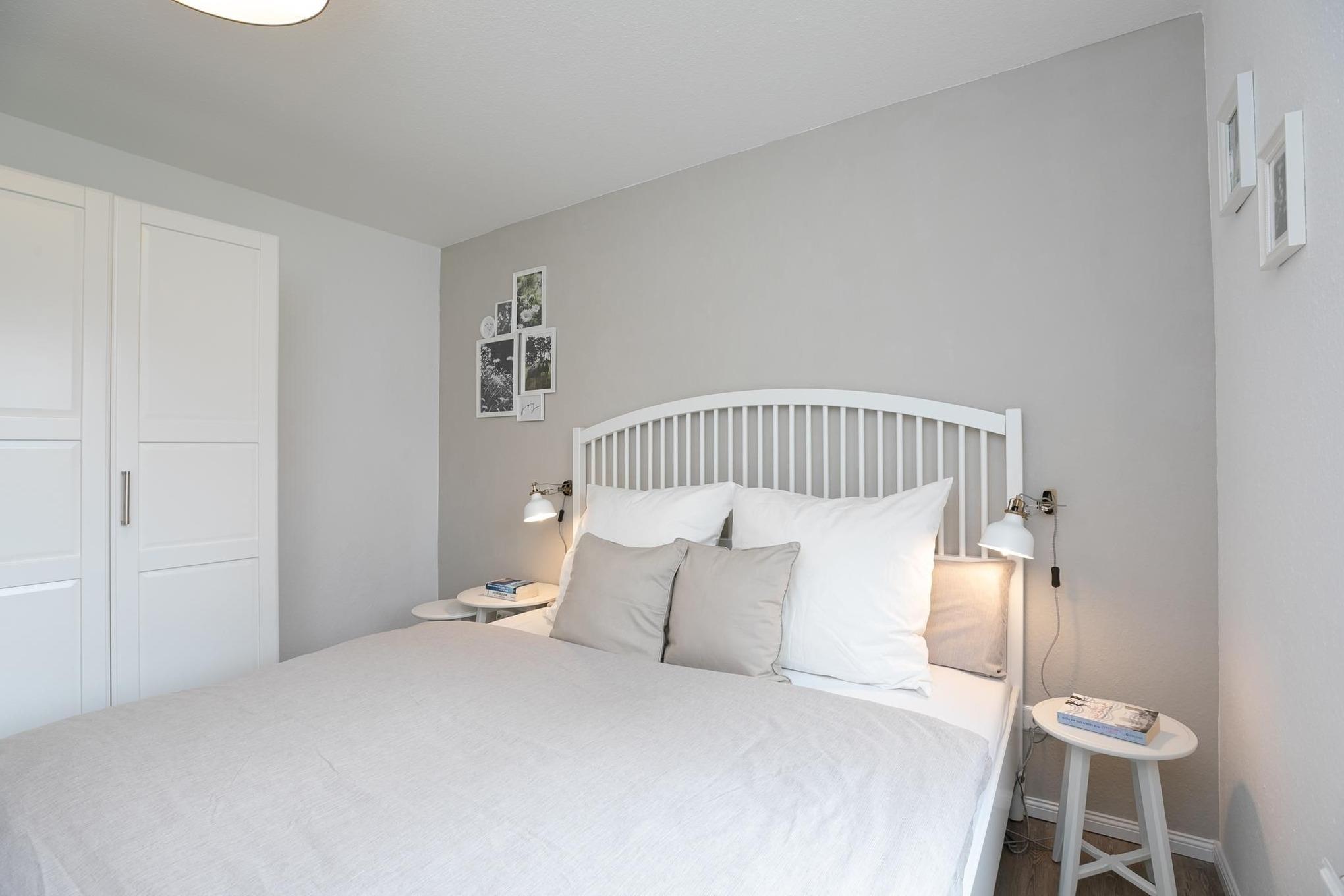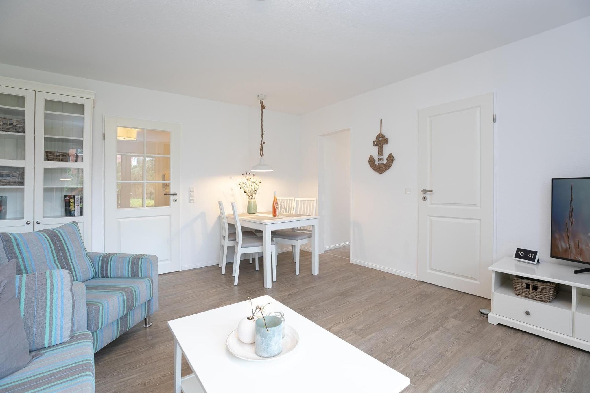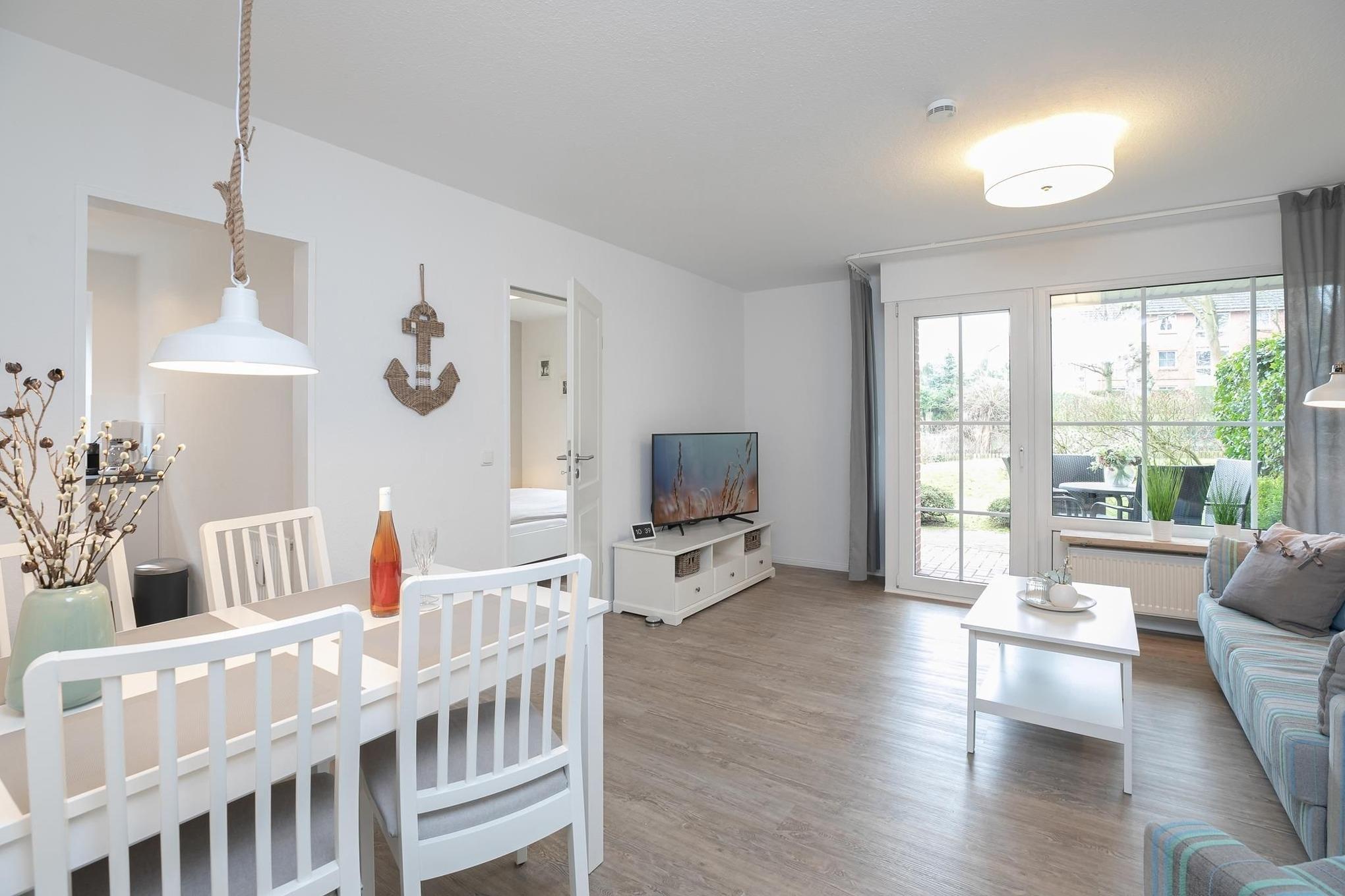 Das Wohnzimmer ist mit hochwertigem Schlafsofa (Liegefläche ca. 165x145 cm) und TV ausgestattet, Verdunklung ist vorhanden. Die offene Küche ist mit Alltagshelfern vom 2-Platten-Induktionsherd, Backofen, Mikrowelle, Kühlschrank mit Gefrierfach, bis zur Kaffee- sowie Nespresso Kapselmaschine super ausgestattet. Im separaten Schlafzimmer sorgt ein komfortables Doppelbett (2x 90x200 cm) für entspannte Nächte, ein Kleiderschrank nimmt Ihre Urlaubsgarderobe auf, Plissées sorgen für angenehme Verdunklung. Das tageslichthelle Duschbad sorgt mit Annehmlichkeiten wie bodentiefer Dusche und Fön für gute Laune. Genießen Sie schöne Stunden an der frischen Ostseeluft auf der eigenen möblierten Terrasse, ob morgens mit dem ersten Kaffee oder am Abend mit einem guten Buch, so fühlt sich Urlaub an!
