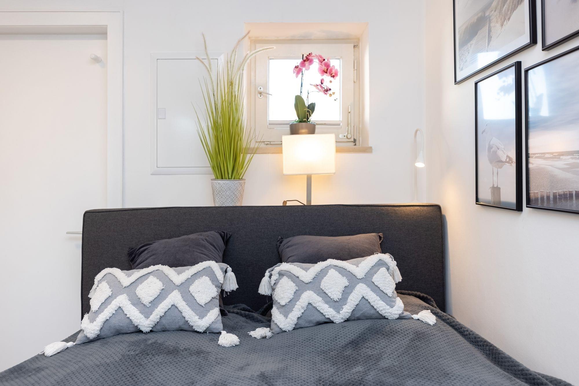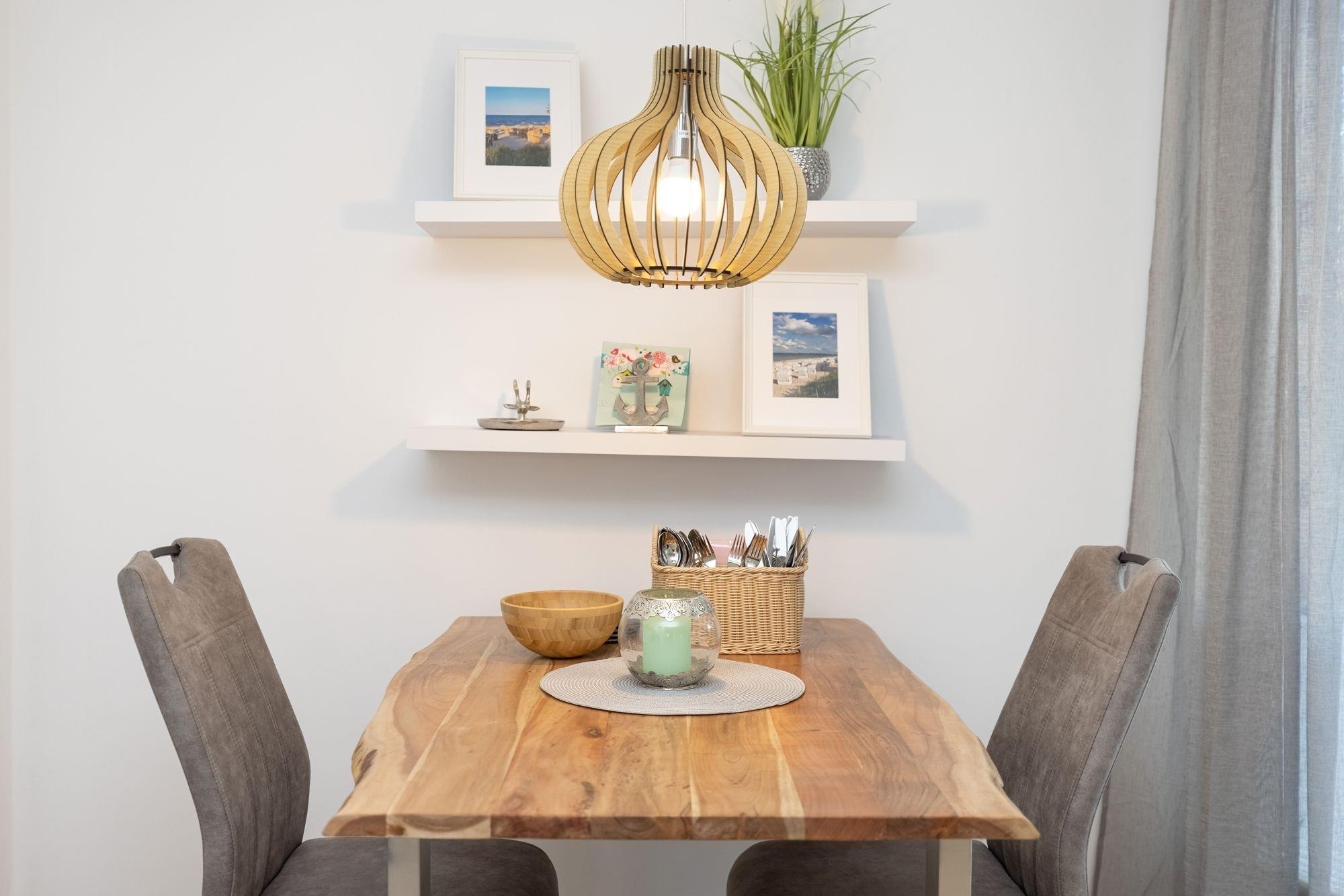 Der offene Wohn-/Koch- und Schlafbereich ist liebevoll eingerichtet. Ein gemütliches Sofa lädt sowohl zum Kuscheln vor dem Fernseher, als auch zum Schlafen ein, denn in nur wenigen Handgriffen verwandeln Sie es in eine bequeme Schlafstätte (ca. 140x200 cm). Im komfortablen Boxspringbett (160x200 cm) ruhen Sie sich nach langen Strandspaziergängen aus. In der Küchenzeile bereiten Sie sich mühelos ein leckeres Frühstück zu und auch einfache Gerichte sind schnell gezaubert. Genießen Sie die gemeinsamen Mahlzeiten am Esstisch oder direkt auf dem möblierten Balkon mit seitlichem Meerblick - hier können Sie tief durchatmen und von dem beruhigenden Rauschen der Wellen den Alltag vergessen. Abgerundet wird diese tolle Ferienwohnung durch das schöne Tageslichtduschbad.