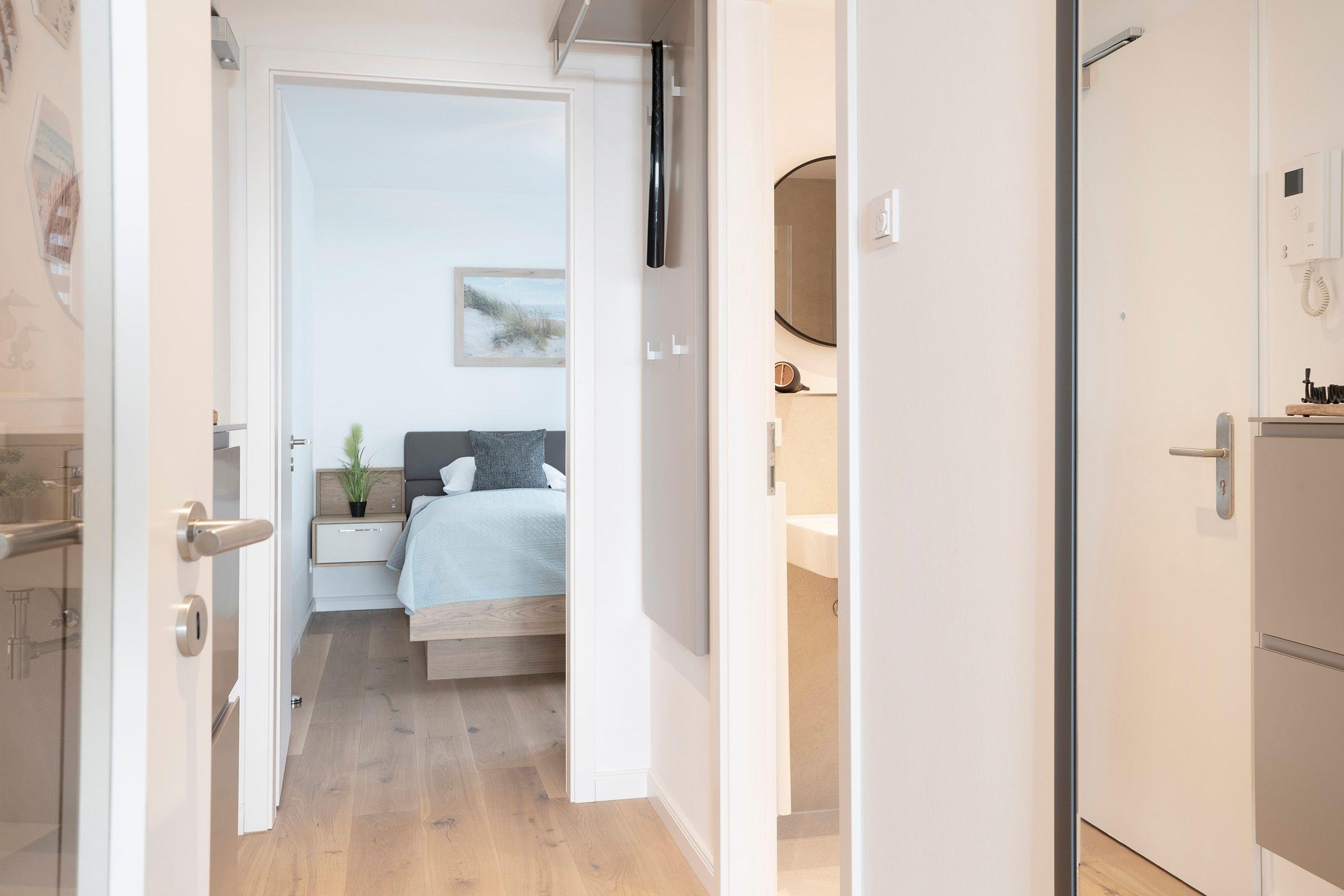Durch die großen Fensterfronten ist das Wohnzimmer hell und gemütlich. Von hier haben Sie Zugang zum möblierten ca. 15m² großen Balkon mit herrlichem Blick auf die Ostsee. Die offene Küche ist sehr gut ausgestattet, um ein leckeres Essen zuzubereiten. Der Esstisch bietet genug Platz für bis zu 4 Personen. Für erholsame Nächte ziehen Sie sich in das separate Schlafzimmer zurück, es erwartet Sie ein komfortables Doppelbett (2x 90x200 cm) sowie ein Kleiderschrank. Die kleinen Gäste können es sich auf dem Schlafsofa bequem machen (Liegefläche 140x240 cm), beide Schlafzimmer lassen sich angenehm verdunkeln. Das moderne Badezimmer unterstreicht die geschmackvolle Ausstattung dieser tollen Ferienwohnung.