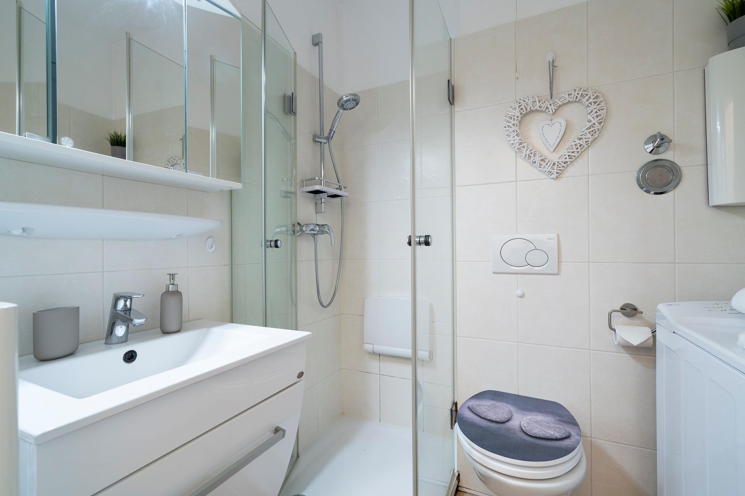 Die ca. 41 m² große Wohnung begrüßt Sie mit maritimem Flair. Im offenen, lichtdurchfluteten Wohn-, Ess- und Kochbereich erwarten Sie ein kuscheliges Sofa, das sich abends mit wenigen Handgriffen in eine komfortable Schlafstätte (135x180 cm) verwandeln lässt, sowie ein Esstisch und eine modern ausgestattete Küche. Durch die große Fensterfront mit Schiebetür gelangen Sie auf die Terrasse mit kleinem Garten, die an lauschigen Sommerabenden zu einem guten Glas Wein einlädt. Im Schlafzimmer finden Sie im Doppelbett (2x 80x200 cm) Ruhe und Erholung und starten nach einer erfrischenden Dusche im angrenzenden Bad am Morgen ausgeruht in den neuen Urlaubstag. Gleich 2 Smart-TVs in Wohn- & Schlafzimmer sorgen für ausreichende Unterhaltung. Der Smart-TV im Schlafzimmer besitzt keinen TV-Anschluss und kann zur Selbstanmeldung bei Streaming-Diensten genutzt werden.
