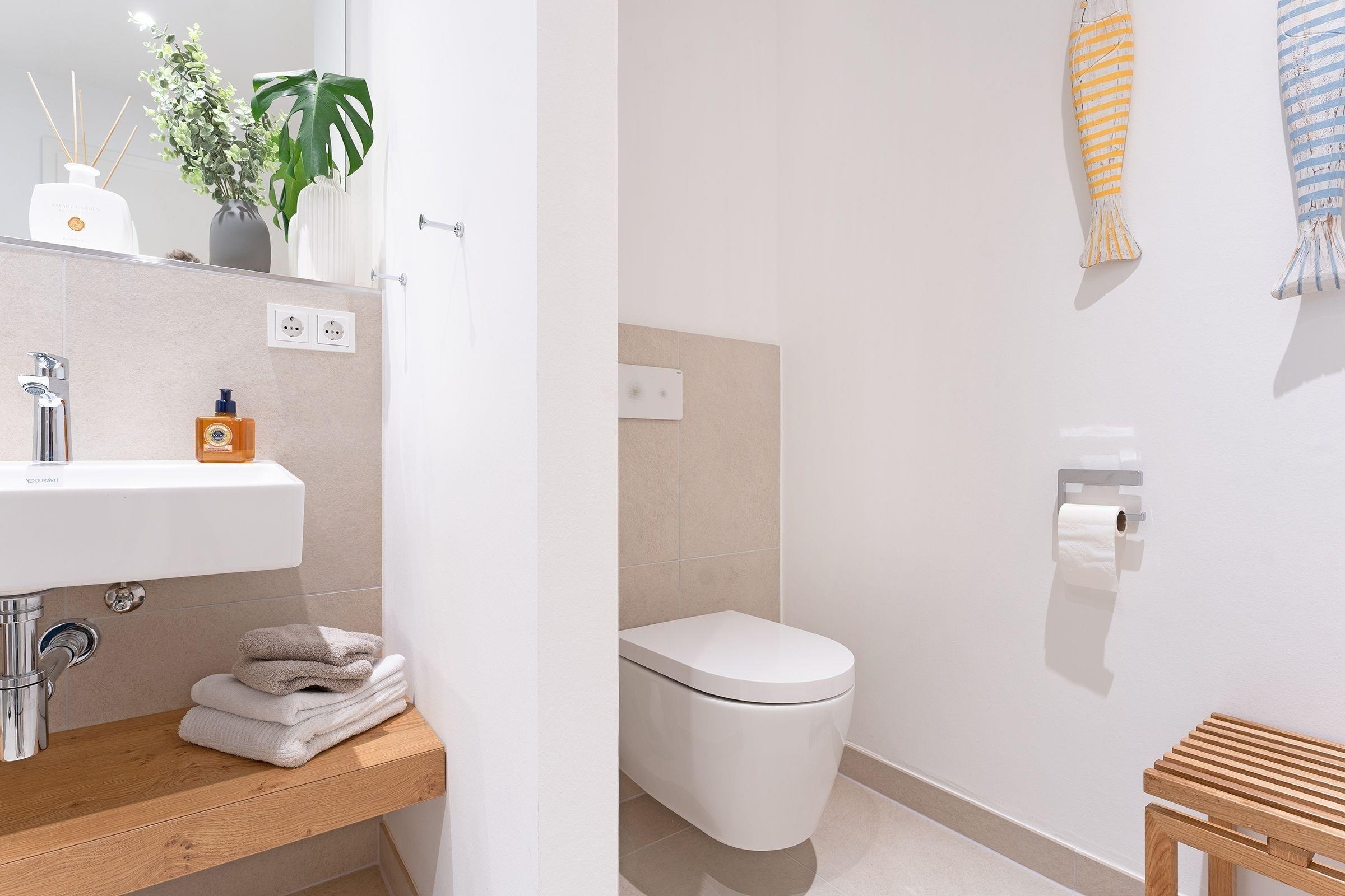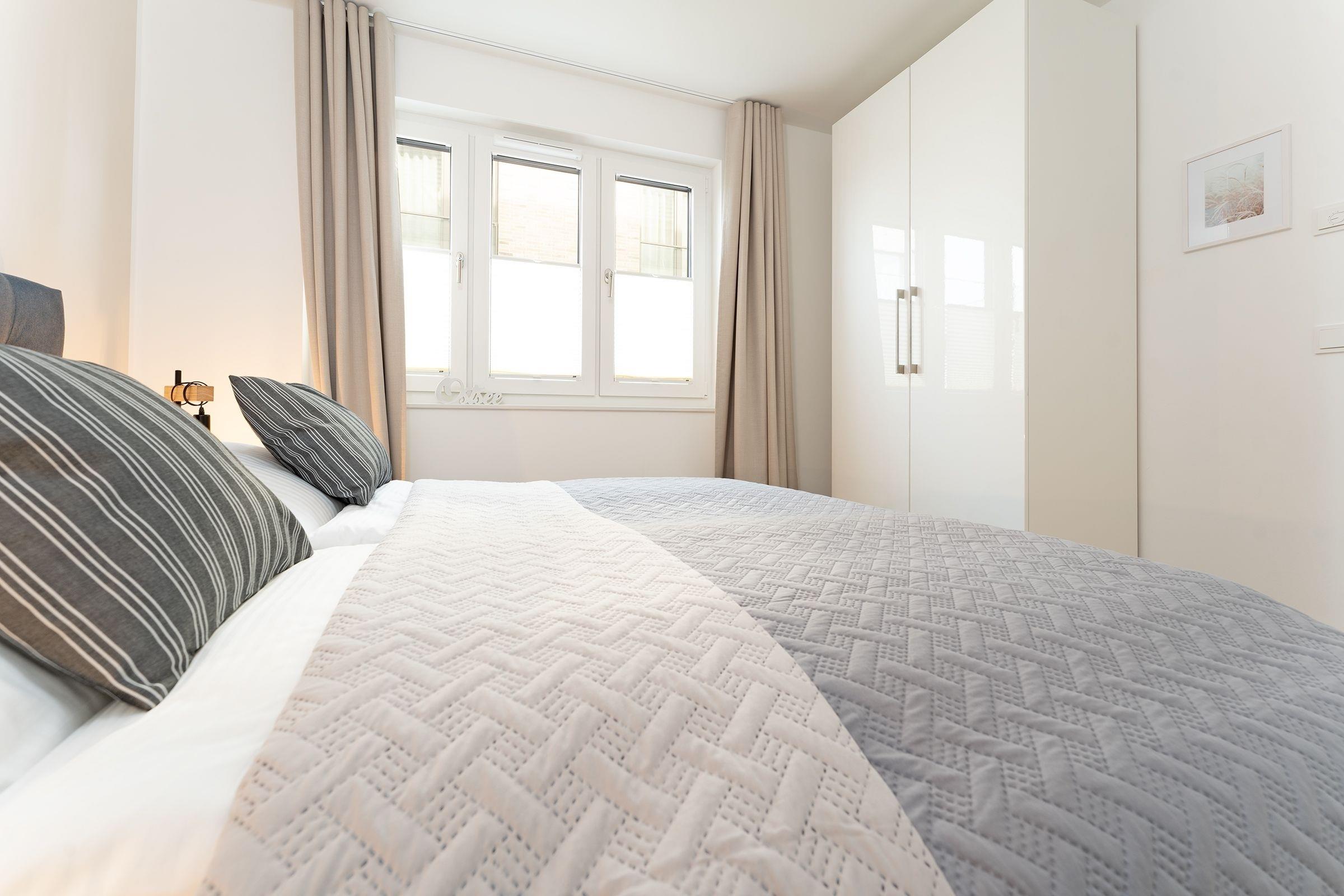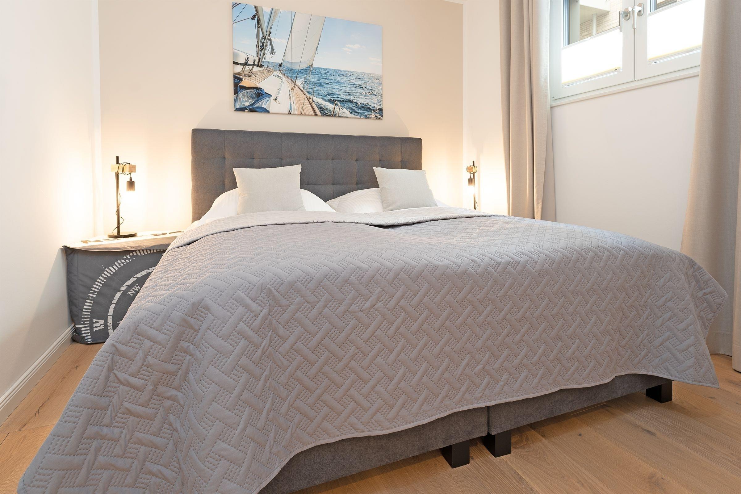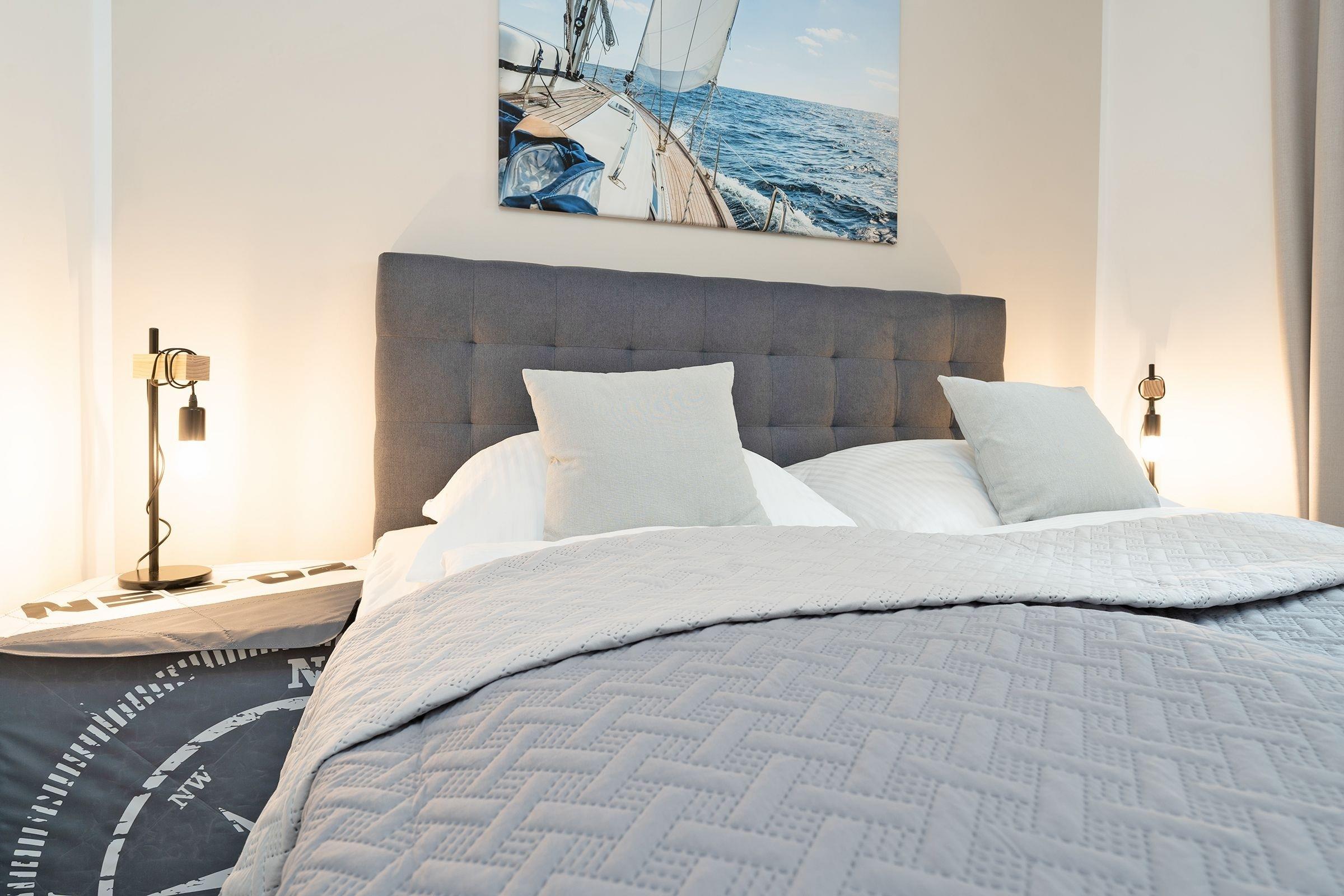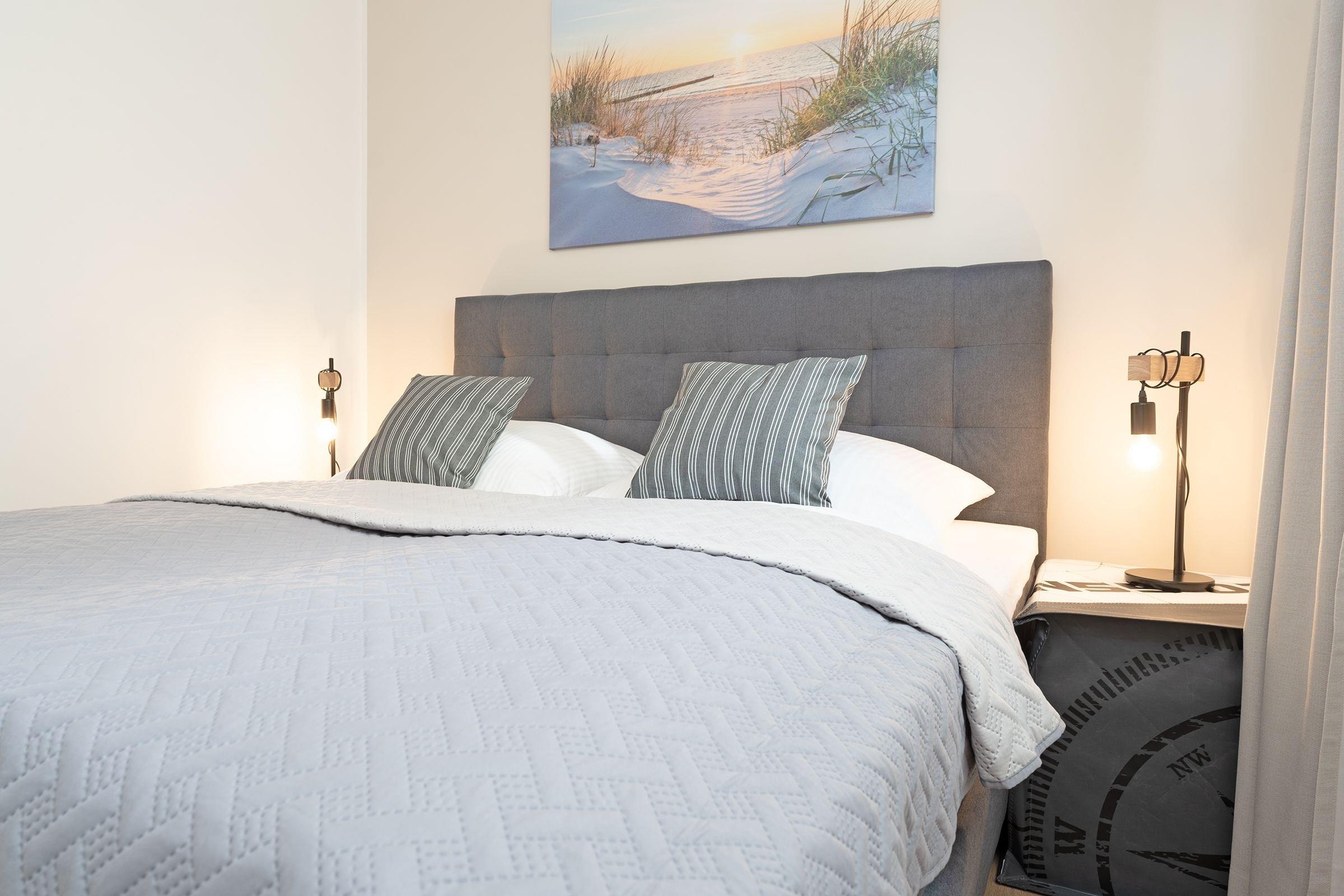 Hell, modern und in maritimem Chic empfängt Sie der offene Wohnbereich mit gemütlicher Couch, die bei Bedarf in einen weiteren Schlafplatz (120x230 cm) verwandelt werden kann. In der hochwertigen Küche, die mit allen Annehmlichkeiten ausgestattet ist, bereitet Ihnen das Zubereiten der Mahlzeiten bestimmt besonders viel Freude. Nehmen Sie Platz am großzügigen Esstisch und planen Sie gemeinsam den kommenden Urlaubstag. Genießen Sie zahlreiche Sonnenstunden auf der möblierten Terrasse und machen Sie es sich im windgeschützten Strandkorb gemütlich - untermalt vom Rauschen der Ostsee. Im Erdgeschoss befindet sich neben dem Gäste-WC außerdem eines der beiden Schlafzimmer, das Sie mit einem luxuriösen Boxspringbett (ca. 180x200cm) empfängt. Das zweite Schlafzimmer mit Bad en Suite erwartet Sie im Souterrain, ebenfalls mit einem großen Boxspringbett (ca. 180x200cm). Das Badezimmer mit ebenerdiger Dusche und Doppelwaschtisch vermittelt Wellness-Feeling. Zur Nacht lassen sich alle Zimmer angenehm abdunkeln.