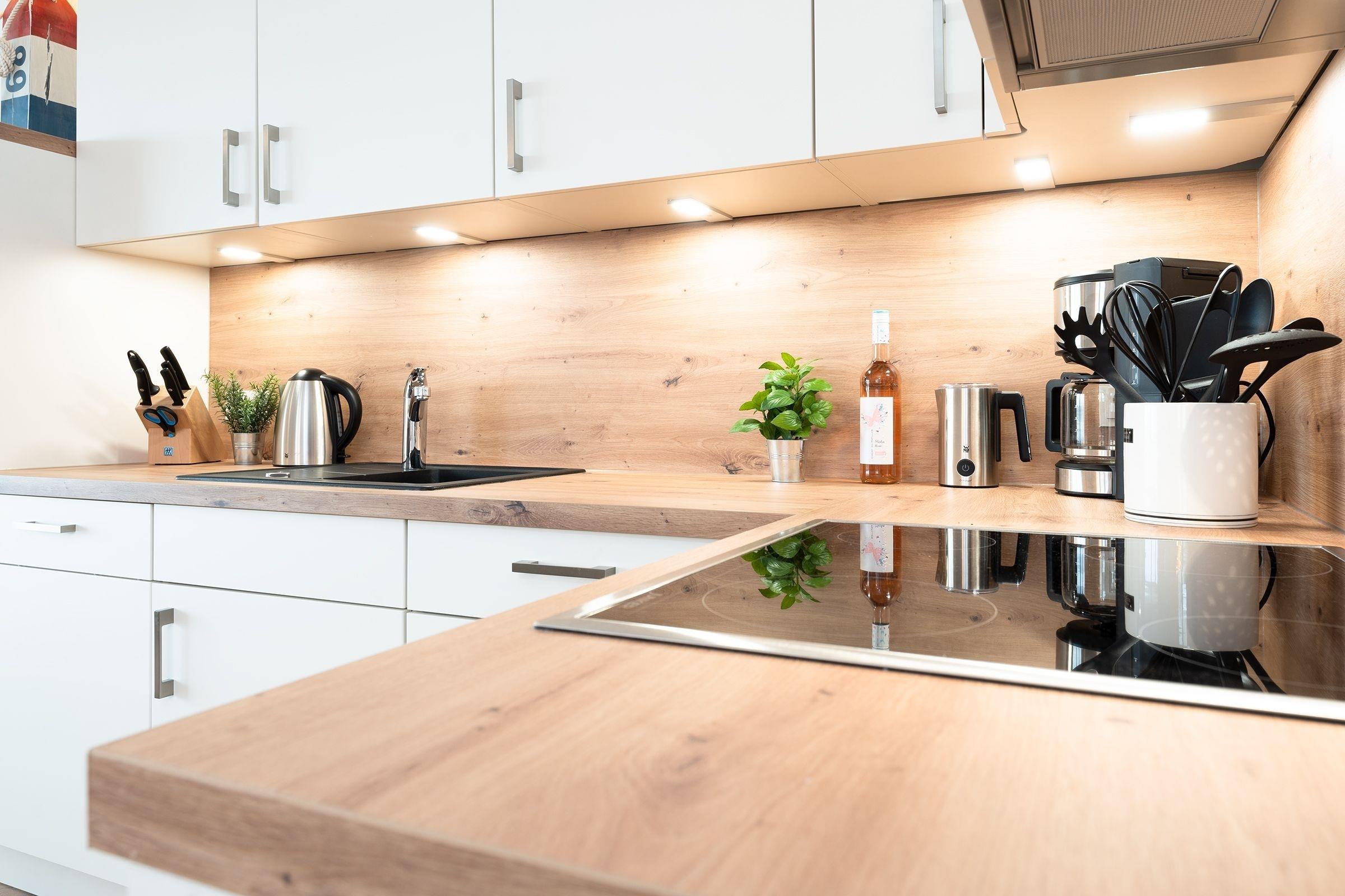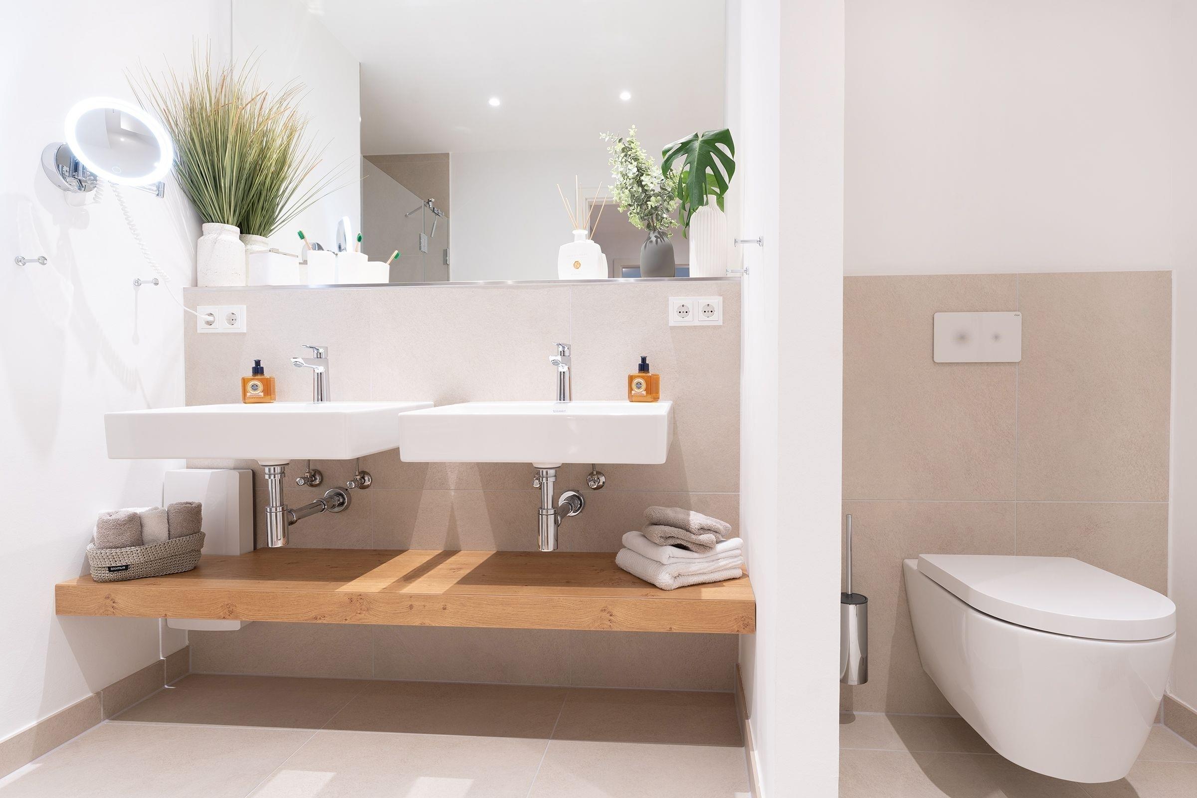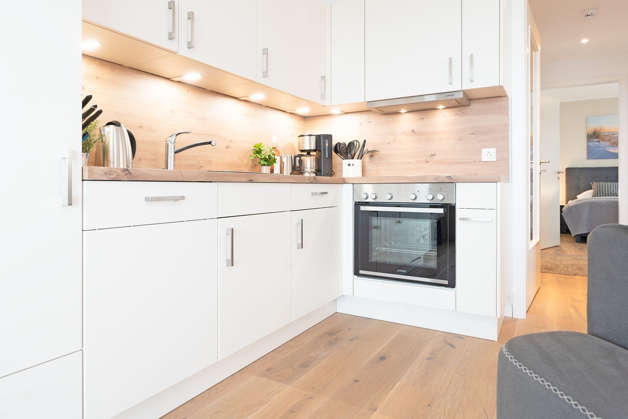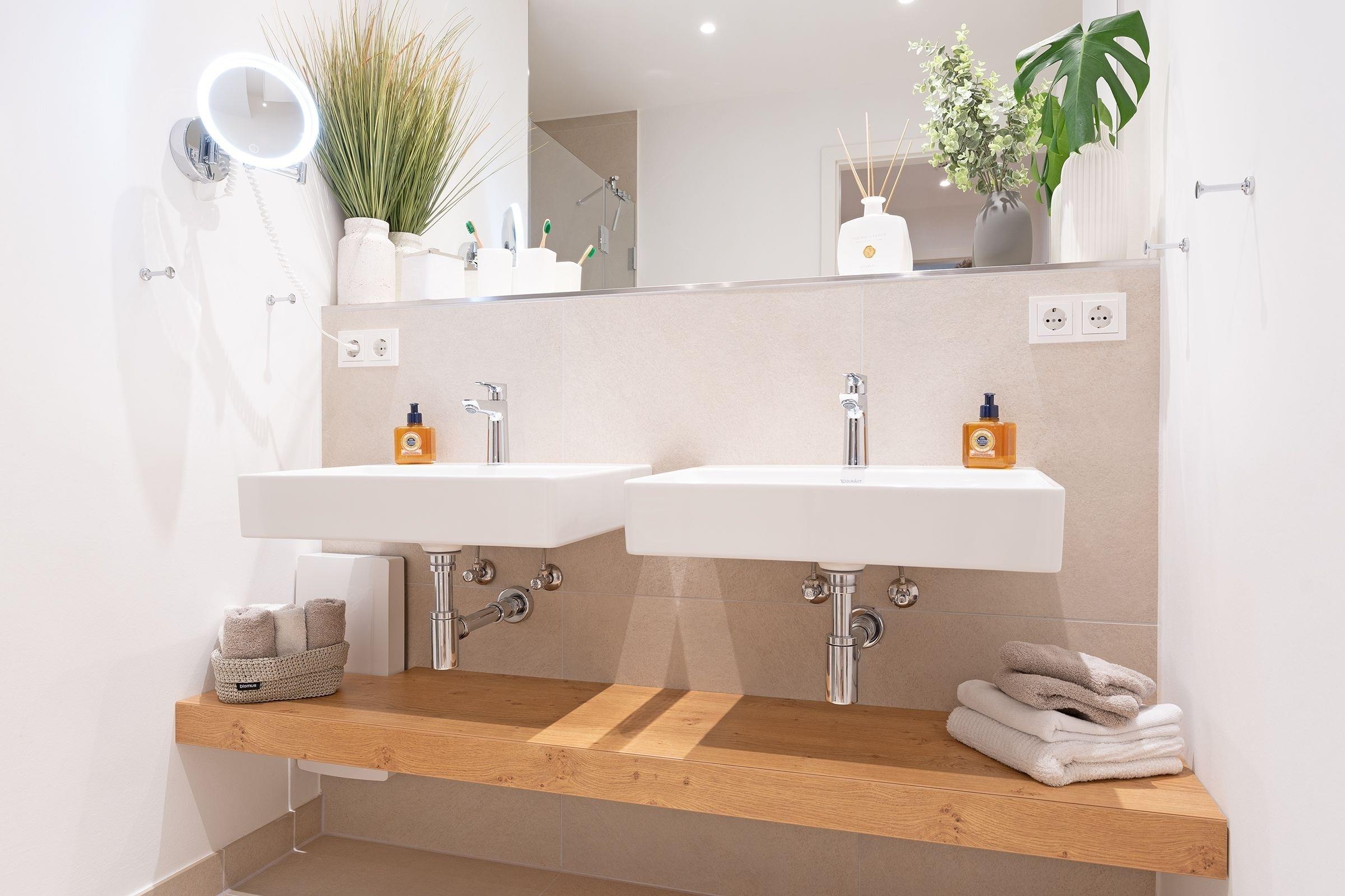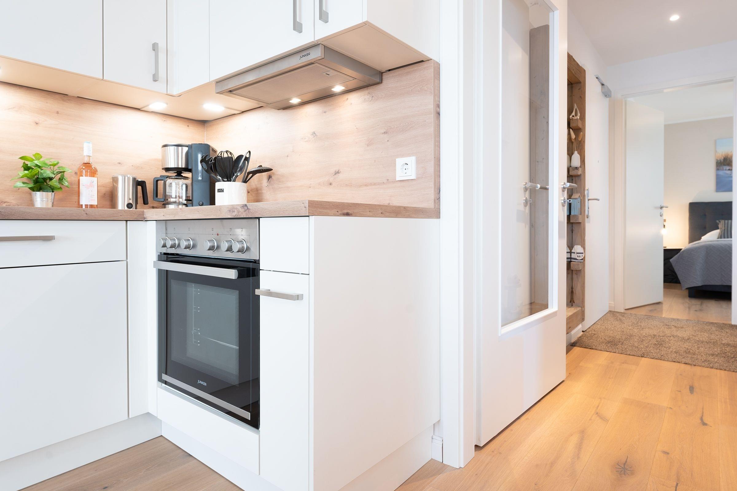 Hell, modern und in maritimem Chic empfängt Sie der offene Wohnbereich mit gemütlicher Couch, die bei Bedarf in einen weiteren Schlafplatz (120x230 cm) verwandelt werden kann. In der hochwertigen Küche, die mit allen Annehmlichkeiten ausgestattet ist, bereitet Ihnen das Zubereiten der Mahlzeiten bestimmt besonders viel Freude. Nehmen Sie Platz am großzügigen Esstisch und planen Sie gemeinsam den kommenden Urlaubstag. Genießen Sie zahlreiche Sonnenstunden auf der möblierten Terrasse und machen Sie es sich im windgeschützten Strandkorb gemütlich - untermalt vom Rauschen der Ostsee. Im Erdgeschoss befindet sich neben dem Gäste-WC außerdem eines der beiden Schlafzimmer, das Sie mit einem luxuriösen Boxspringbett (ca. 180x200cm) empfängt. Das zweite Schlafzimmer mit Bad en Suite erwartet Sie im Souterrain, ebenfalls mit einem großen Boxspringbett (ca. 180x200cm). Das Badezimmer mit ebenerdiger Dusche und Doppelwaschtisch vermittelt Wellness-Feeling. Zur Nacht lassen sich alle Zimmer angenehm abdunkeln.