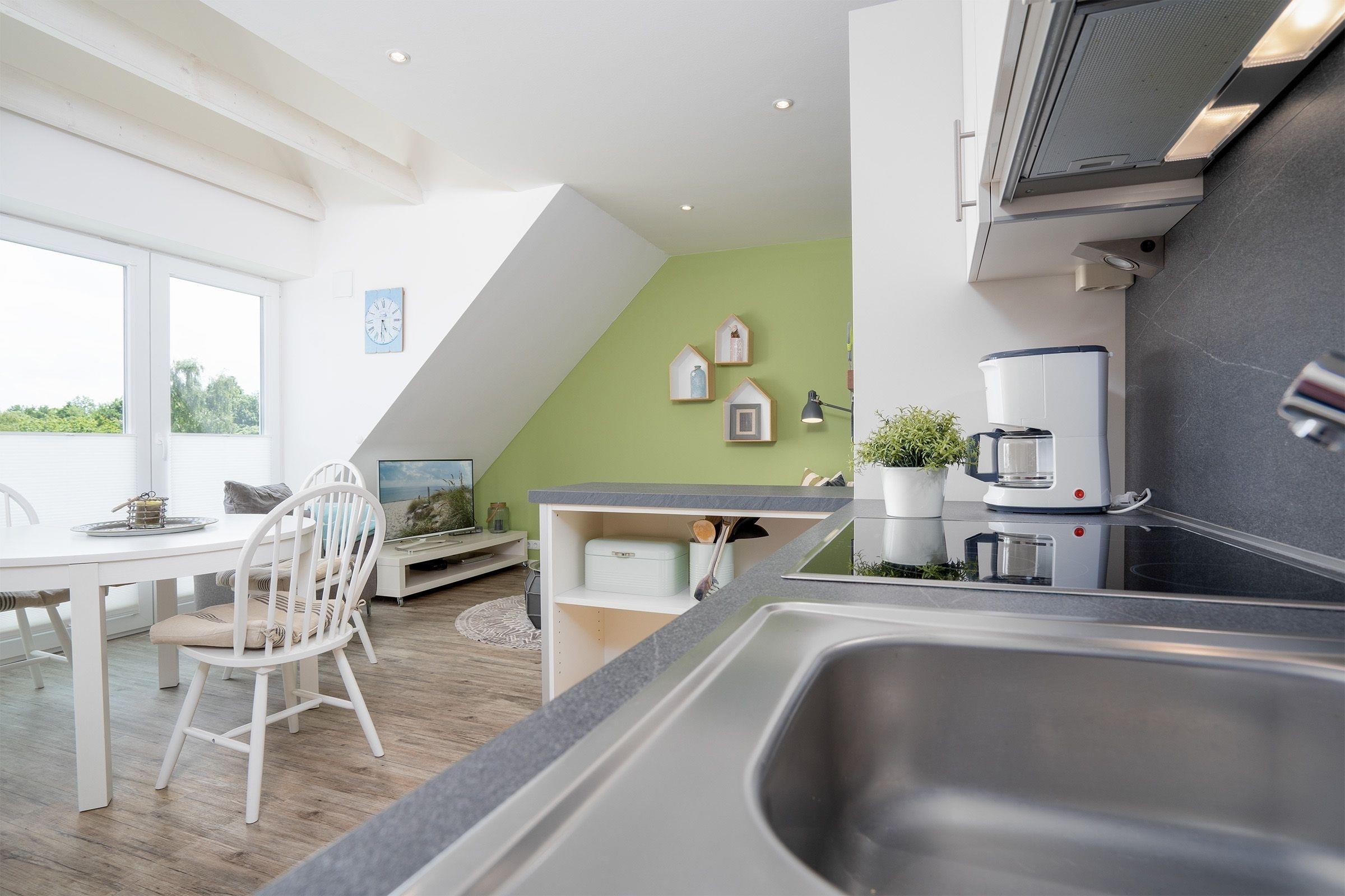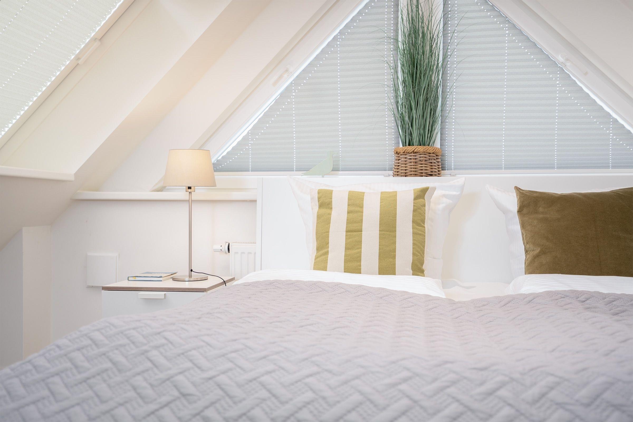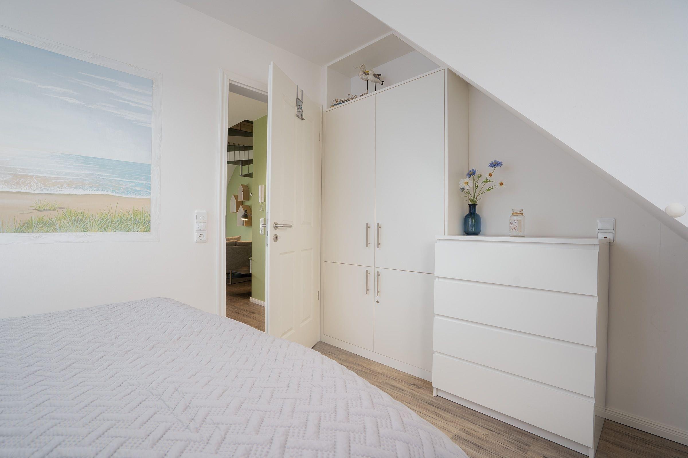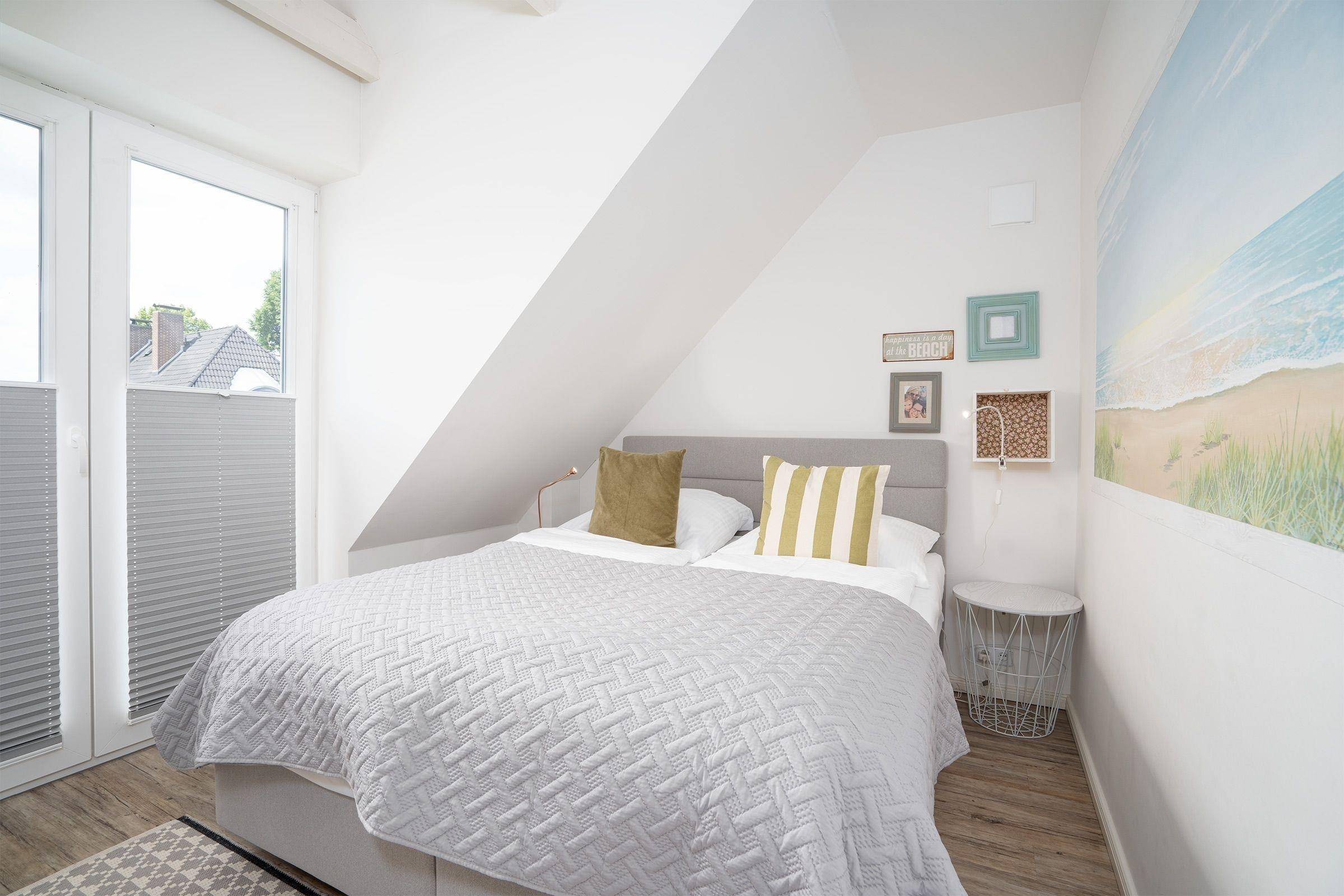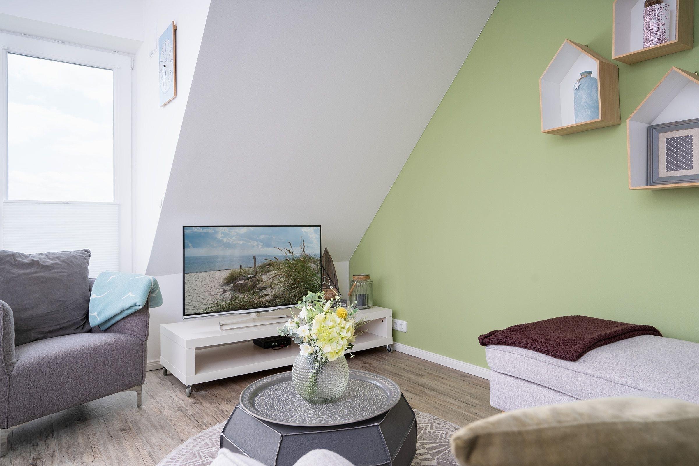 Der stilvoll eingerichtete Wohnbereich mit einem bequemen Sofa und Flachbildfernseher grenzt offen an den Essbereich mit ausreichend Platz für alle Gäste. Von hier aus gelangen Sie auf den möblierten Balkon. In der voll ausgestatteten Küche können Sie köstliche Mahlzeiten zubereiten. In einem Schlafzimmer erwartet Sie ein Boxspringbett (2x 80x200 cm), Kleiderschrank sowie ein Balkon mit Abendsonne. Das andere Schlafzimmer befindet sich im Dachgeschoss mit charmanten Schrägen rechts und links vom Doppelbett (2x 90x200 cm), Beide Zimmer haben Verdunkelungsmöglichkeiten. Von dem zweiten Balkon aus können Sie sogar einen Blick auf die Ostsee erhaschen. Für die kleinen Gäste steht Ihnen ein Kinderbett und ein Kinderhochstuhl inklusive zur Verfügung.