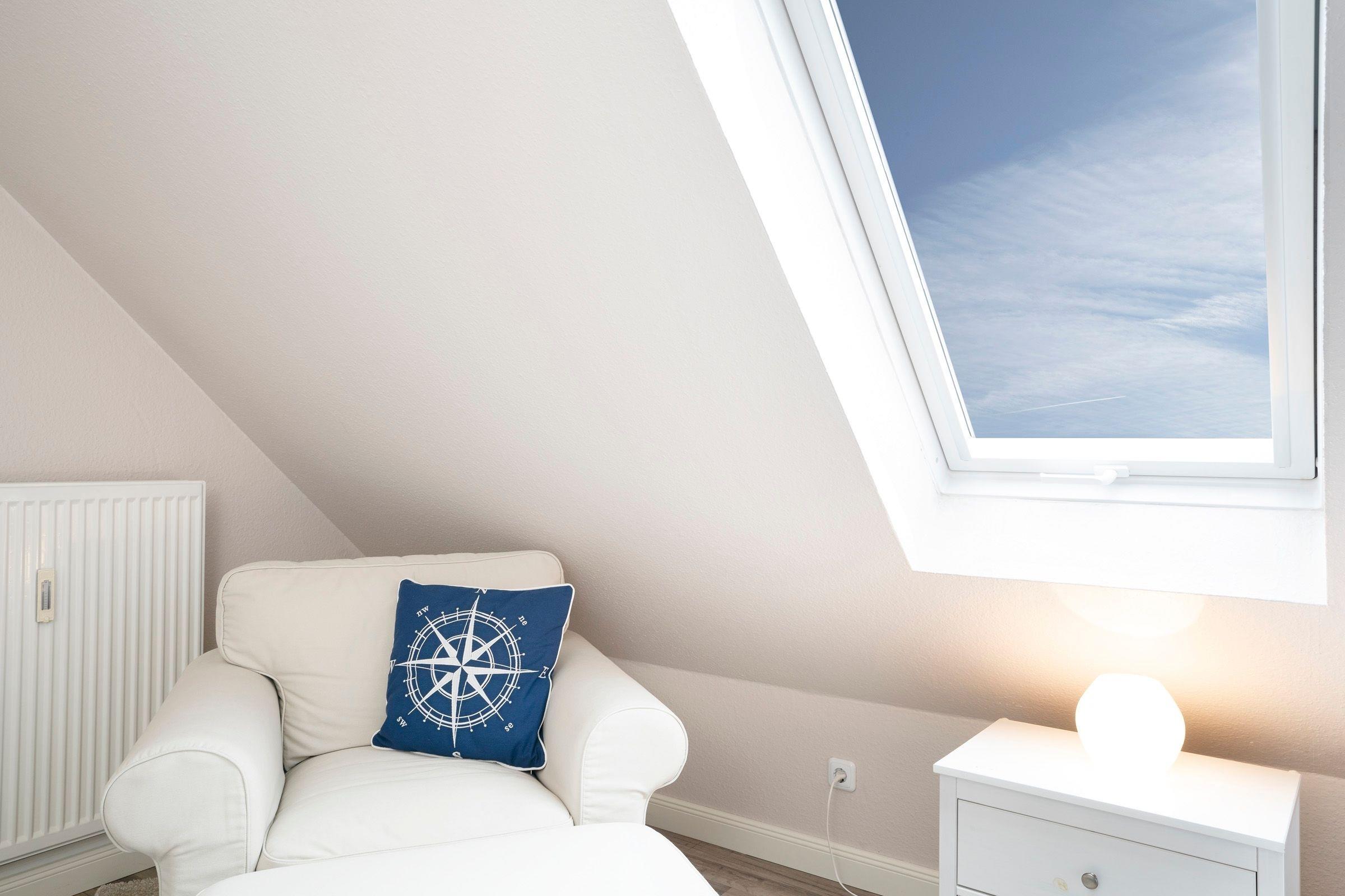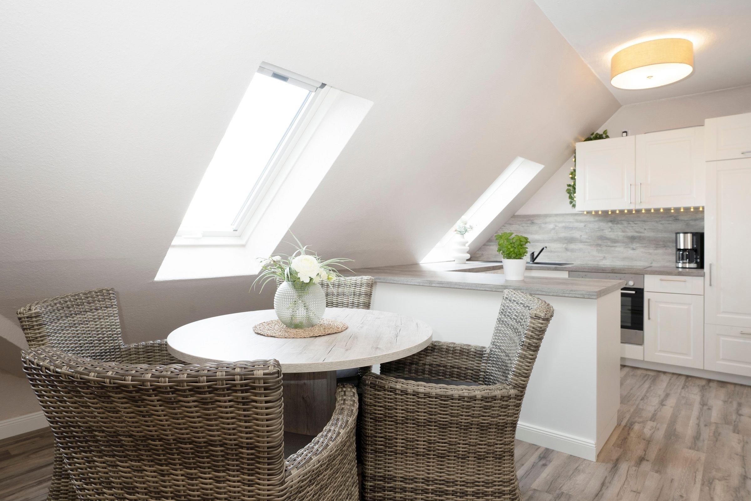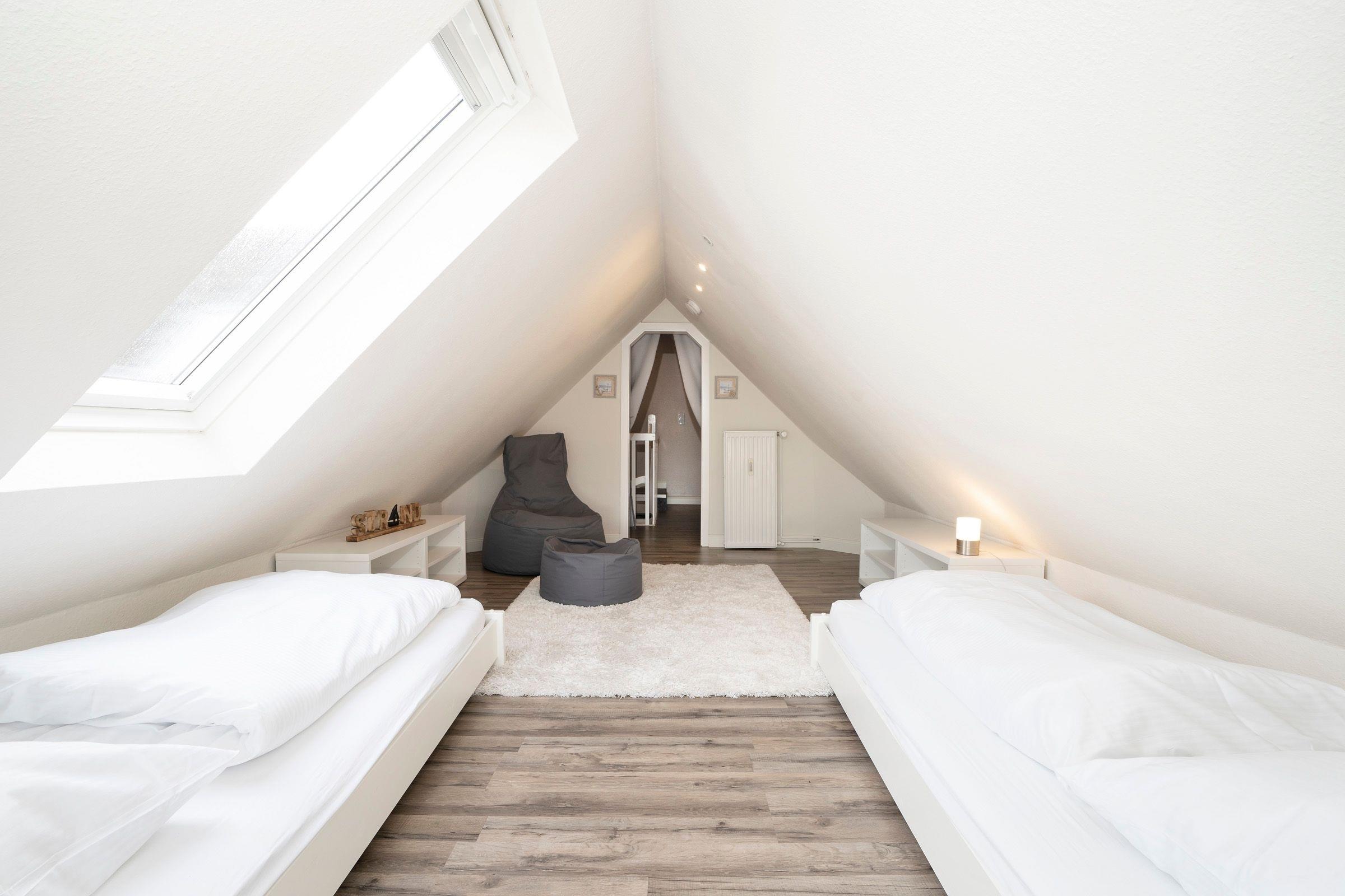 Vom Flur aus gelangen Sie in den Wohnbereich. Dieser ist hell und geschmackvoll eingerichtet und umfasst neben der gemütlichen Couch einen Flachbild-TV, die integrierte Küchenzeile sowie einen geräumigen Essplatz, an dem alle zusammensitzen und die Mahlzeiten gemeinsam einnehmen können. Der überdachte, möblierte Balkon lädt zu zahlreichen Sonnenstunden an der frischen Luft ein. Ebenfalls auf dieser Etage befindet sich das moderne Badezimmer mit Badewanne inklusive Duschfunktion. Eine Wendeltreppe führt in den oberen Schlafbereich, der im 1. Schlafzimmer mit einem Doppelbett (2x 90x200 cm) und im 2. Schlafzimmer mit 2 Einzelbetten (je 90x200 cm) ausgestattet ist. In der Wohnung steht Ihnen ein mobiler klappbarer Schreibtisch zur Verfügung, der bei Bedarf im Schlaf- oder Kinderzimmer aufgestellt werden kann. So ist auch Arbeiten im Urlaub möglich, ohne den Essplatz zu belegen.