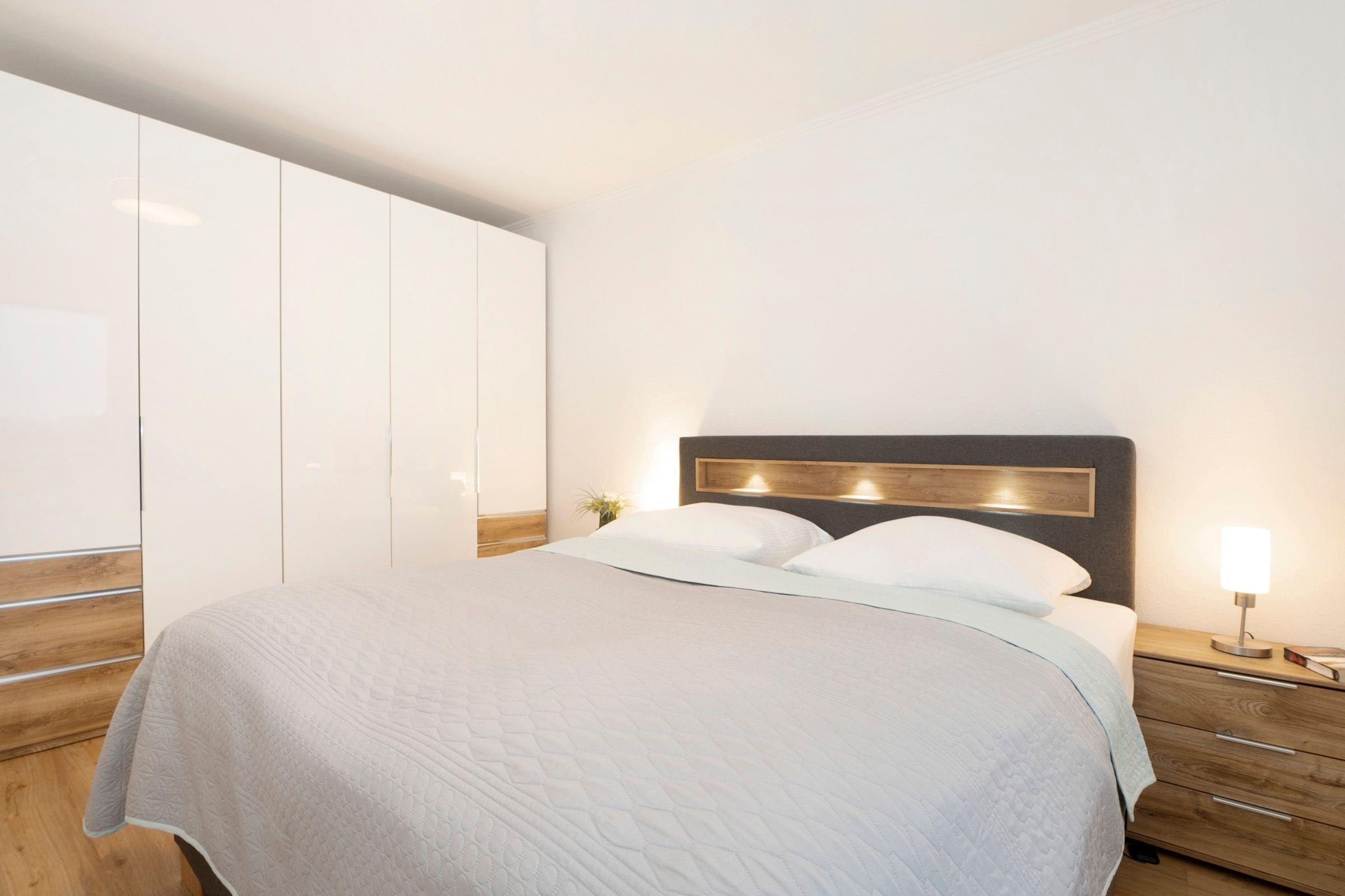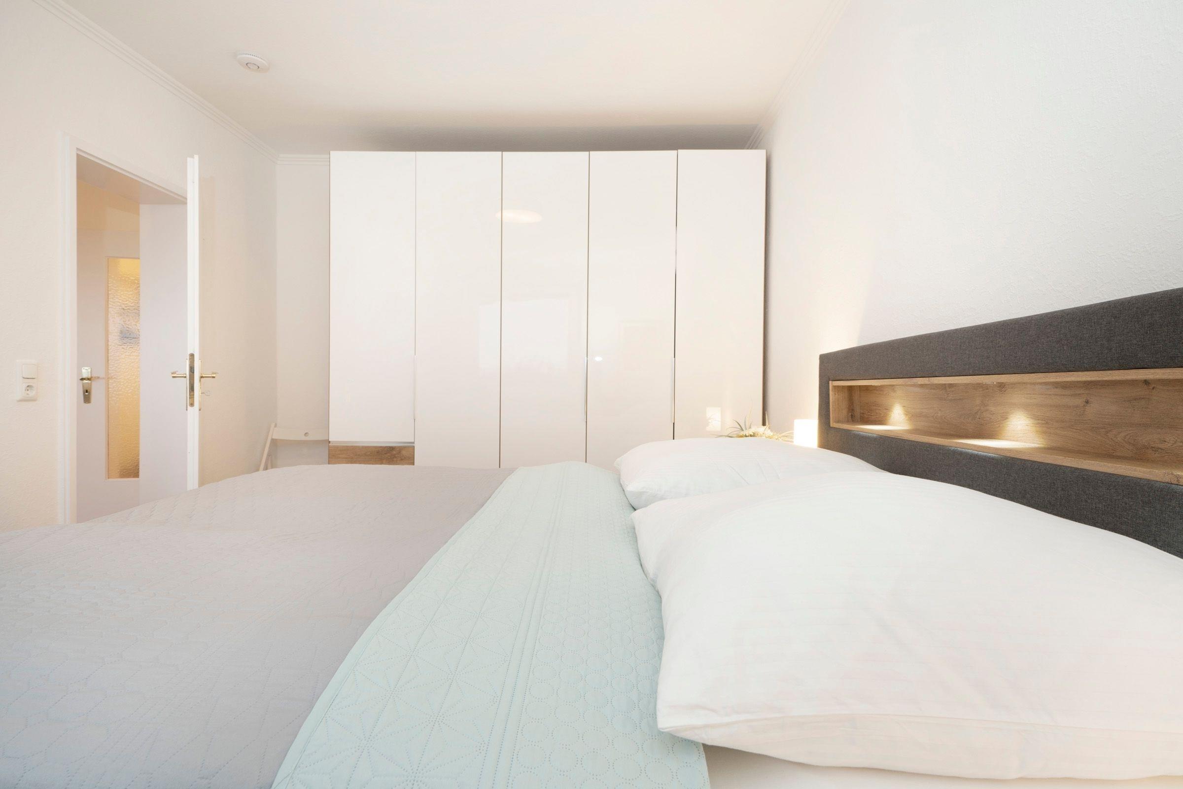 Schlafzimmer: 1 Doppelboxspringbett (2x 90x200 cm), Kleiderschrank, Verdunkelung vorhanden (Plissees), kein Platz für Kinderreisebett vorhanden