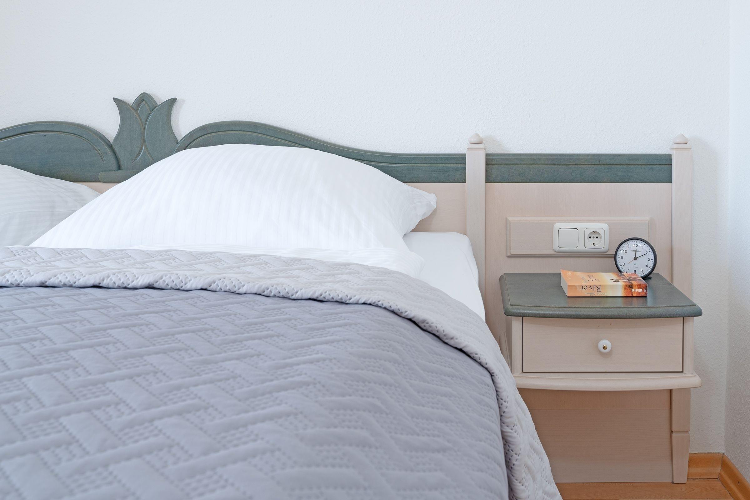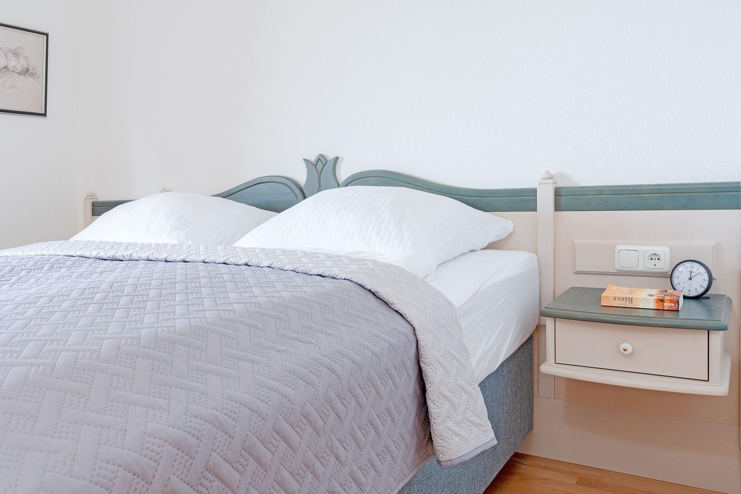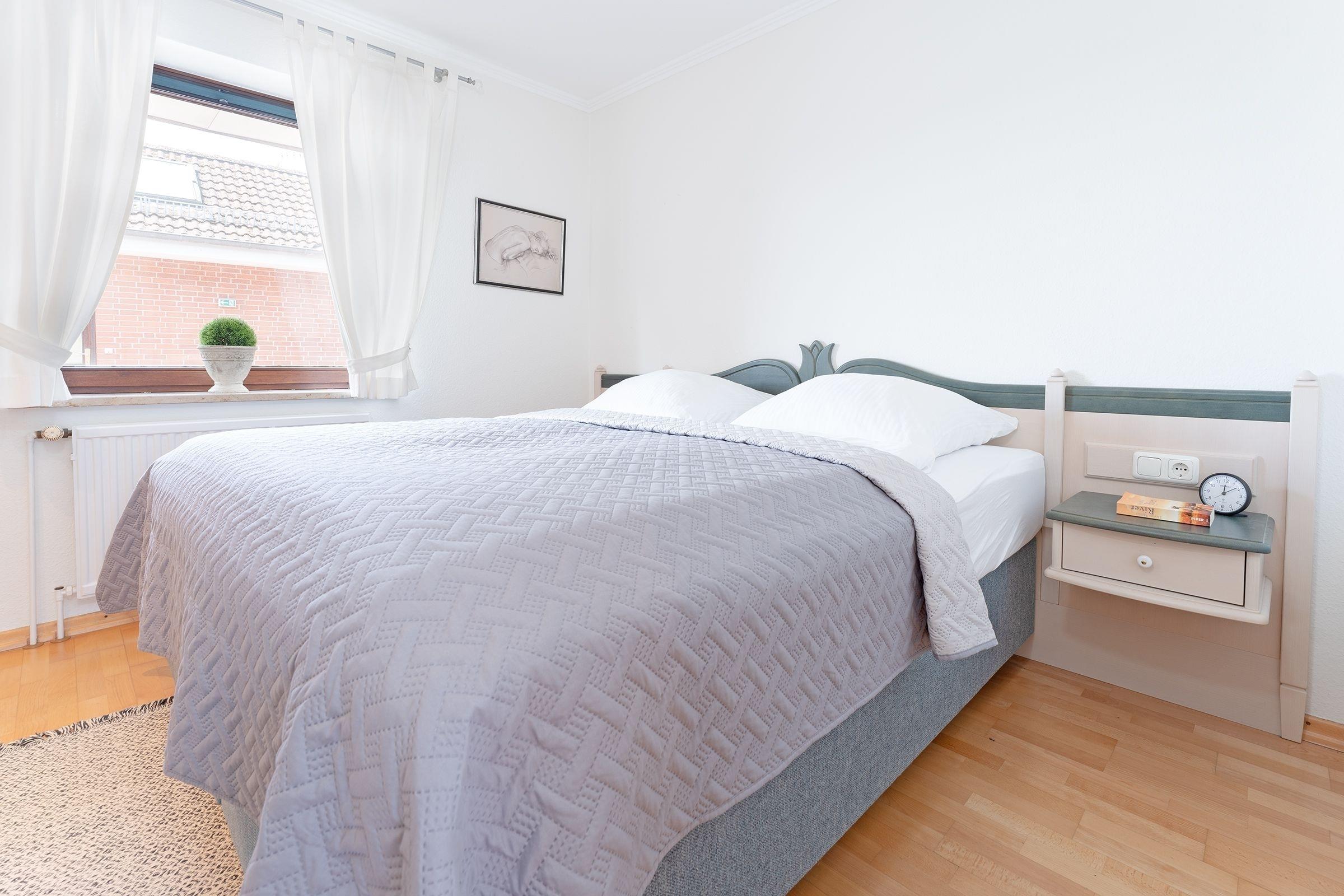 Schlafzimmer 1: 1 Boxspring-Doppelbett (160x200 cm, durchgehender Topper), Kleiderschrank, Verdunkelung: Plissees, kein Platz für Babybett