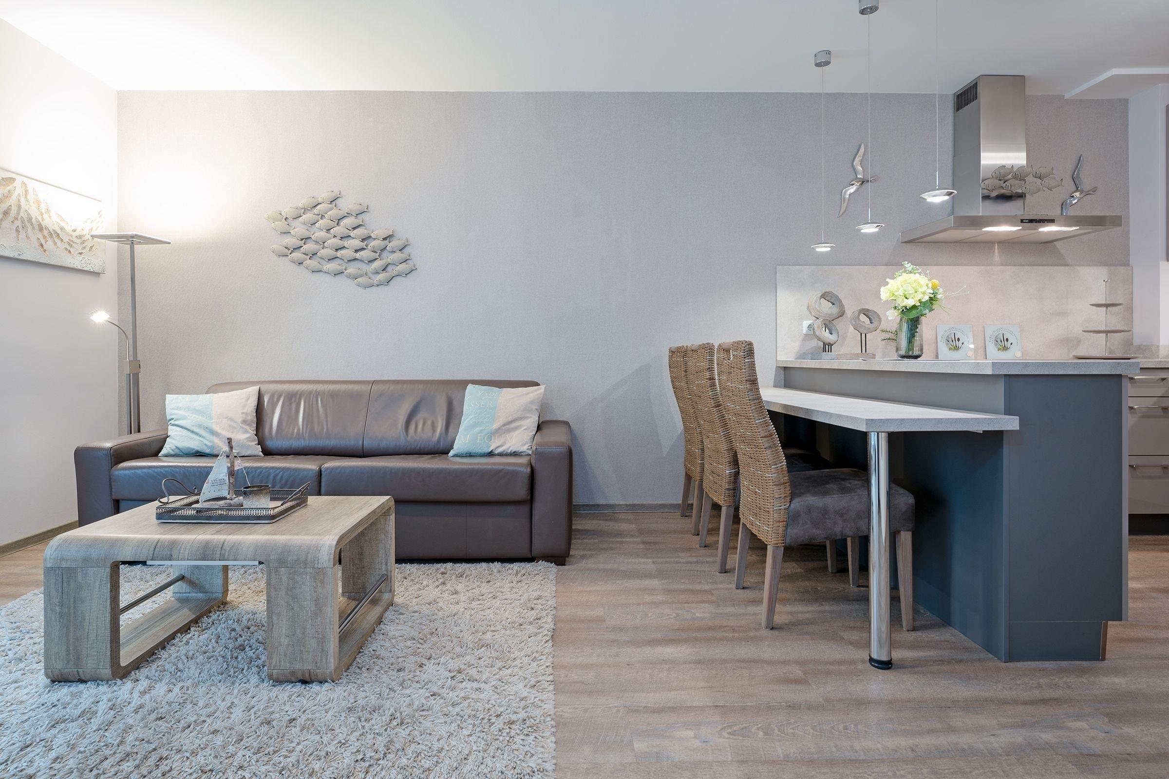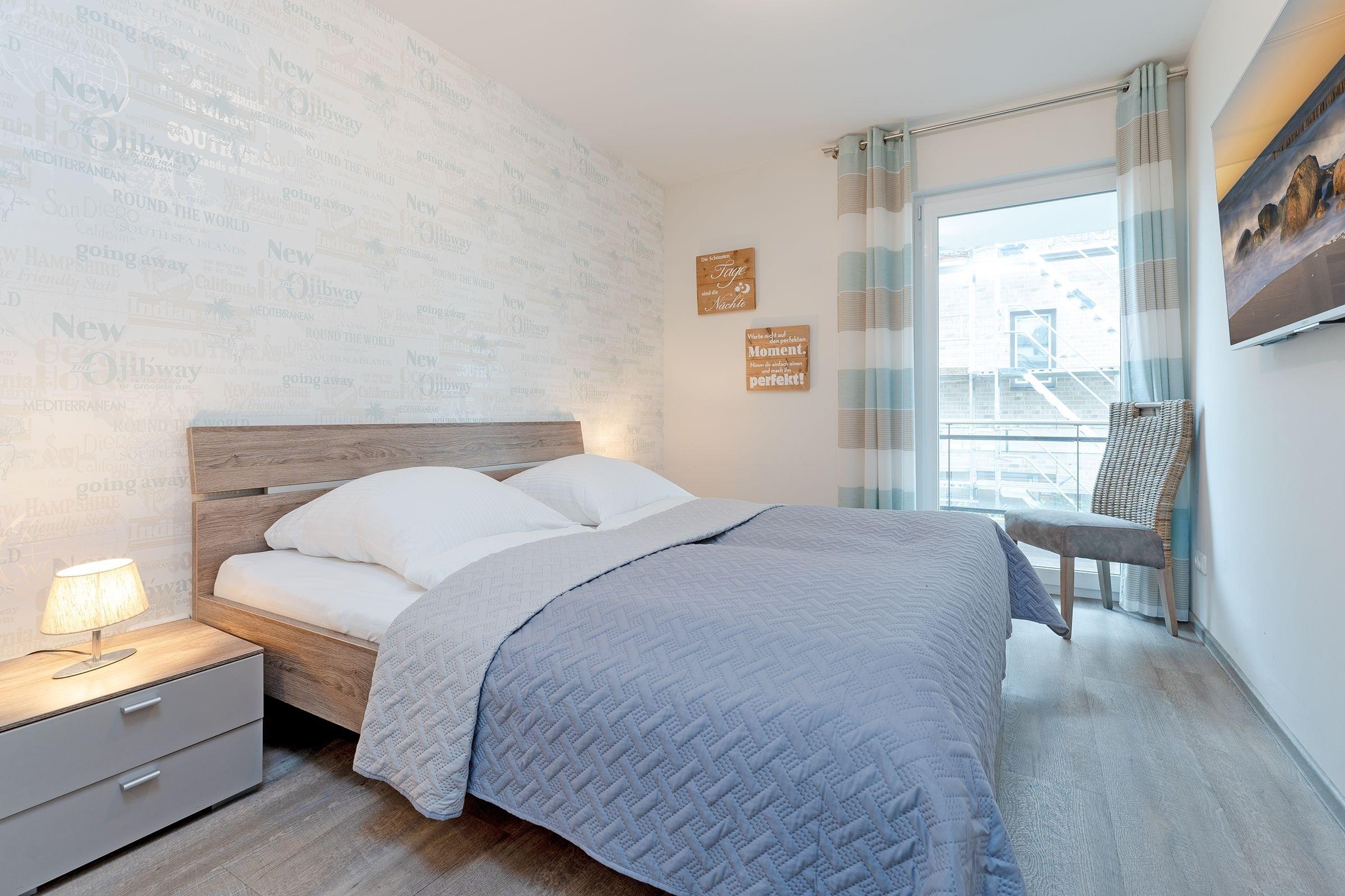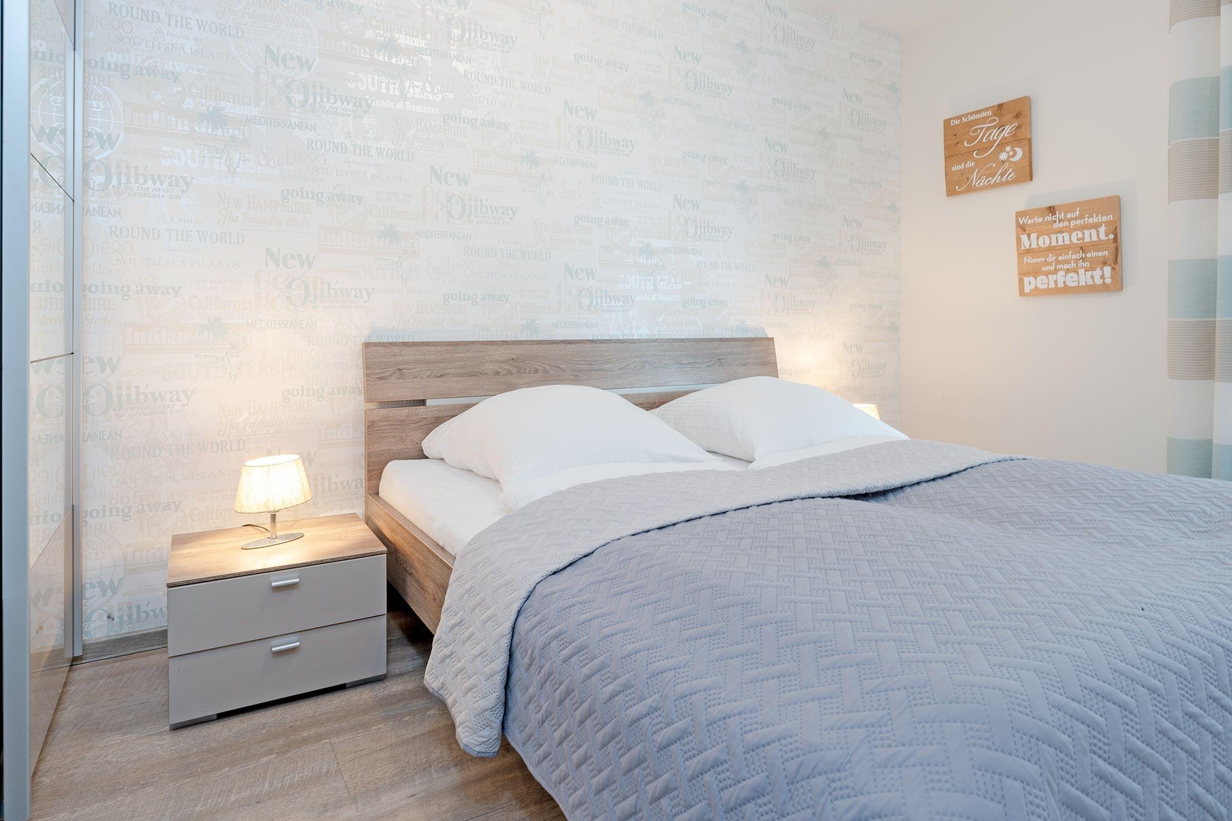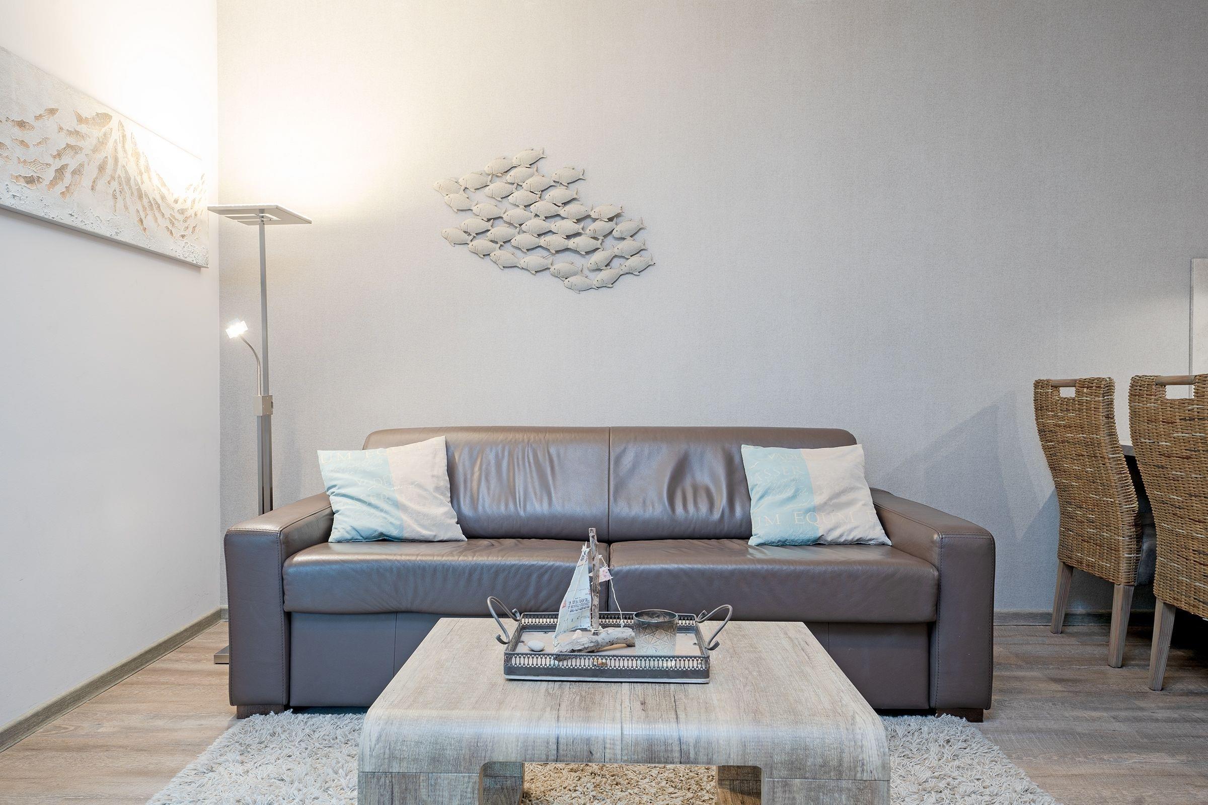 Ihr Urlaub startet schon vor Betreten Ihrer Ferienwohnung - der Aufzug bringt Sie und Ihr Gepäck bequem in den 1. Stock. Treten Sie ein in den hell gestalteten Wohnbereich und machen Sie es sich auf dem Sofa gemütlich. Dieses lässt sich im Handumdrehen für die Nacht in ein bequemes Bett (160x195 cm) für zwei Feriengäste verwandeln. Von hier aus gelangen Sie auch auf den überdachten Balkon mit Süd-Ausrichtung, auf dem Sie Ihre Urlaubstage ausklingen lassen und die letzten Sonnenstrahlen des Tages genießen können. Für gesellige Grillabende an lauen Sommerabenden steht Ihnen sogar ein elektrischer Tischgrill zur Verfügung. Die zum Wohnbereich hin offen gestaltete Küche lässt mit ihrer guten Ausstattung bis hin zum Raclettegerät keine kulinarischen Wünsche offen. Ihre Nachtruhe finden Sie im separaten Schlafzimmer mit komfortablen Doppelbett (2x 90x200 cm), das mit den Außenjalousien für erholsame Stunden sorgt. Abgerundet wird Ihre Ferienwohnung durch das innenliegende Badezimmer, das mit einem Spiegel mit integriertem Radio und TV überzeugt. Gönnen Sie sich eine wohltuende Dusche während Sie Ihrem Lieblingsradiosender lauschen, um erfrischt in den Tag zu starten. Dieses Feriendomizil überzeugt außerdem mit einer Fußbodenheizung, die Ihnen auch an kälteren Tagen gemütliche Urlaubswärme beschert.