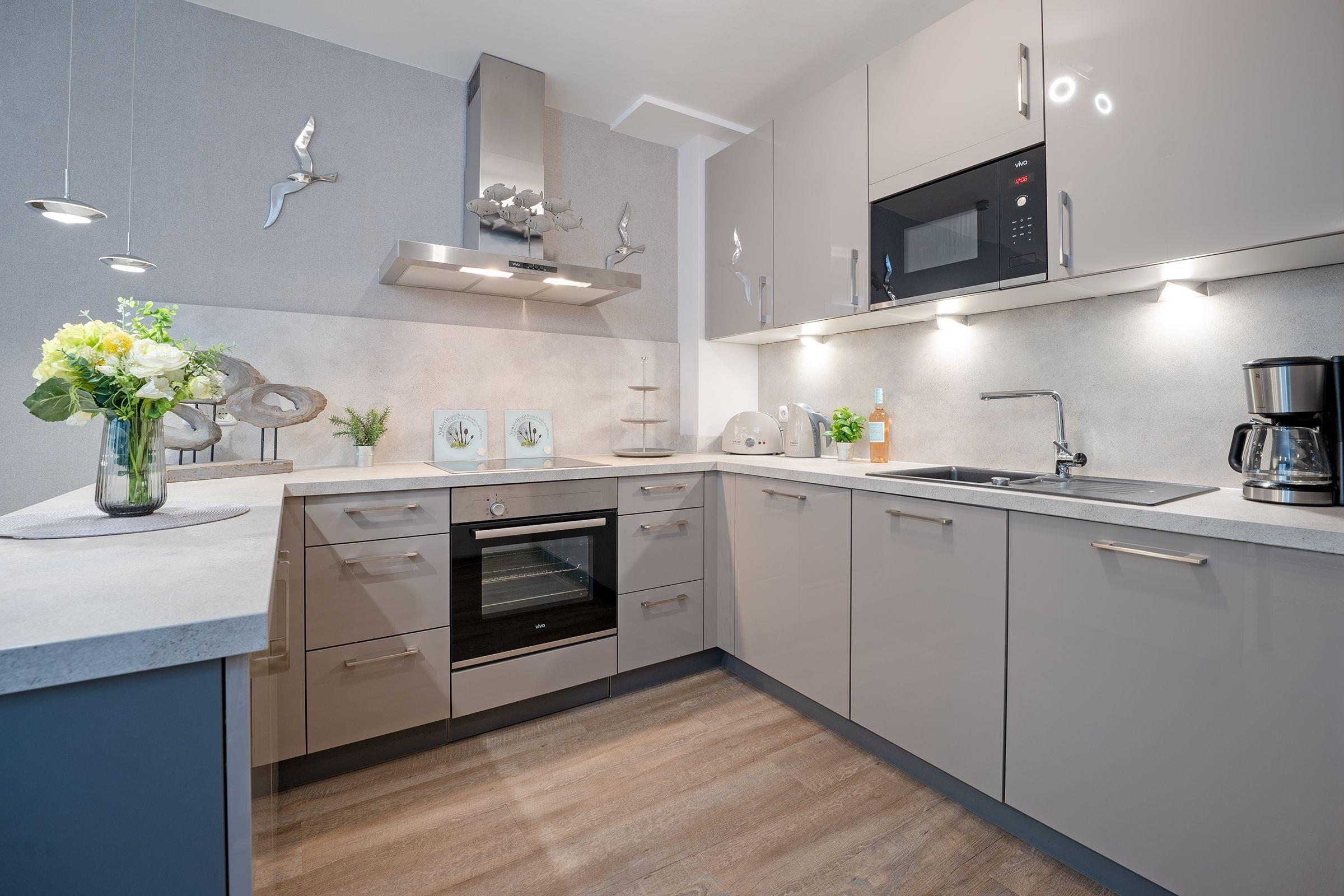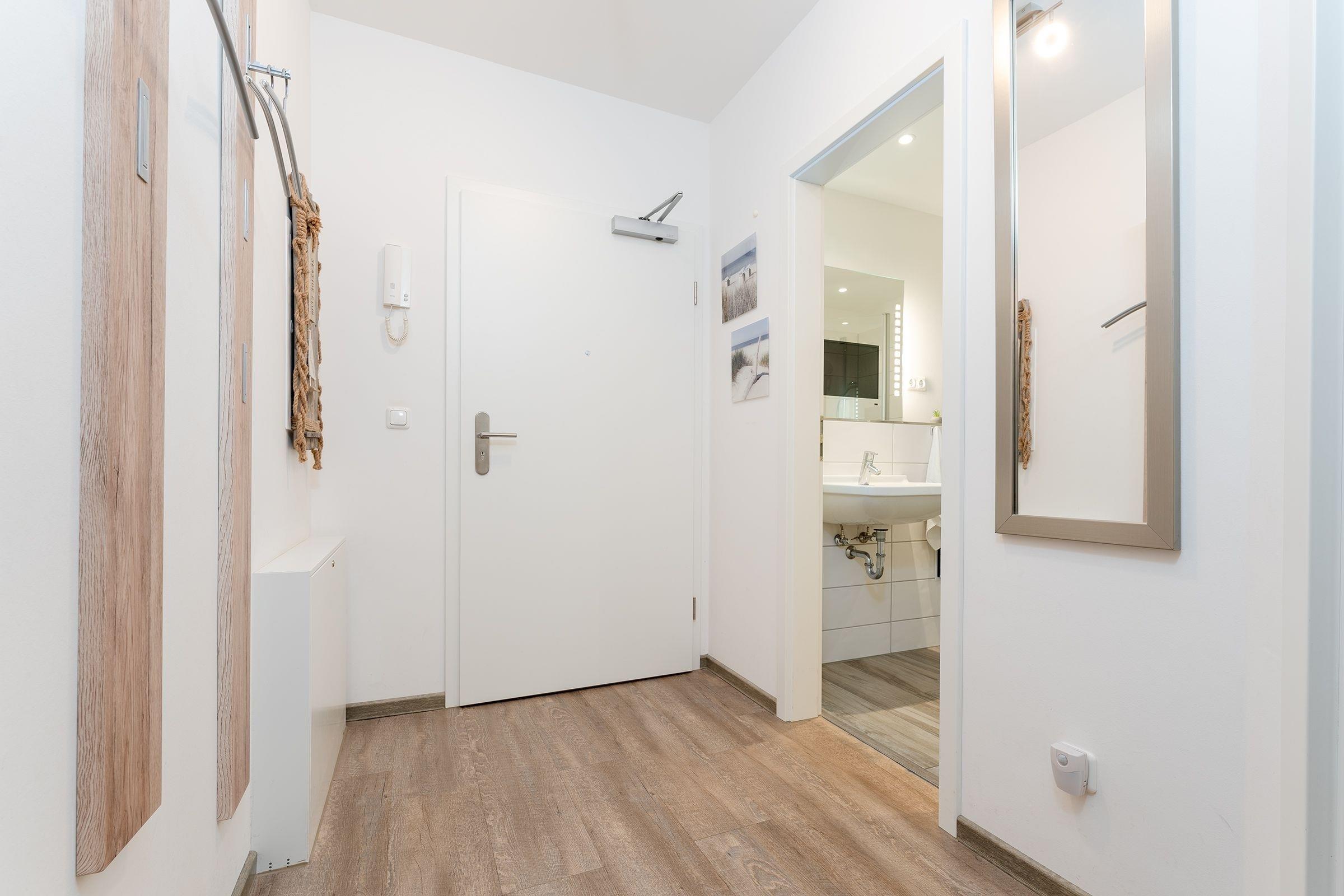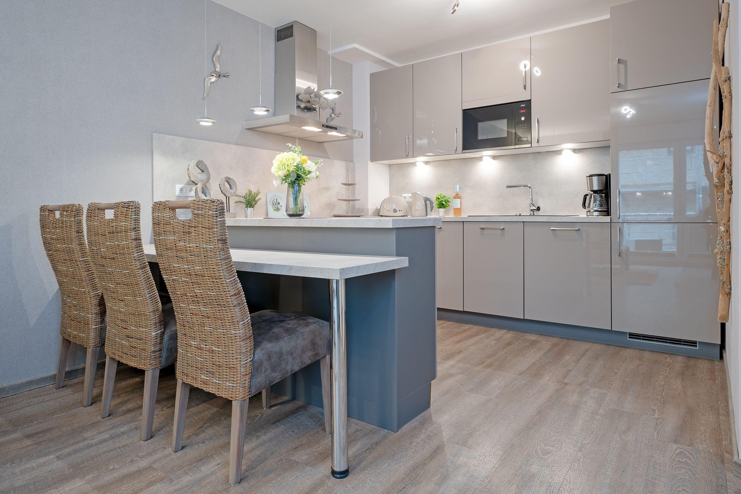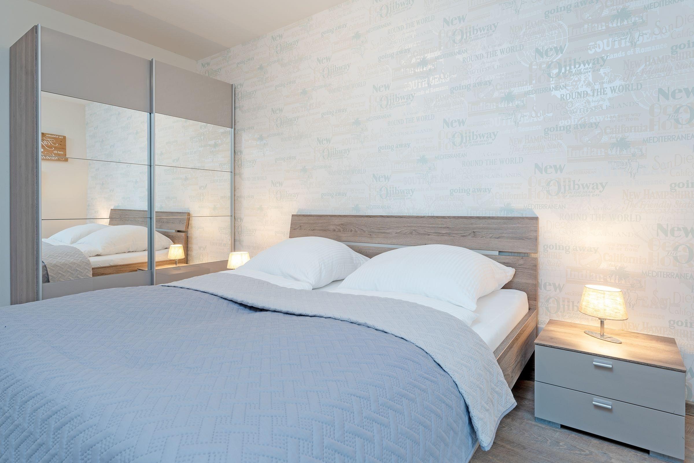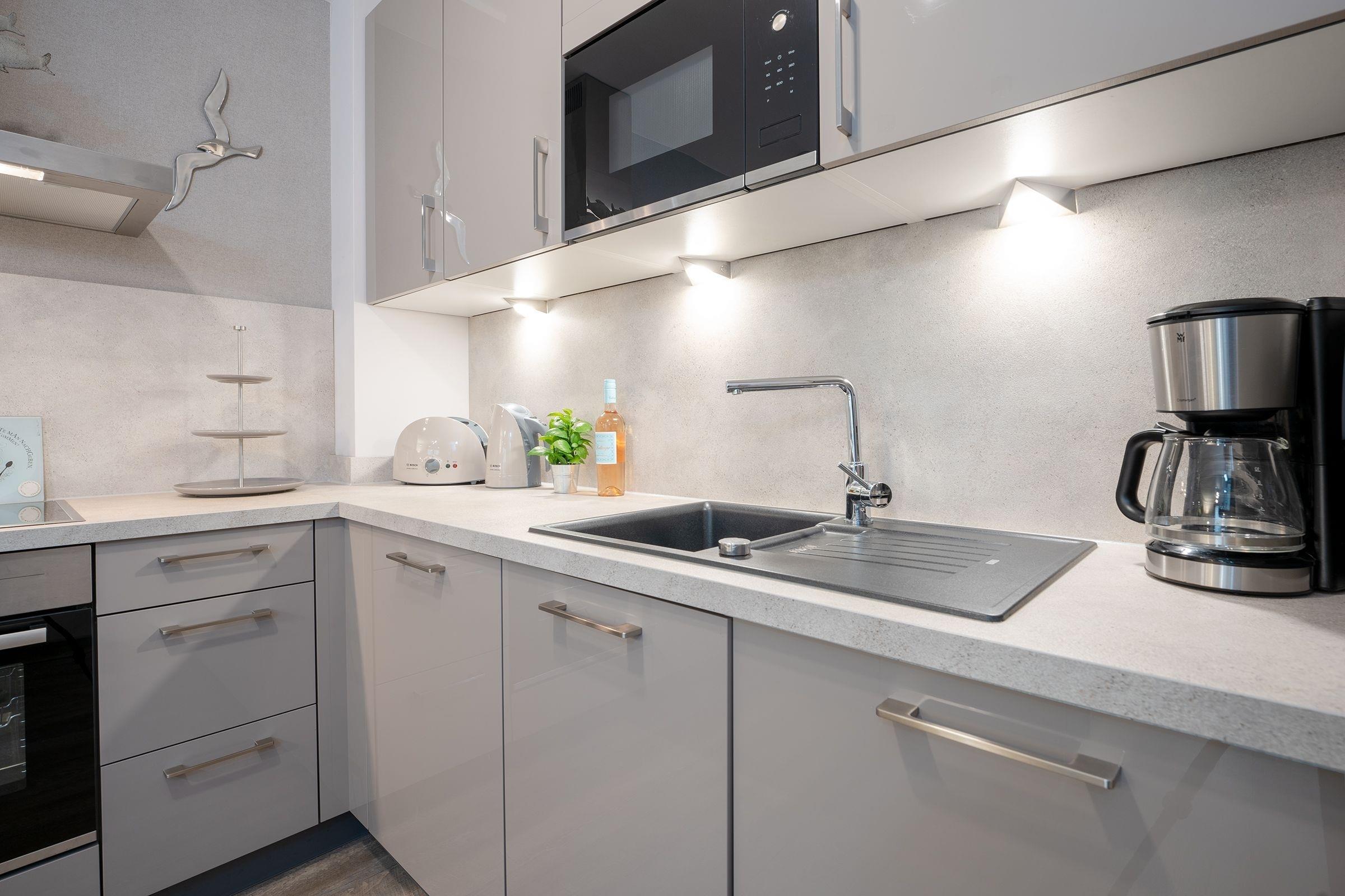 Ihr Urlaub startet schon vor Betreten Ihrer Ferienwohnung - der Aufzug bringt Sie und Ihr Gepäck bequem in den 1. Stock. Treten Sie ein in den hell gestalteten Wohnbereich und machen Sie es sich auf dem Sofa gemütlich. Dieses lässt sich im Handumdrehen für die Nacht in ein bequemes Bett (160x195 cm) für zwei Feriengäste verwandeln. Von hier aus gelangen Sie auch auf den überdachten Balkon mit Süd-Ausrichtung, auf dem Sie Ihre Urlaubstage ausklingen lassen und die letzten Sonnenstrahlen des Tages genießen können. Für gesellige Grillabende an lauen Sommerabenden steht Ihnen sogar ein elektrischer Tischgrill zur Verfügung. Die zum Wohnbereich hin offen gestaltete Küche lässt mit ihrer guten Ausstattung bis hin zum Raclettegerät keine kulinarischen Wünsche offen. Ihre Nachtruhe finden Sie im separaten Schlafzimmer mit komfortablen Doppelbett (2x 90x200 cm), das mit den Außenjalousien für erholsame Stunden sorgt. Abgerundet wird Ihre Ferienwohnung durch das innenliegende Badezimmer, das mit einem Spiegel mit integriertem Radio und TV überzeugt. Gönnen Sie sich eine wohltuende Dusche während Sie Ihrem Lieblingsradiosender lauschen, um erfrischt in den Tag zu starten. Dieses Feriendomizil überzeugt außerdem mit einer Fußbodenheizung, die Ihnen auch an kälteren Tagen gemütliche Urlaubswärme beschert.