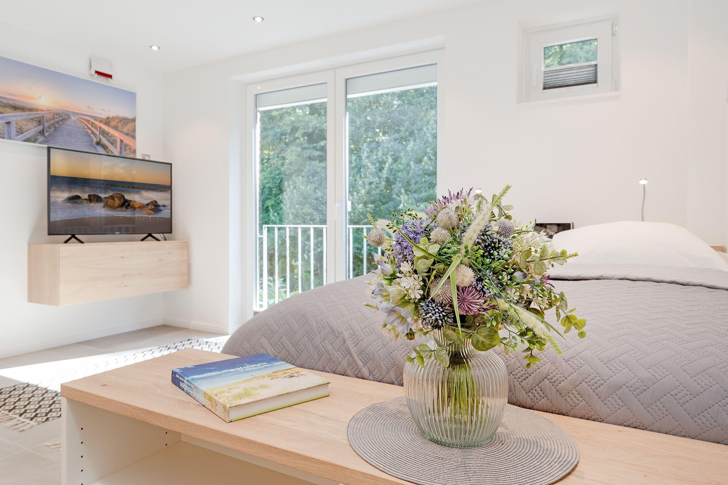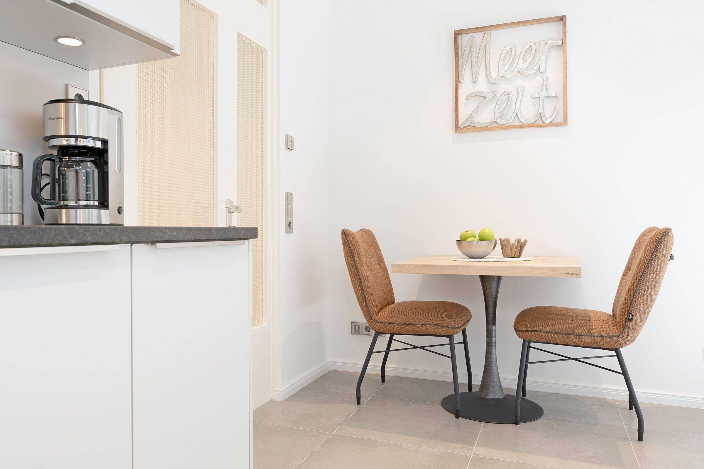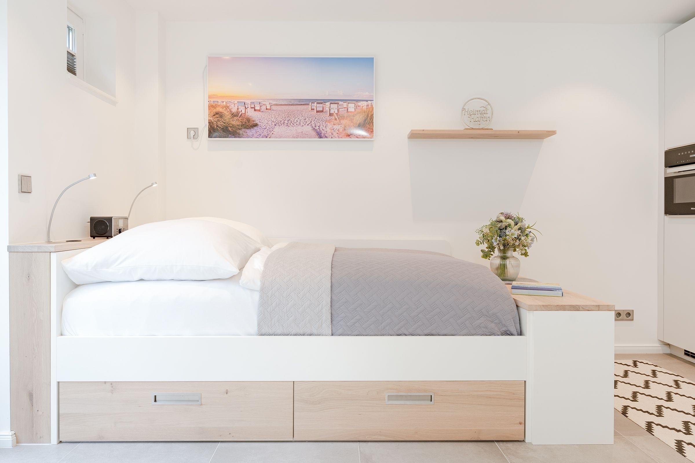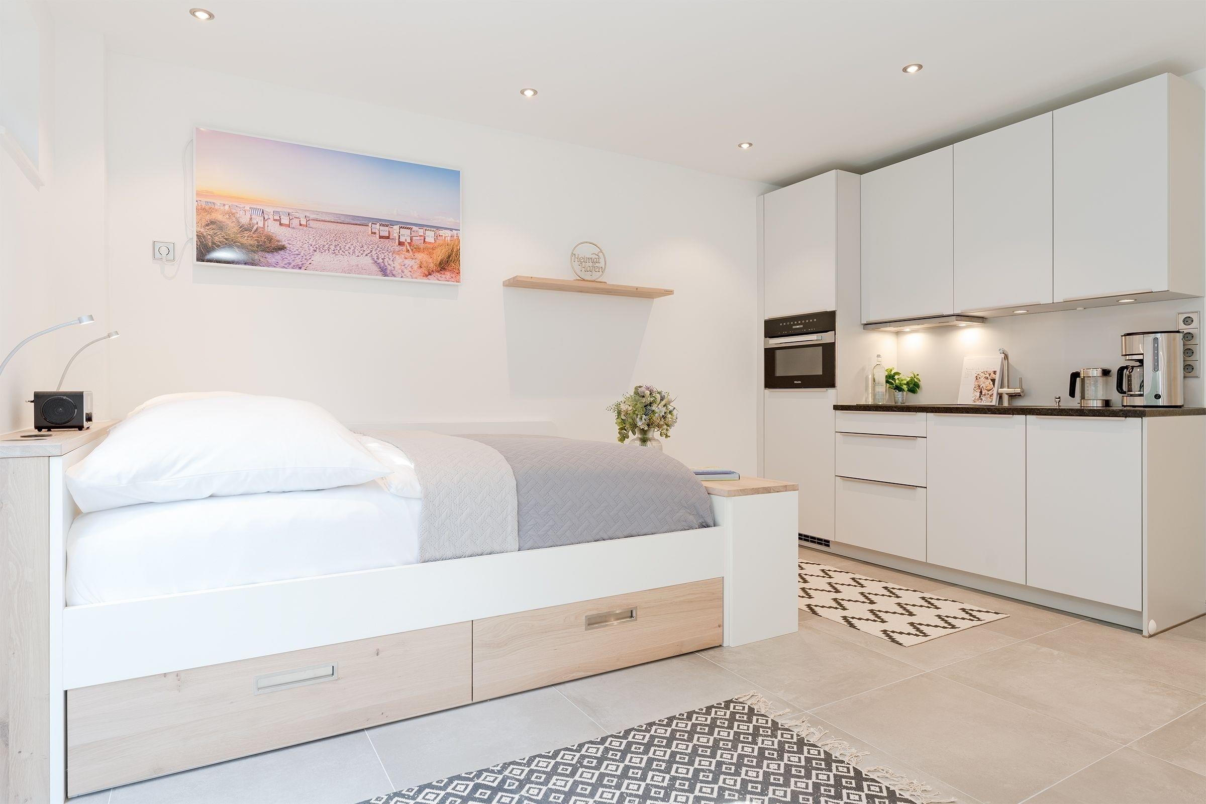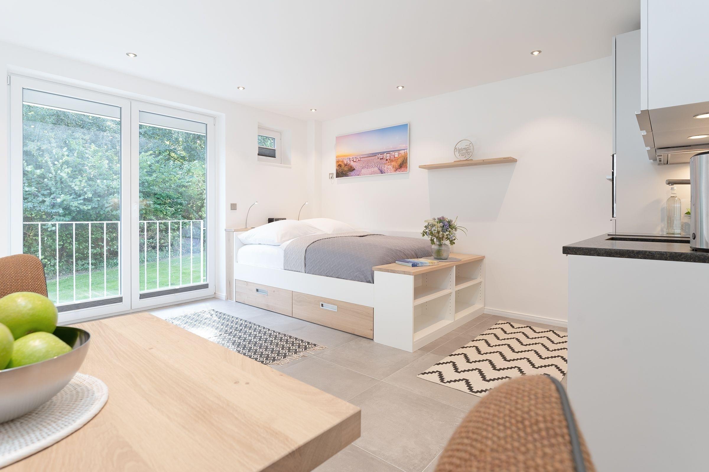 Genießen Sie Ihren Urlaub in dieser modern ausgestatteten Ferienwohnung. Der Wohn- und Schlafbereich ist offen gestaltet und verfügt über eine gemütliche Schlafmöglichkeit (140x200 cm) sowie einen TV, der für entspannte Abende sorgt. Die offene Küche integriert sich harmonisch und ist mit hochwertigen Geräten ausgestattet, darunter ein Cerankochfeld, ein Kühlschrank mit Gefrierfach und eine Kaffeemaschine, damit Sie Ihren Tag mit einem frisch gebrühten Kaffee beginnen können. Ein Esstisch bietet Platz für gemeinsame Mahlzeiten. Das Badezimmer ist modern gestaltet und mit einer bodengleichen Dusche sowie einer Fußbodenheizung ausgestattet.