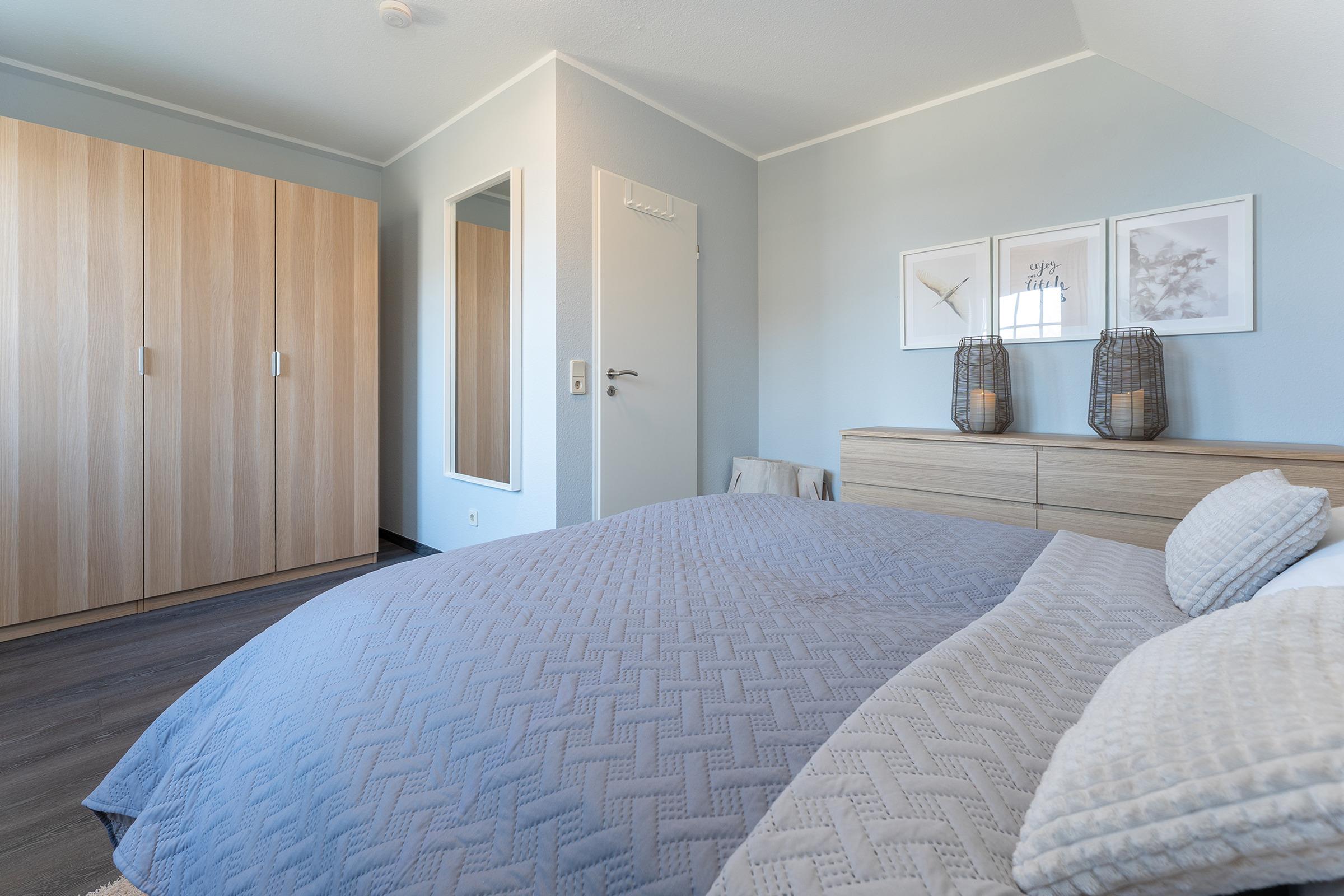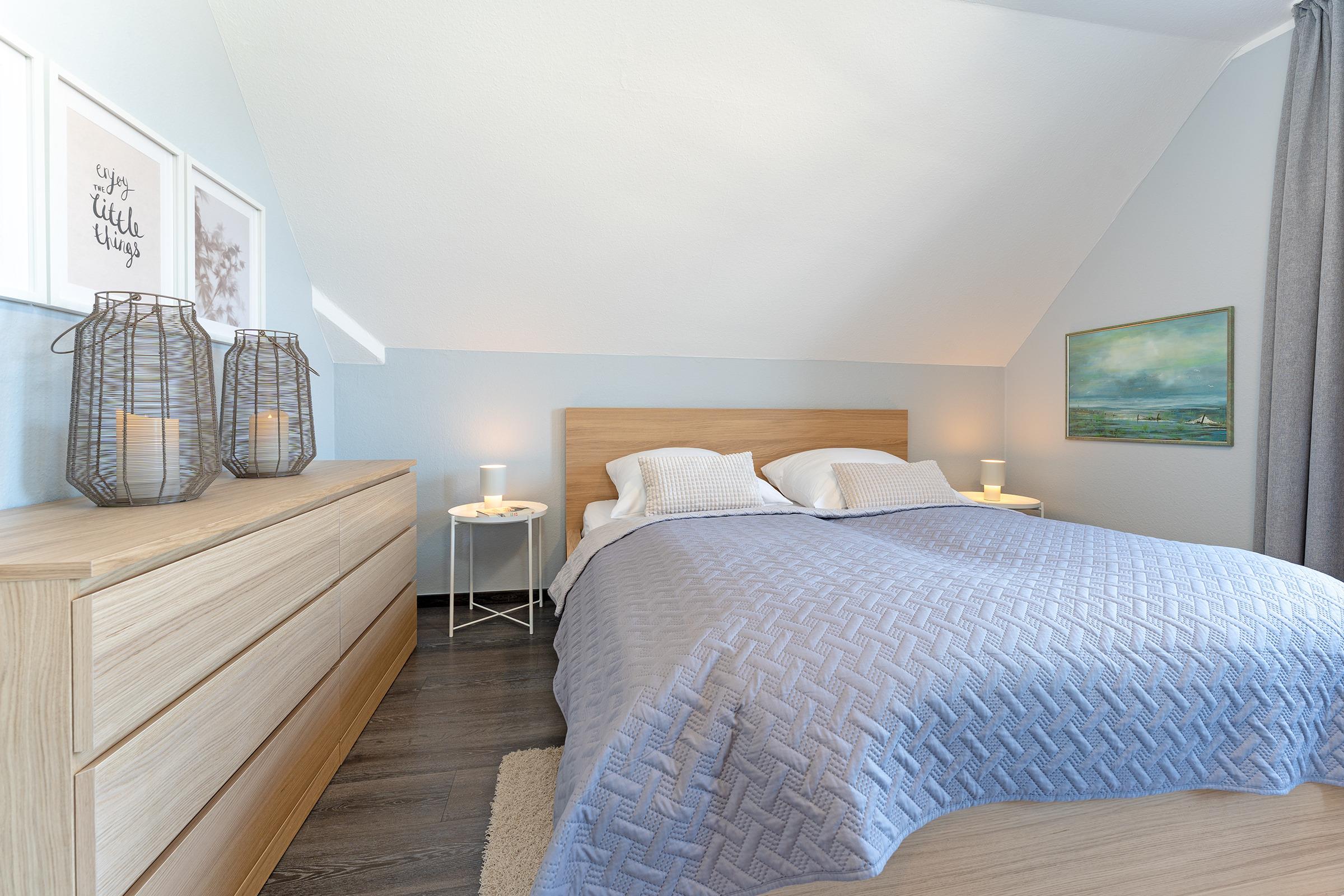 Schlafzimmer: Doppelbett (180x200 cm), Kleiderschrank, Verdunkelung: Rollo/blickdichte Gardine, Platz für Babybett vorhanden