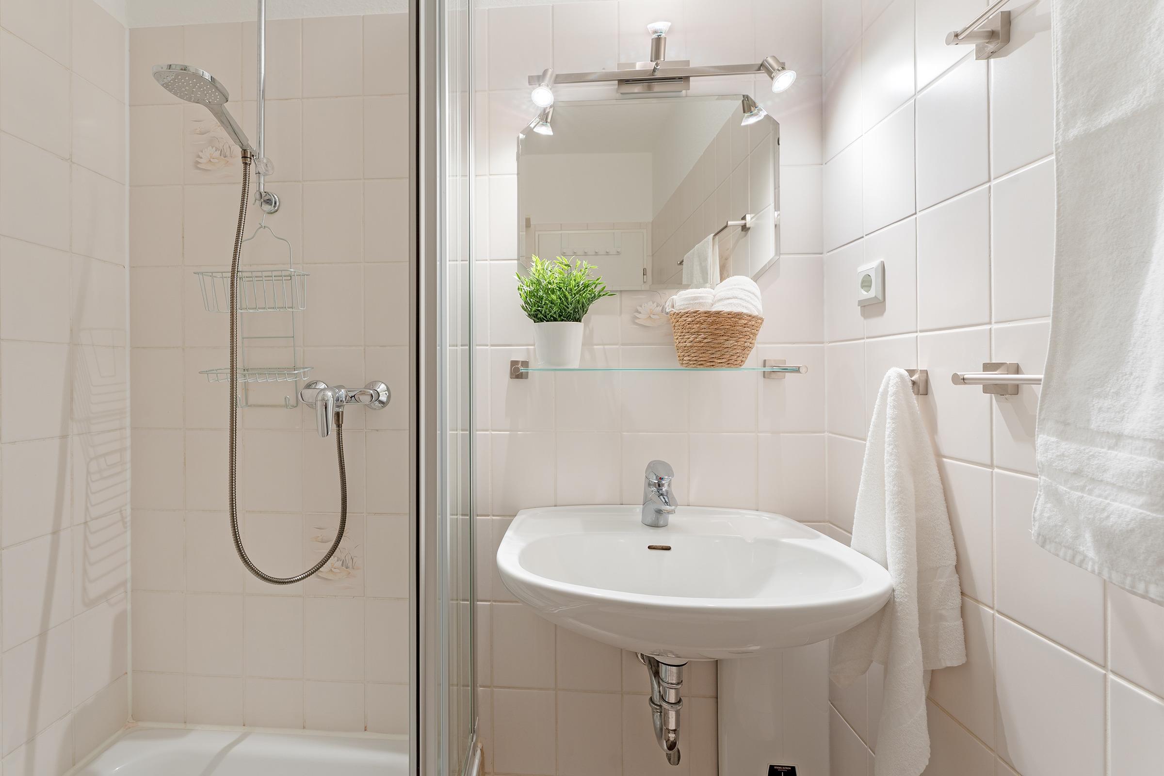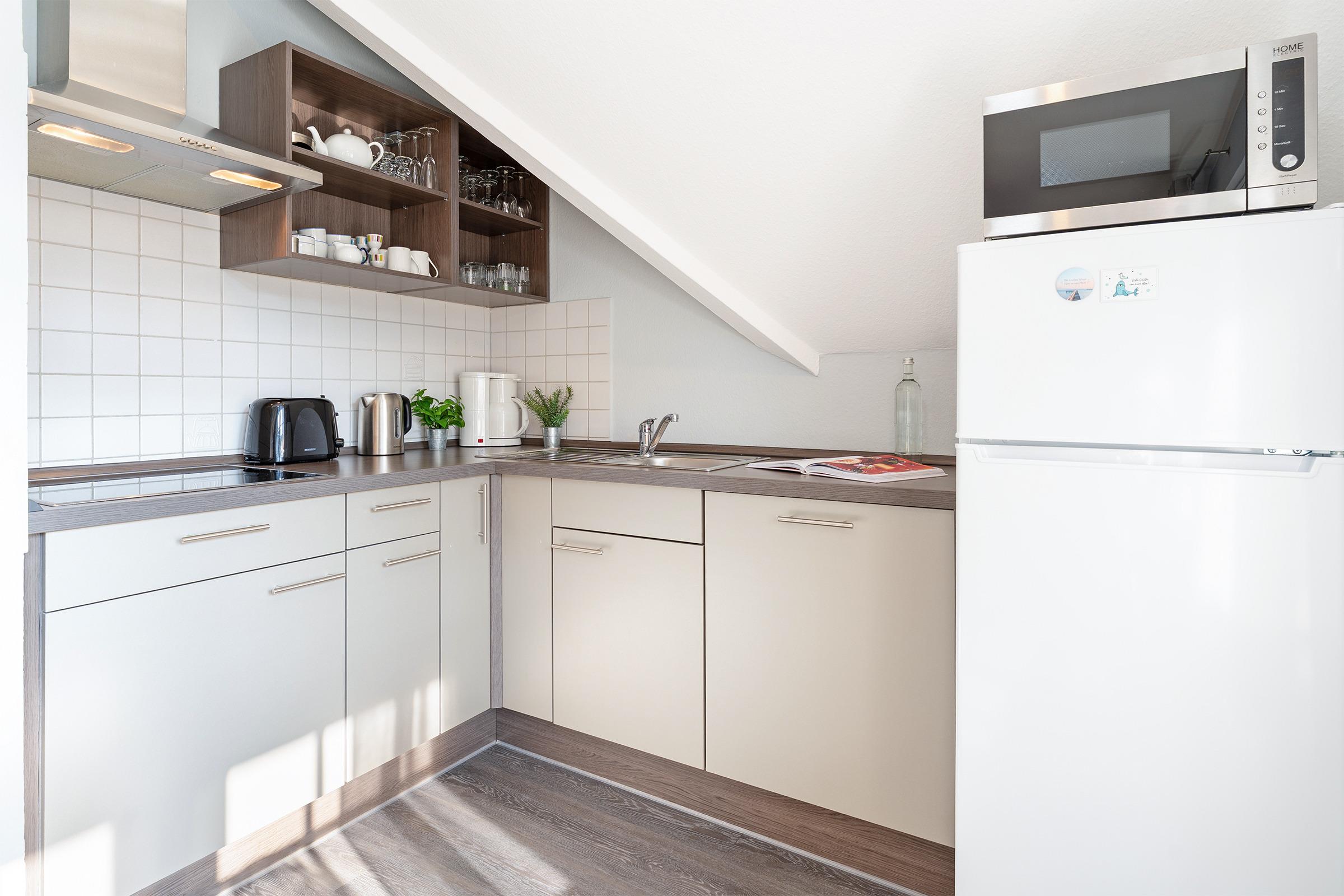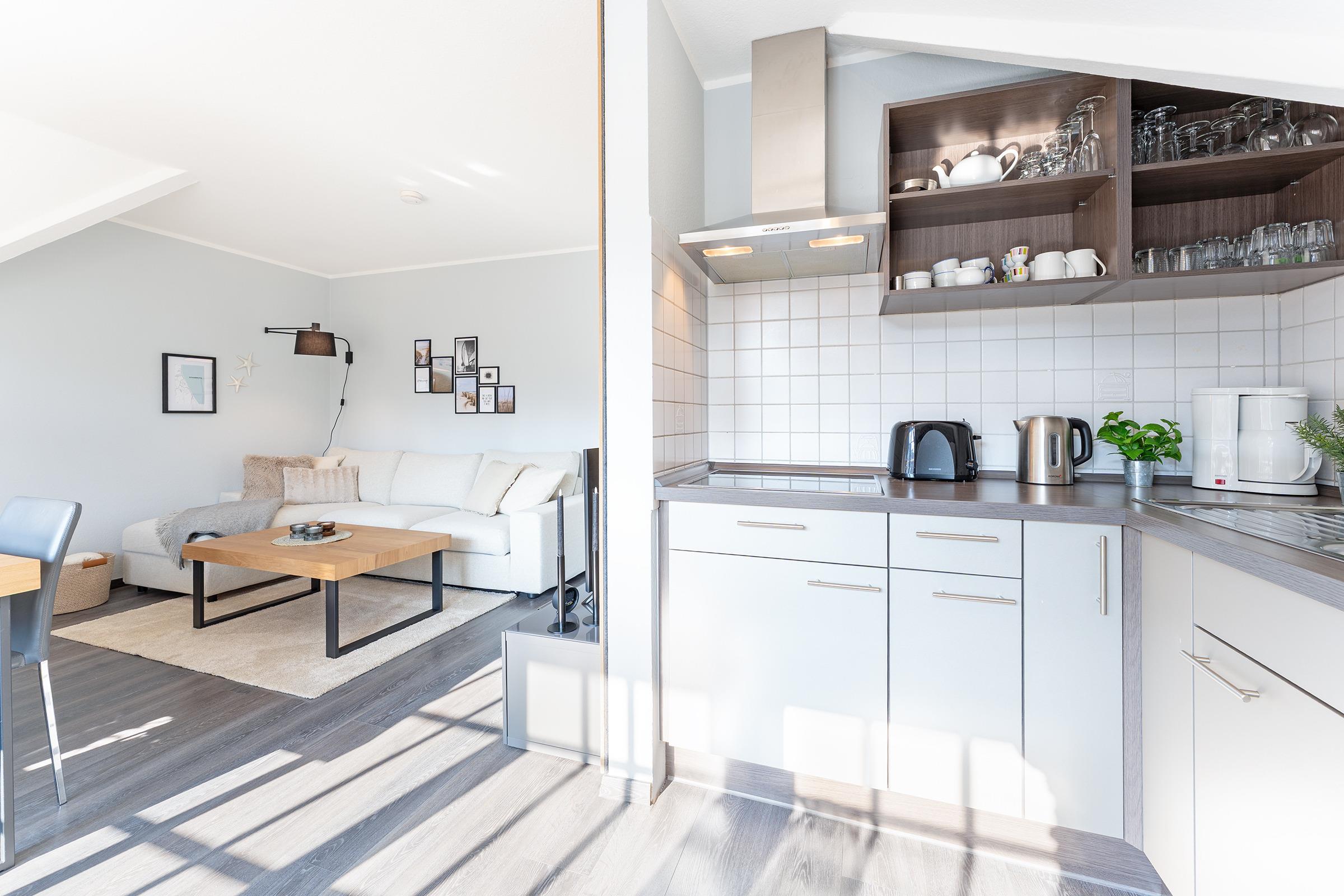 Die Wohnküche ist vollständig ausgestattet und verfügt über einen Ceranherd, Mikrowelle mit Grillfunktion, Kühlschrank, Spülmaschine, eine Kaffeefiltermaschine sowie einen Toaster. Ein großzügiger Essbereich mit Sitzmöglichkeiten für vier Personen lädt zu gemeinsamen Mahlzeiten ein. Das Schlafzimmer ist mit einem komfortablen Doppelbett (180x200 cm) eingerichtet und bietet ausreichend Stauraum für Ihr Gepäck. Zwei weitere Gäste können es sich auf der Schlafcouch im Wohnzimmer (140x200 cm) gemütlich machen. Für kleine Gäste steht ein Kinderhochstuhl sowie ein Babybett bereit. Das helle Duschbad rundet diese Ferienunterkunft perfekt ab.