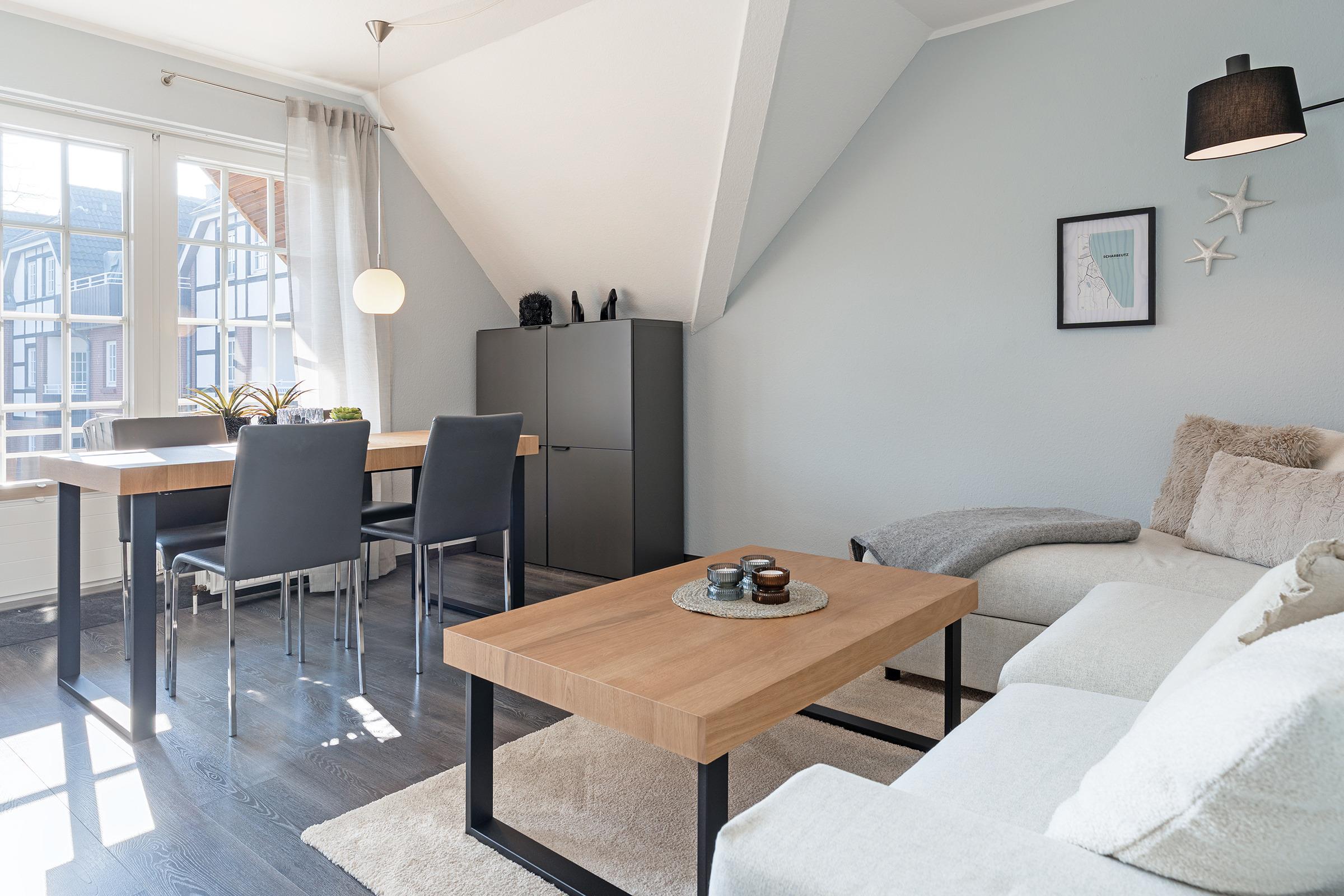Diese charmante Ferienwohnung in Scharbeutz ist der perfekte Ort für einen entspannten Ostseeurlaub. Nur ca. 200 m vom Strand entfernt, genießen Sie hier erholsame Tage am Meer. Der helle Wohnbereich ist gemütlich eingerichtet und mit einem TV sowie einem bequemen Sofa ausgestattet. Die große Fensterfront sorgt für eine freundliche Atmosphäre und bietet Ihnen einen schönen Blick ins Freie. Vom Wohnzimmer gelangen Sie direkt auf den überdachten Balkon mit Süd-West-Ausrichtung, der über Gartenmöbel verfügt und nach einem ausgiebigen Strandtag viel Entspannung verspricht.