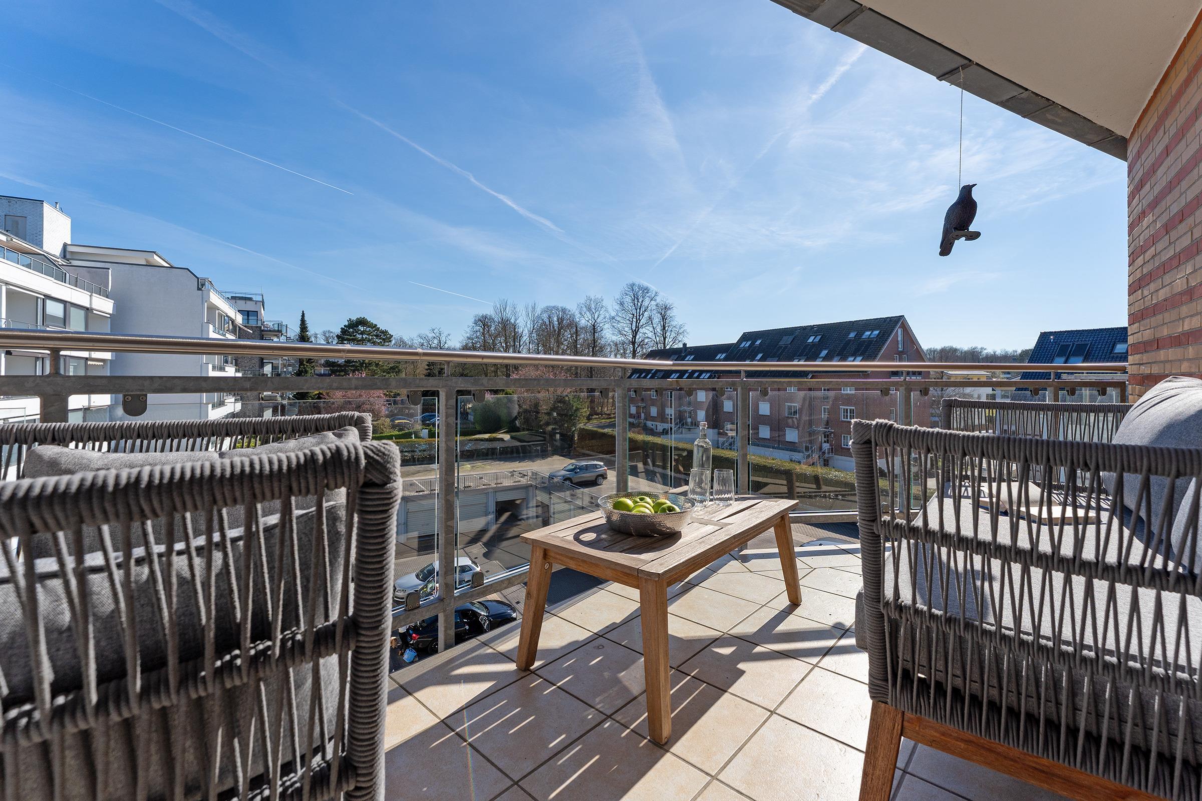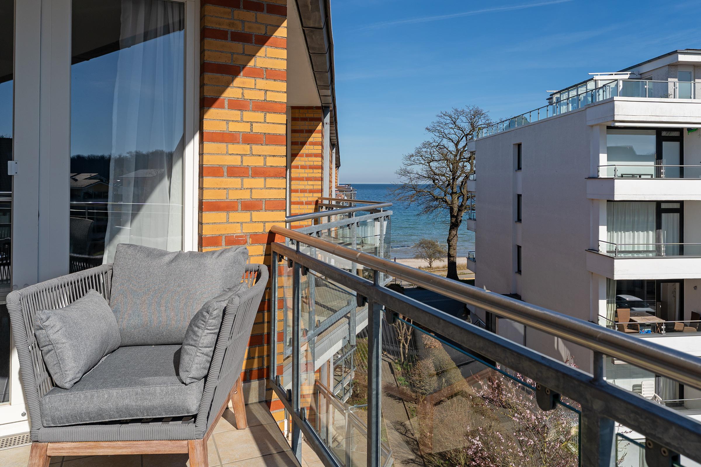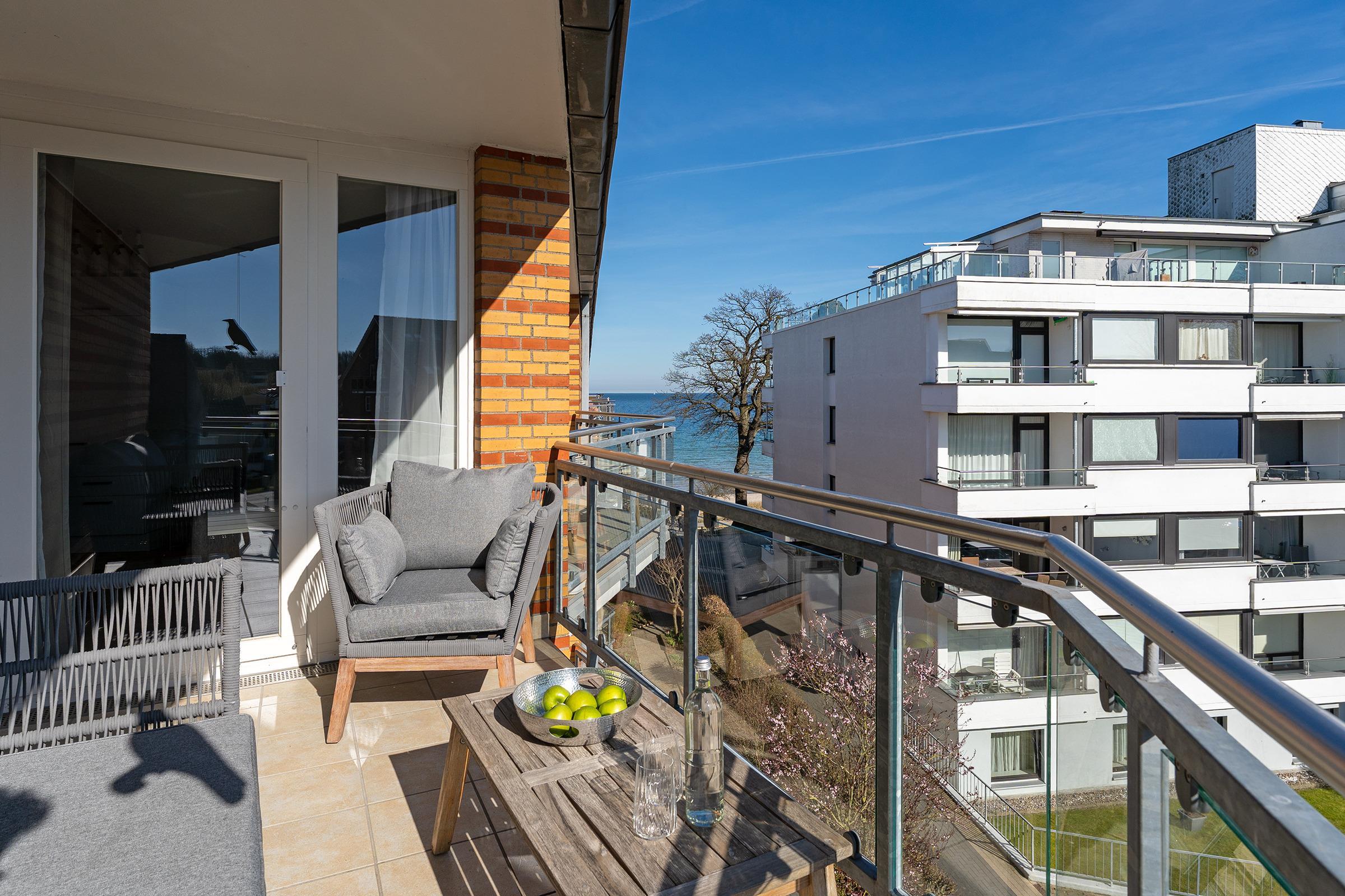 Diese stilvolle Ferienwohnung in Scharbeutz bietet modernen Komfort in bester Lage. Der helle Wohnbereich verfügt über eine gemütliche Sofaecke und einen Fernseher für entspannte Abende. Große Fenster sorgen für viel Tageslicht und eine angenehme Atmosphäre. Vom Wohnzimmer aus gelangen Sie auf den überdachten Balkon mit Gartenmöbeln, ideal für ein Frühstück an der klaren Meeresluft.
