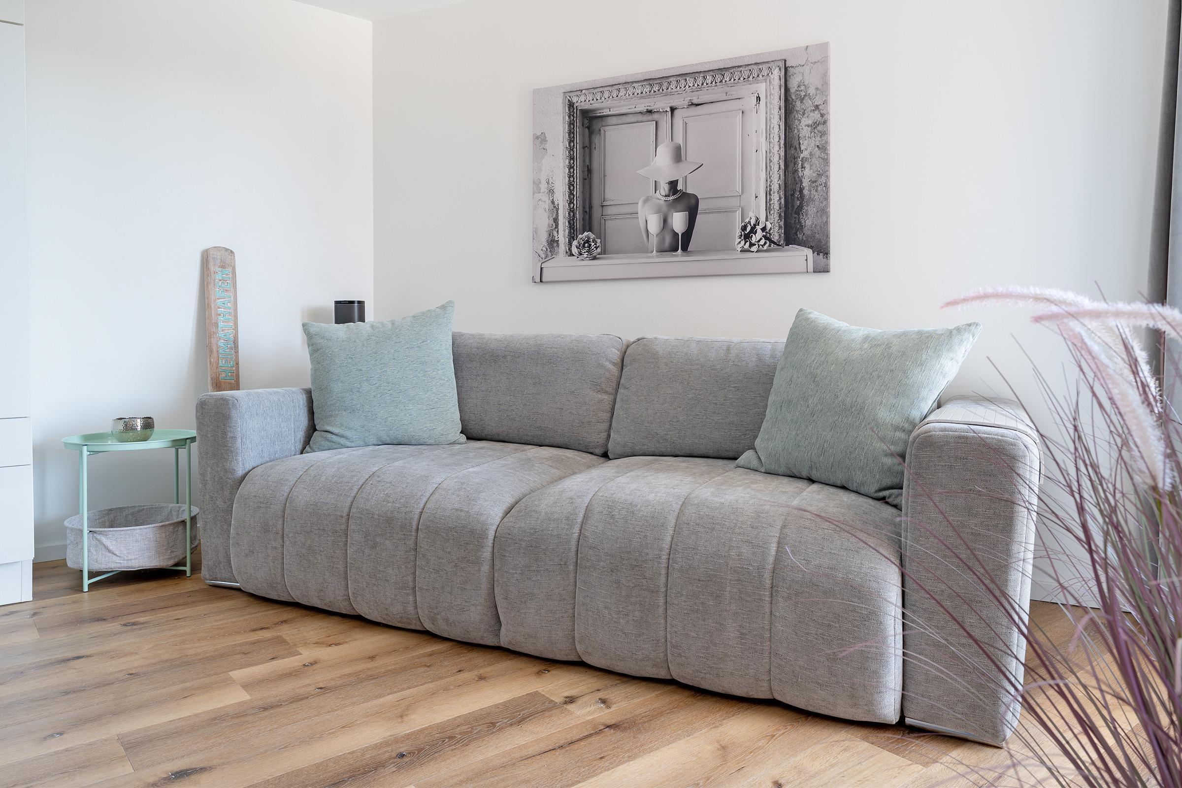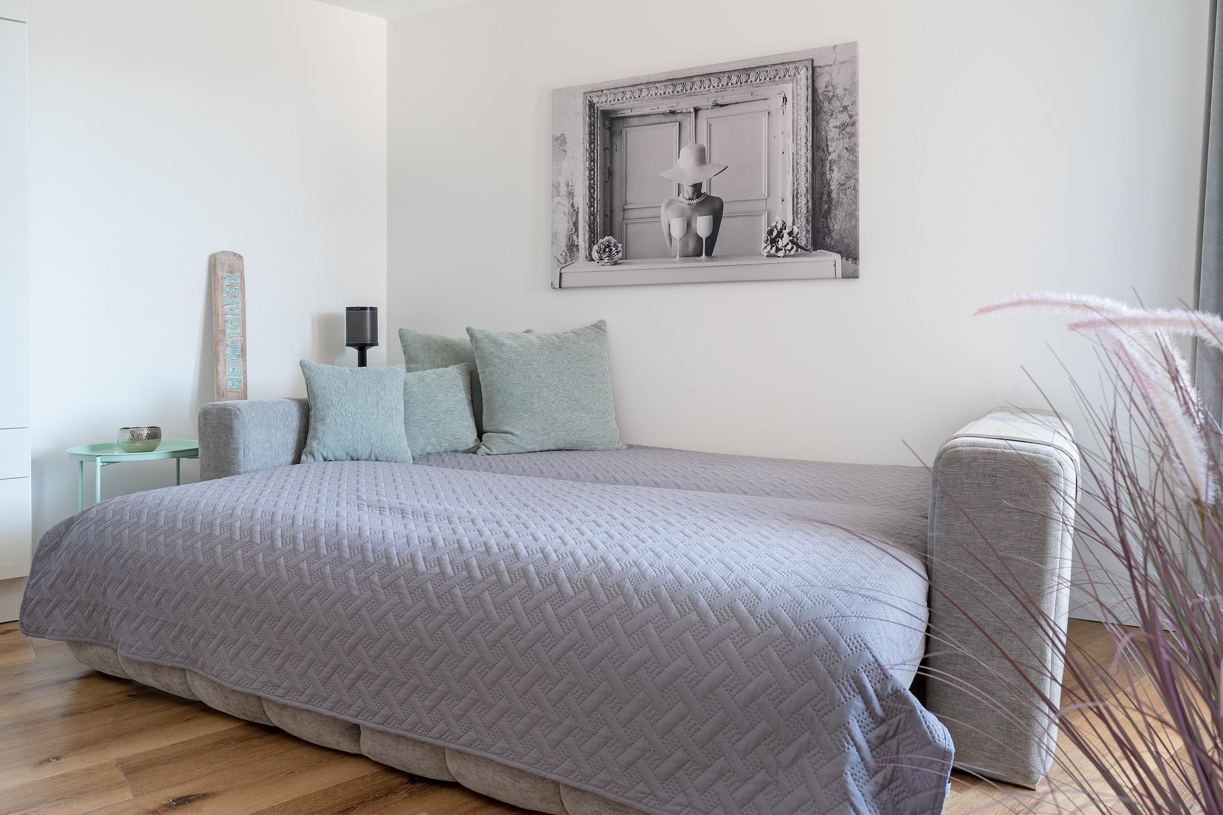 Das komfortables Schlafsofa bietet Raum für erholsame Nächte. Zusätzlich steht im Wohn-/ Schlafbereich ein gemütliches Doppelboxspringbett zur Verfügung.