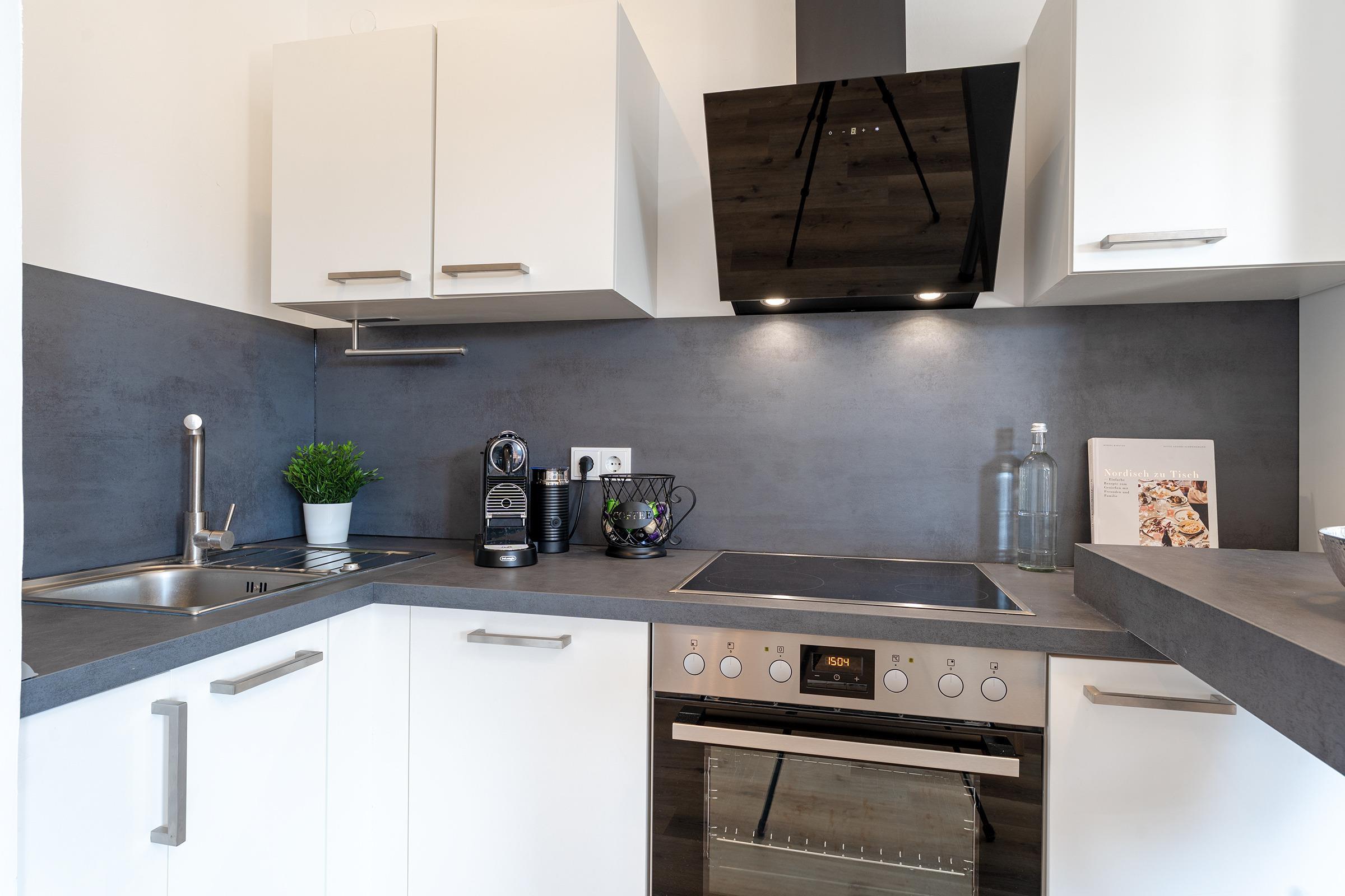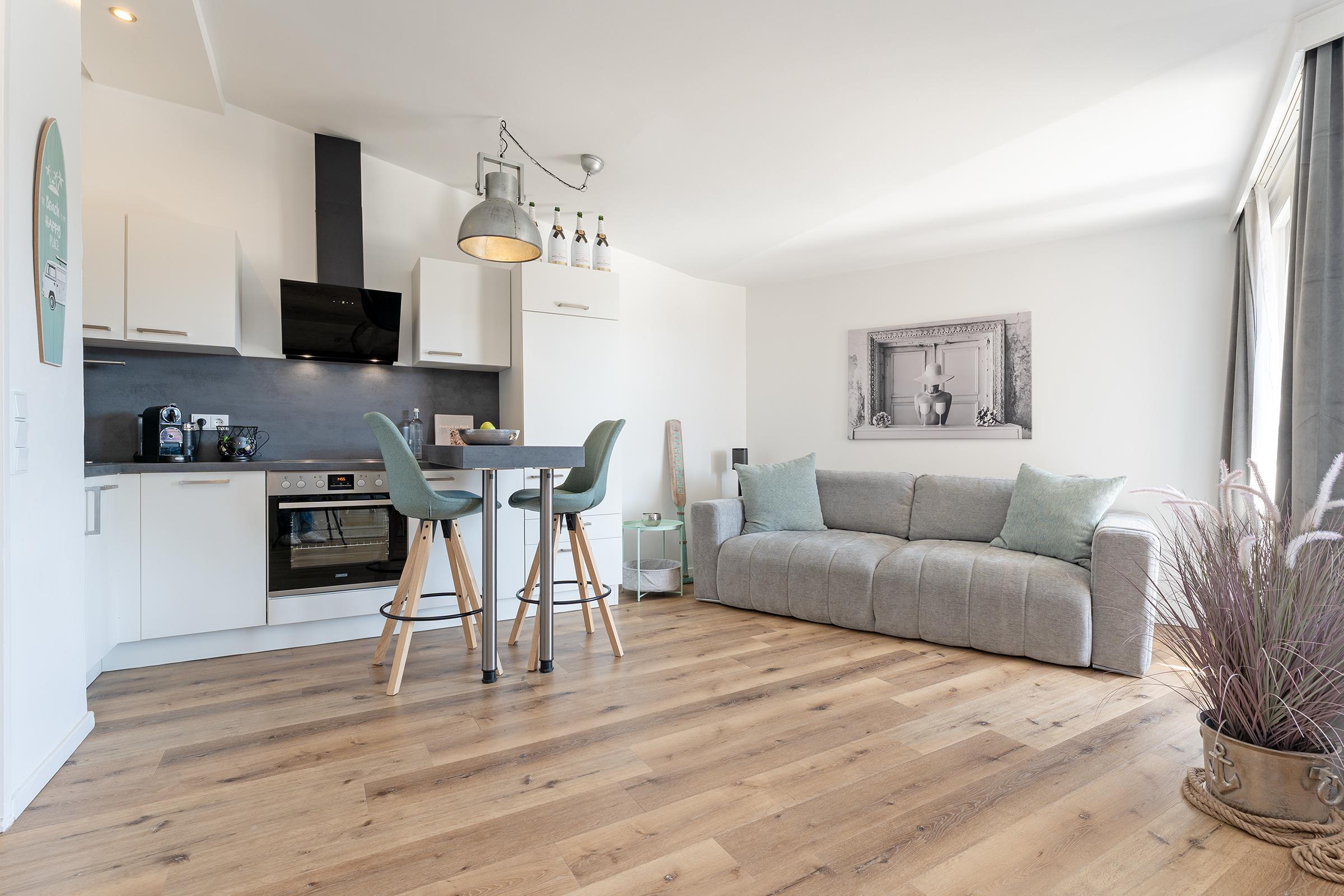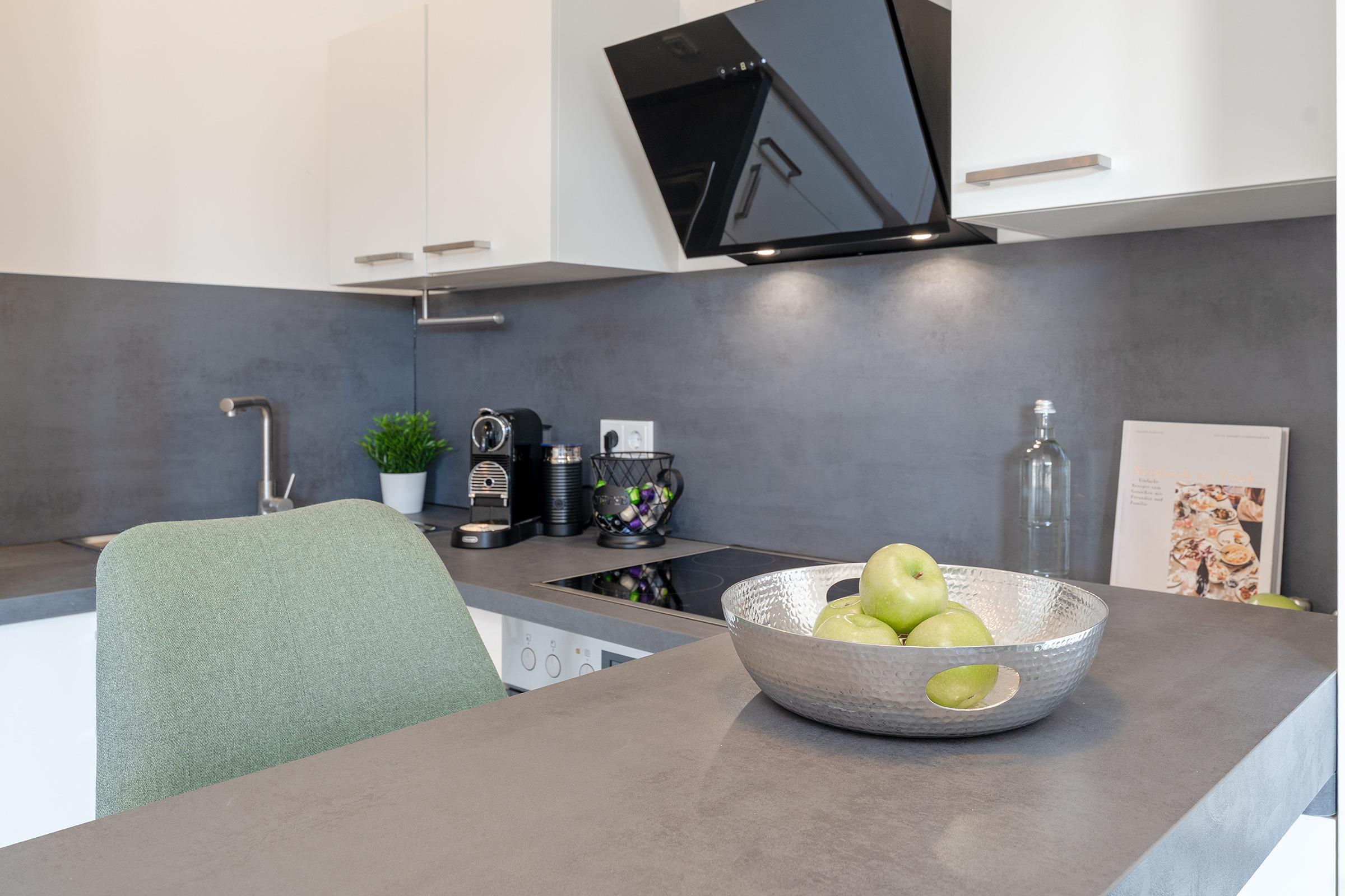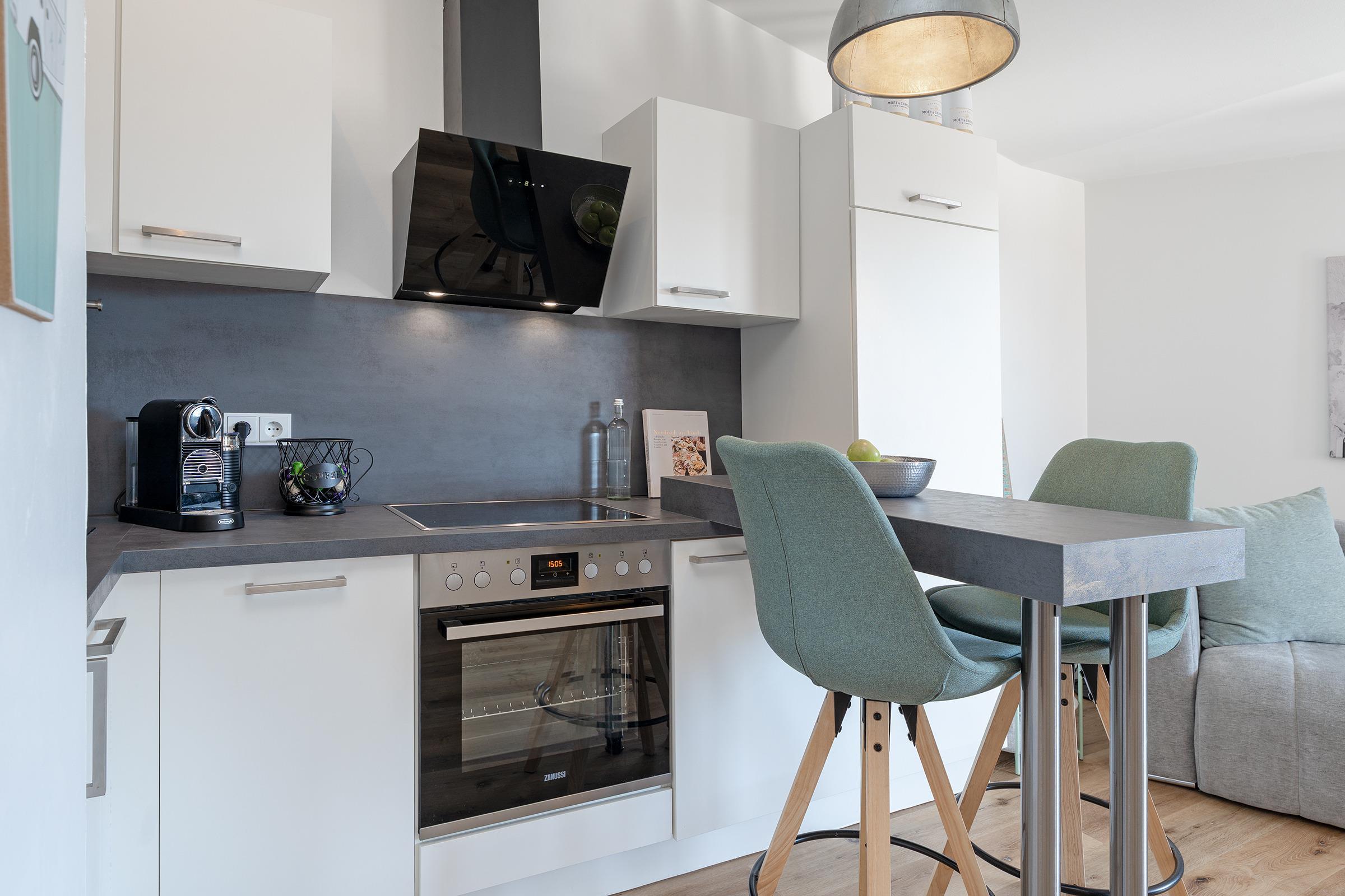 Die offene Küche ist voll ausgestattet mit Ceranherd, Backofen, Kühlschrank mit Gefrierfach, Spülmaschine, Nespressomaschine und Toaster. Der angrenzende Essbereich bietet ausreichend Platz für gemeinsame Mahlzeiten.