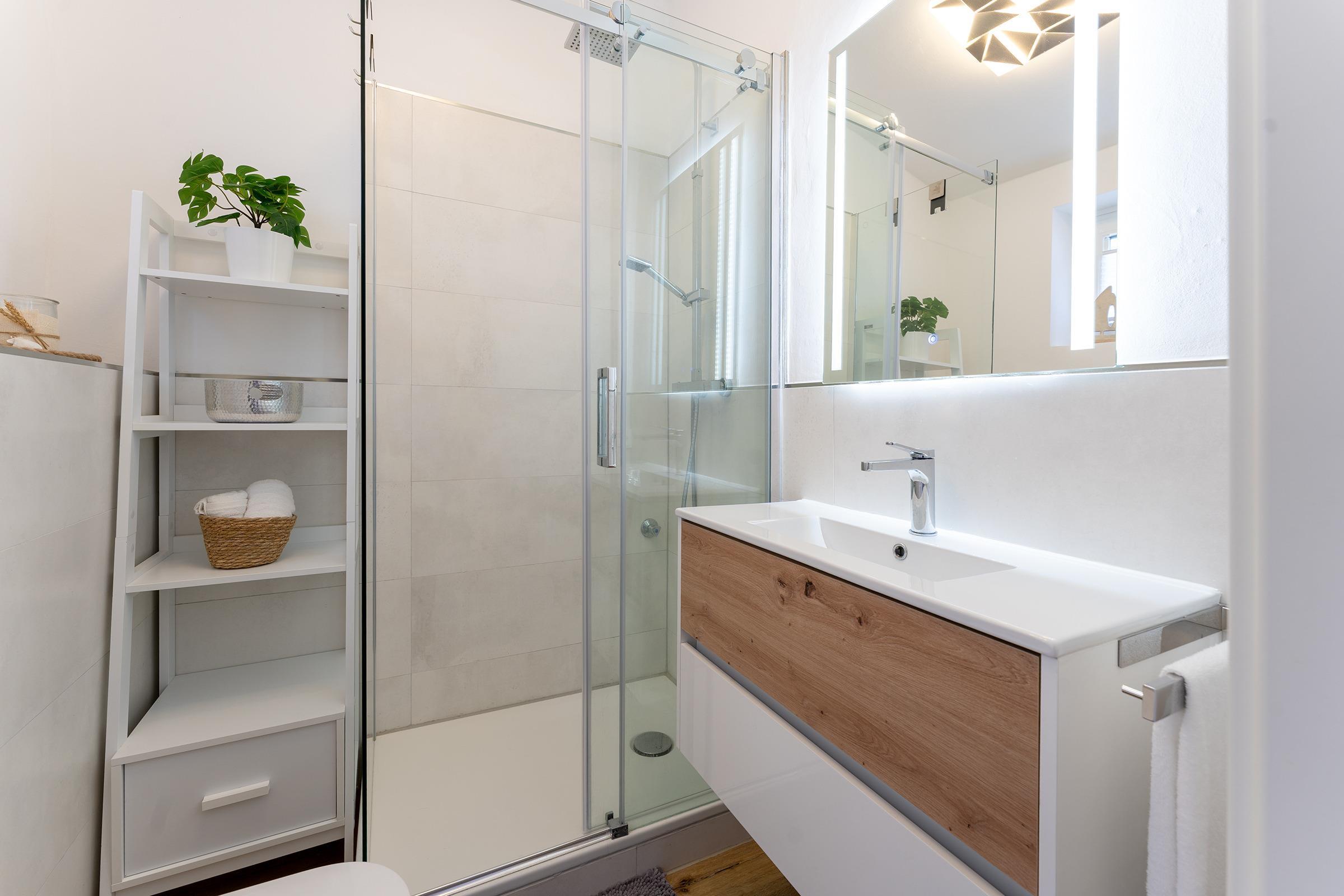 Das moderne Tageslichtbad verfügt über eine Dusche, ein Waschbecken und ein WC. Ein Haartrockner und eine Fußbodenheizung runden den Komfort ab.