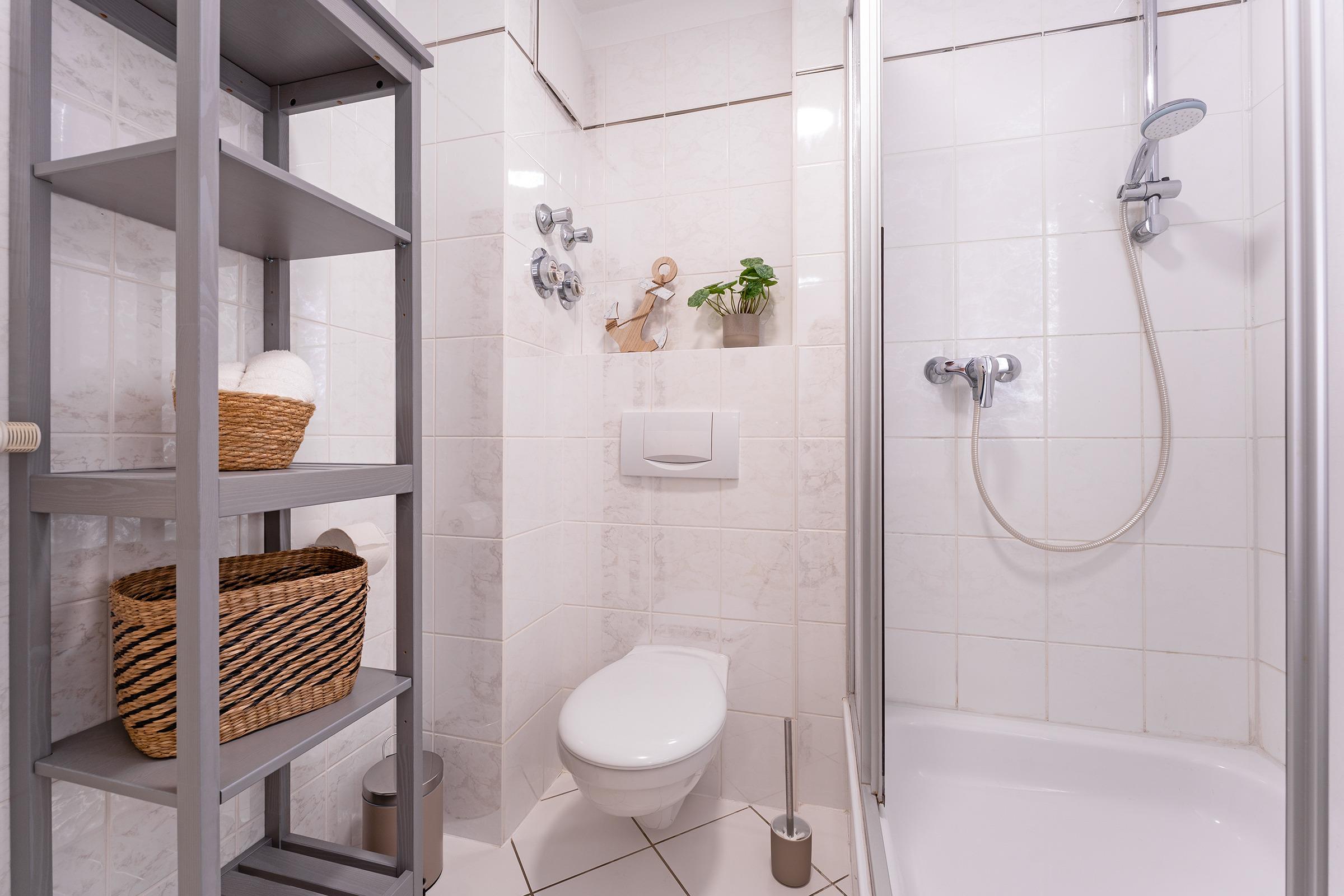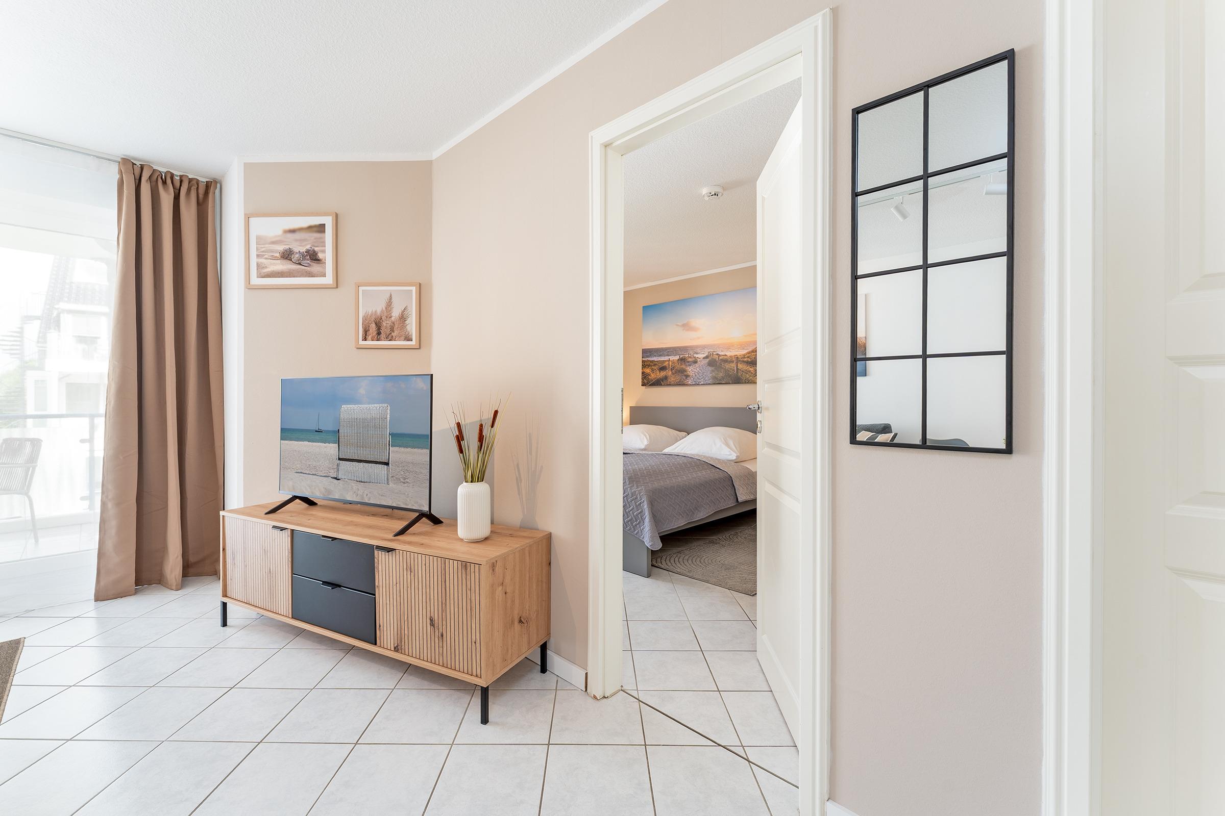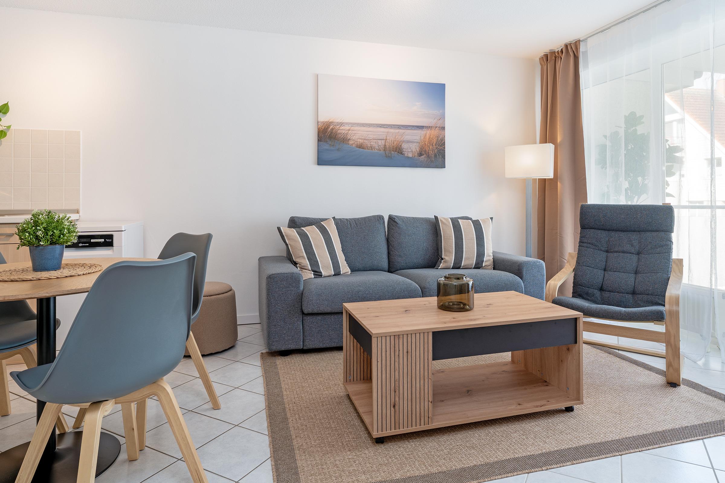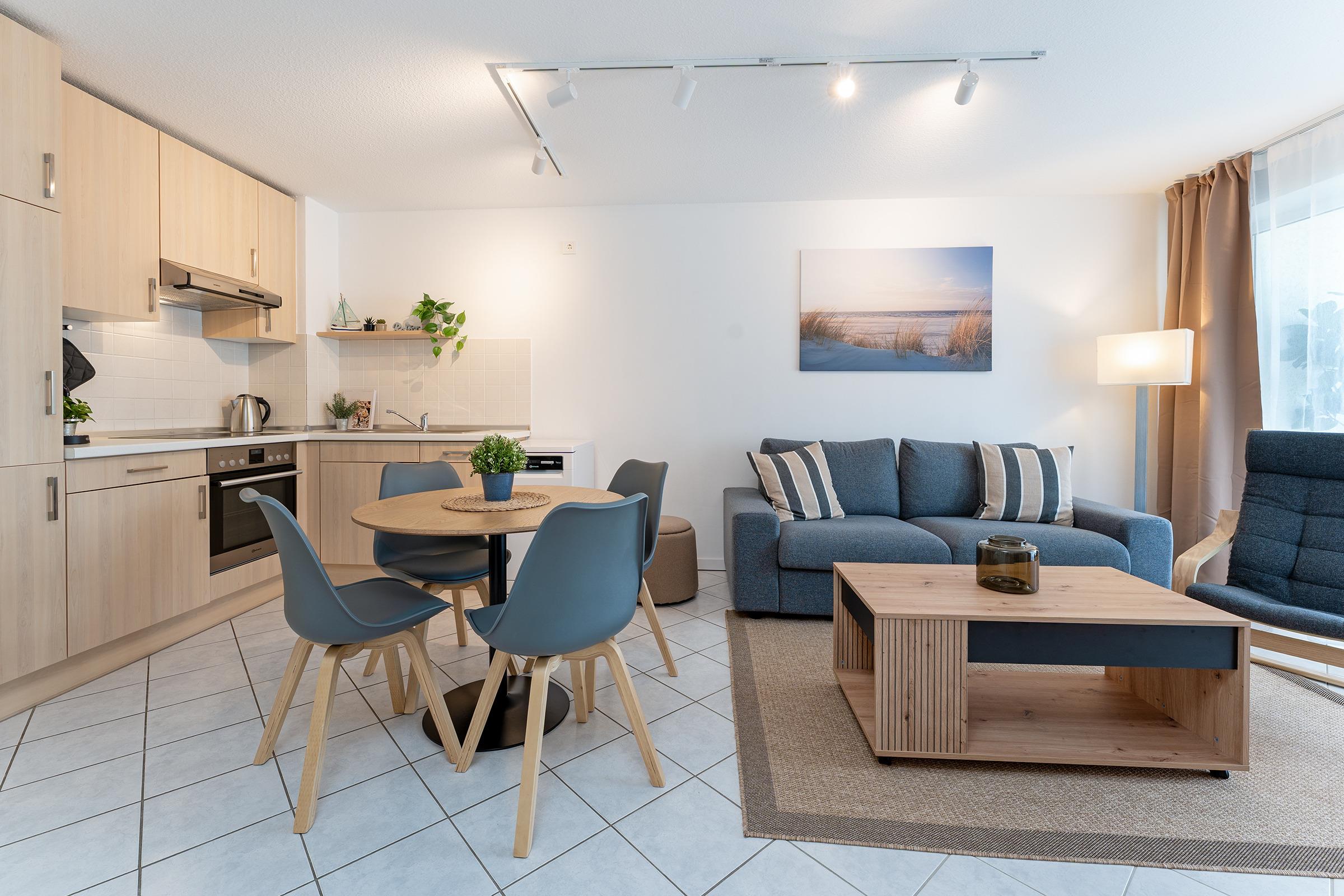 Ein helles und behaglich ausgestattetes Appartement erwartet Sie hier in der 2. Etage. Hier finden Sie ausreichend Platz für bis zu 2 Erwachsene und 1 Kind. Im Wohnraum befindet sich ein ausziehbares Schlafsofa, ein Smart-TV mit Streaming-Diensten zur Selbstanmeldung, eine komplette Einbauküche inklusive Nespresso-Kapselmaschine sowie Geschirrspüler und ein Essbereich. Ein separates Schlafzimmer mit einem Doppelbett (180x200 cm, 2 Matratzen) schließt sich an. Des weiteren verfügt die Wohnung über ein Duschbad/WC mit Haartrockner und einen Balkon. Der WLAN-Anschluss ist für Sie inklusive.