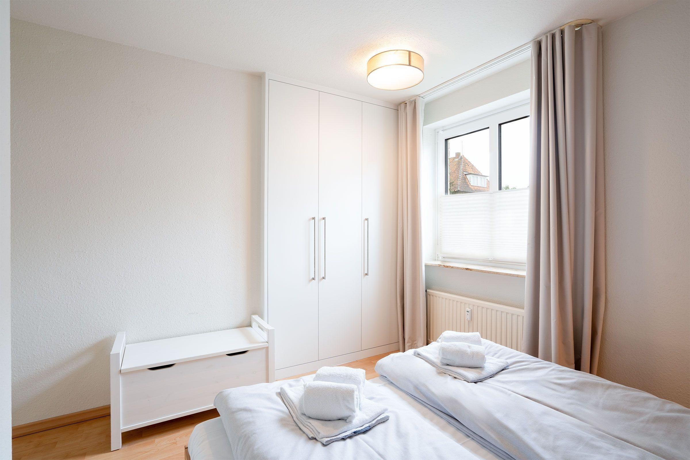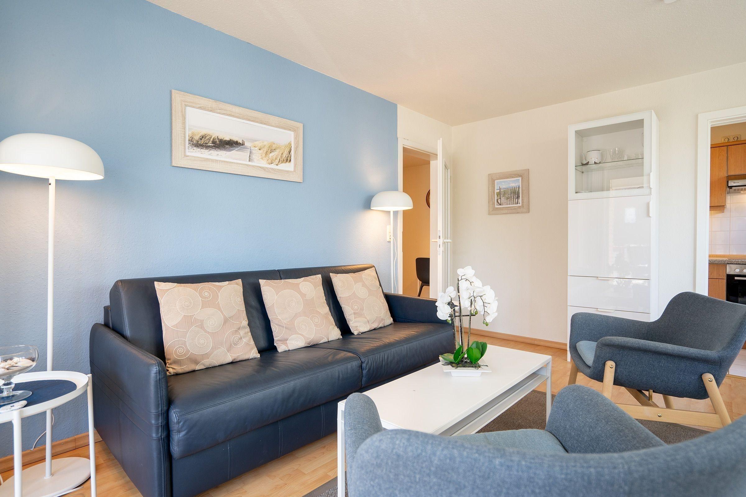 Die Ferienwohnung im "WITTHUS", Hansastraße 8, Wohnung 06, zeichnet sich durch eine ideale Lage in der Nähe der Promenade, des Strandes sowie zahlreicher Cafés und Restaurants aus. Das ca. 54 m² große 2-Zimmer-Komfort-Appartement bietet Platz für bis zu zwei Erwachsene und zwei Kinder. Im 1. OG gelegen, ist es mit hellem Laminat ausgestattet und verfügt über eine Diele, einen Wohn-/Essraum mit Schlaf-Ledersofa, TV und Radio sowie einer separaten Einbauküche mit Geschirrspüler und Mikrowelle/Grill. Das Schlafzimmer hat ein Doppelbett mit zwei einzelnen Matratzen und einen Kleiderschrank. Das Duschbad/WC rundet das Angebot ab. WLAN ist vorhanden, jedoch ohne Gewährleistung bei technischen Problemen. Die Nutzung eines PKW-Stellplatzes in der Tiefgarage ist inklusive, dabei sind jedoch bestimmte Fahrzeugdimensionen und -arten zu beachten.