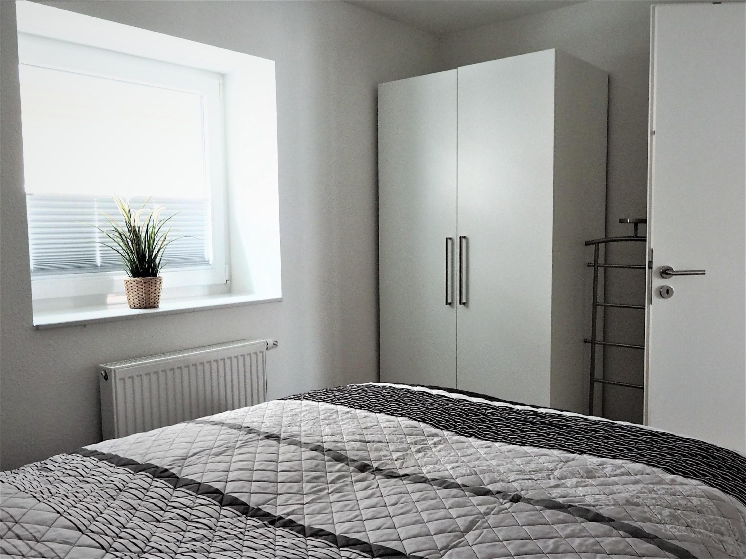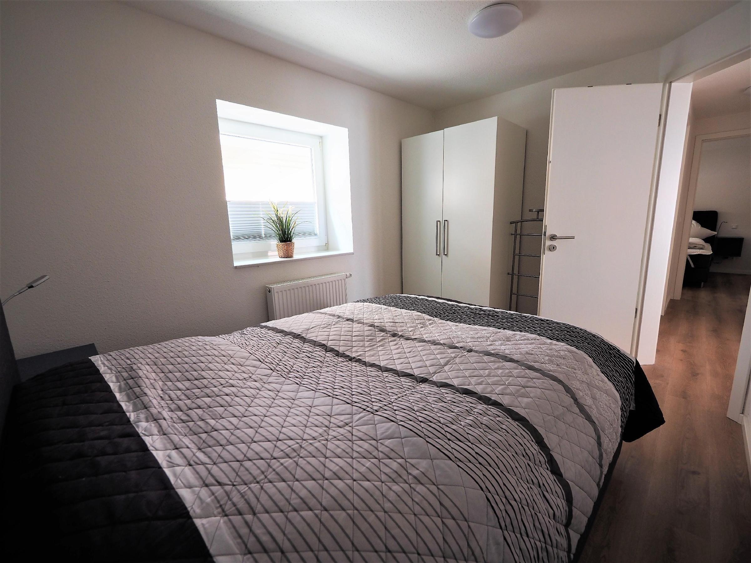 Das Badezimmer verfügt über eine sehr flache Dusche mit beweglichen Glaselementen, einen Wäschetrockner sowie eine Ablagefläche und einen Stuhl. Schlafzimmer 1 ist mit einem offenen Kleiderschrank, einem Boxspring Doppelbett (1,80 x 2,00 m) und einem Herrendiener ausgestattet. Schlafzimmer 2 hingegen bietet ein Boxspring Doppelbett (1,60 x 2,00 m) sowie einen Kleiderschrank.