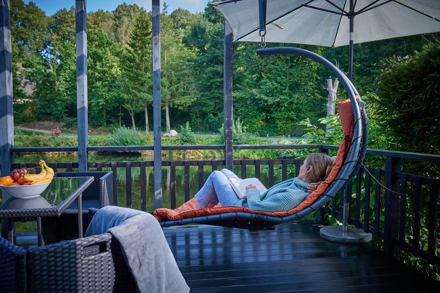 Das Haus steht direkt am See mit einer Terrasse, die zum Teil über das Wasser ragt. Im Innern der Häuser erwartet Sie eine geniale Ausnutzung der Wohnfläche, mit Wohn-Ess-Küchenbereich, einem Schlafzimmer und einem Bad. Die gut ausgestattete Küche verfügt u.a. über zwei Kochplatten, einen Kombi-Ofen mit Mikrowellen- und Ofenfunktion und eine Spülmaschine. Das gemütliche Sofa im Wohnzimmer lässt sich im Handumdrehen zu einem Schlafplatz umbauen. Familien mit Kindern können auf Wunsch ein Kinderbett und einen Kinderhochstuhl bestellen. Auf der Terrasse macht man es sich am besten in der Hängematte bequem und lässt Beine und Seele baumeln.
