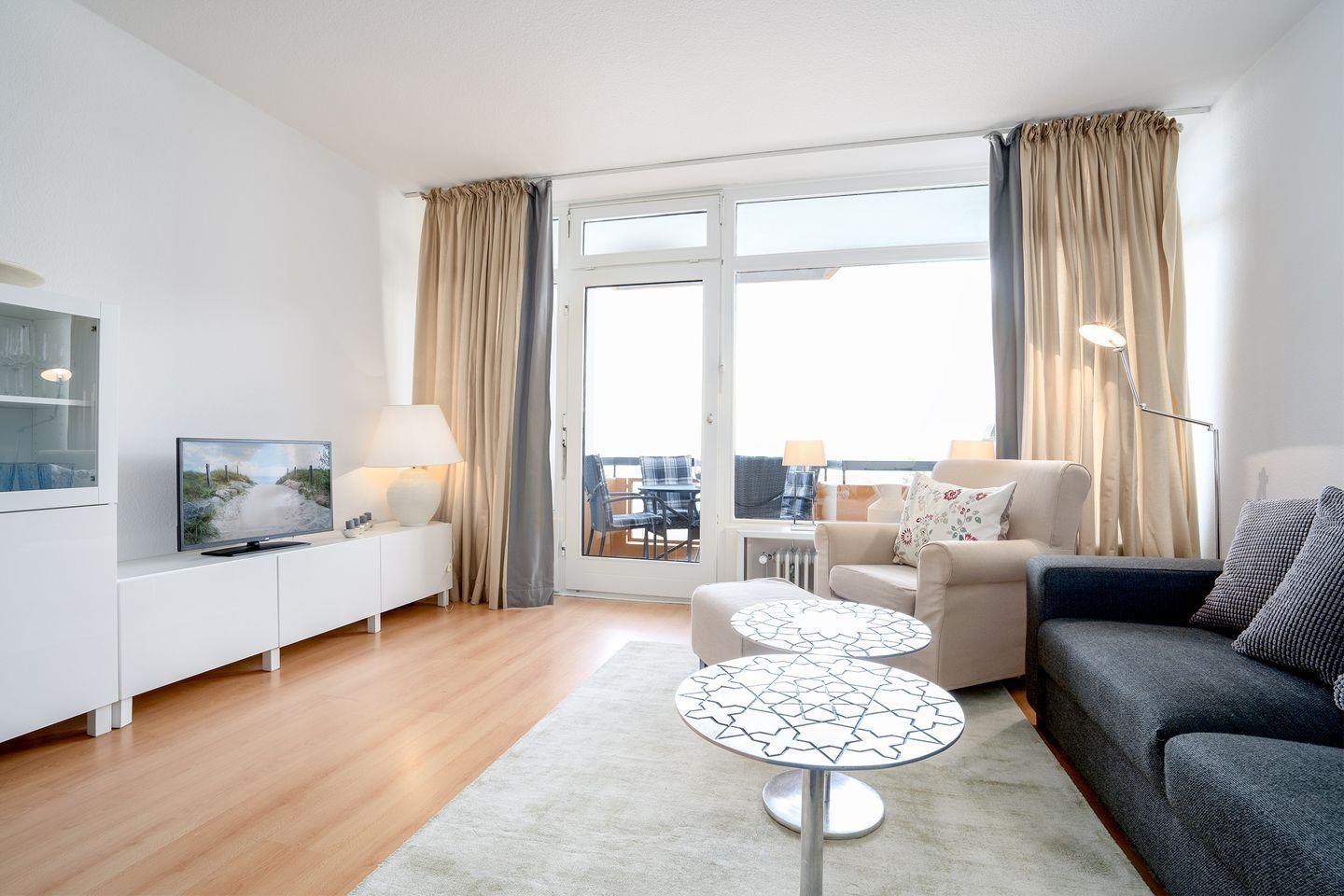 Freuen Sie sich auf einen schönen Blick aus der 1. Reihe auf die Ostsee. Meer und Strand wenige Schritte entfernt und direkt im Blick – ob vom großen Balkon oder vom Wohnbereich.