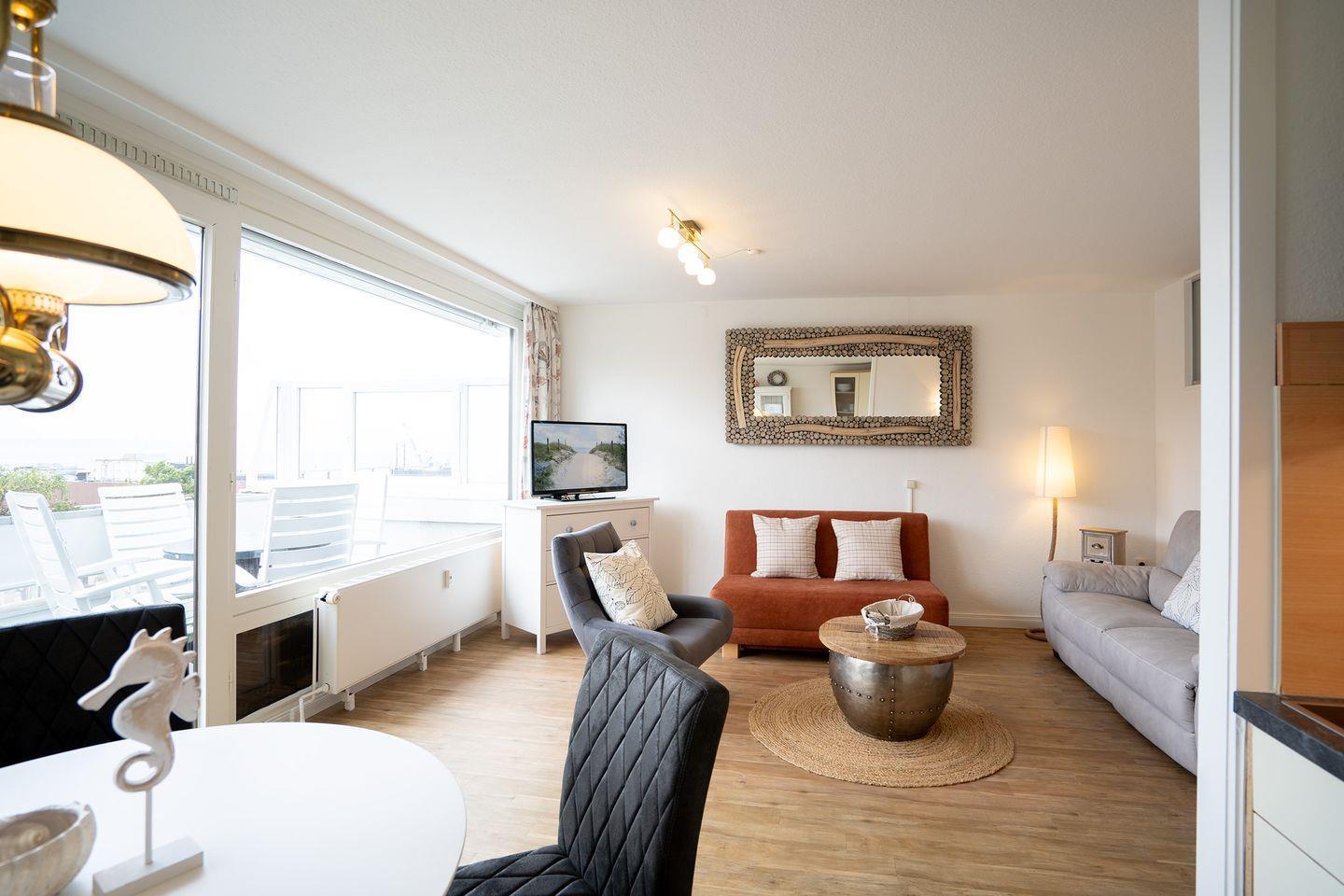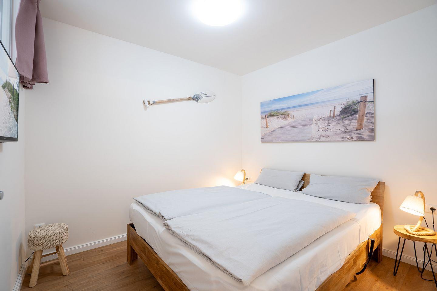 Das 58 qm große 2-Zimmer-Appartement liegt im 3. OG und ist bequem mit dem Lift erreichbar. Von der großen Sonnenterrasse haben Sie einen schönen Blick aufs Meer und eine Markise schützt vor der Sonne. Der Wohnraum ist mit einem hochwertigen PVC-Boden ausgelegt und es gibt eine Ledergarnitur, Sessel, Couchtisch, TV, sowie eine neue Schlafcouch für eine Person (1,40 x 2m). Die offene Einbauküche ist unter anderem mit Geschirrspüler und Mikrowelle nebst Essplatz ausgestattet. Im Schlafraum finden Sie ein gemütliches Doppelbett (1,60 x 2 m / Einzelmatratzen). Das Bad verfügt über eine Eckdusche, Waschtisch, WC, sowie einen Föhn. Das Rauchen und Tierhaltung sind nicht erlaubt, wir bitten um entsprechende Beachtung! Der PKW-Außenstellplatz ist inklusive. Waschmaschine und Trockner sind im Haus gegen Gebühr nutzbar. Auch das WLAN ist inkl., die Nutzung erfolgt jedoch auf eigene Verantwortung (bei Störung kein Ersatzanspruch).