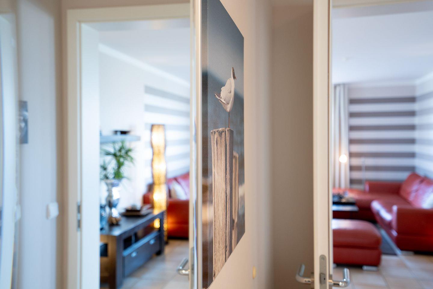 Ein großzügiger Eingangsbereich mit Garderobe und hellem Fliesenboden, der im gesamten Appartement verlegt wurde, heißt Sie Willkommen. Vom Flurbereich gelangen Sie in alle weiteren Räumlichkeiten. Der große Wohnraum bietet ein Ledersofa mit einem Hocker, Glastisch, Anrichte, 48 Zoll Smart TV, Video, Multifunktions-Stereo-Anlage, CD-Player, DVD- Player, Radio und USB. Die offene, moderne Einbauküche bietet eine Komplettausstattung, wie Geschirrspüler, Backofen, Mikrowelle, Babyflaschenwärmer und sämtliche Kochutensilien, die angehende Profi-Köche benötigen. Der großzügige Essplatz hat ausreichend Platz für vier Personen. Vom Wohnraum gelangen Sie auf die große Sonnenterrasse und genießen hier die „Morgensonne“.