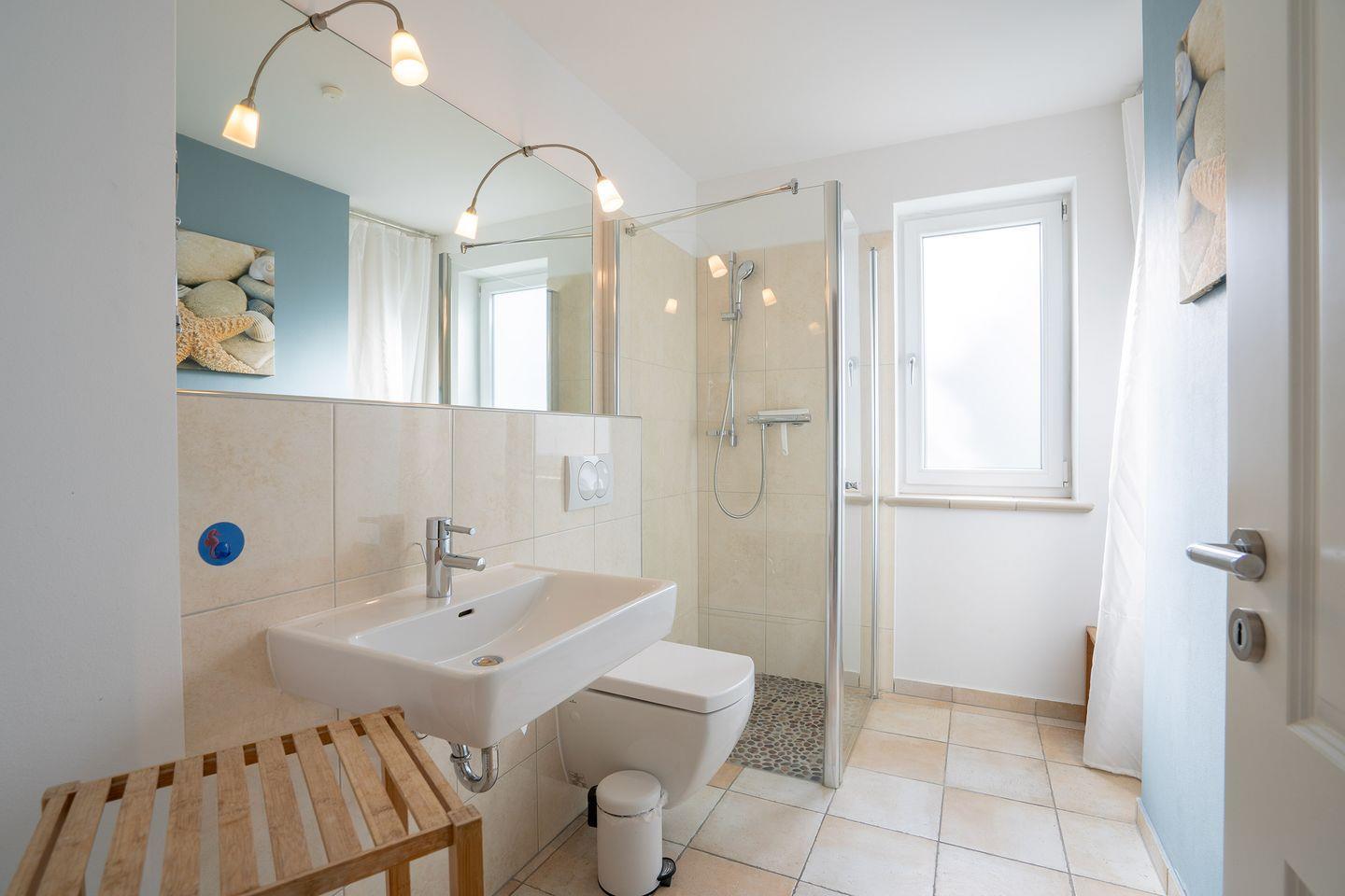 Das Appartement verfügt über ein hell gefliestes Badezimmer mit ebenerdiger Dusche, Waschtisch und WC sowie über ein separates Gäste-WC. Ein Kinderreisebett, ein Kindersitz zum Anhängen an den Esstisch, ein „Trip Trap“-Kinderhochstuhl, sowie ein Kindertisch mit zwei Stühlen sind ebenfalls vorhanden.