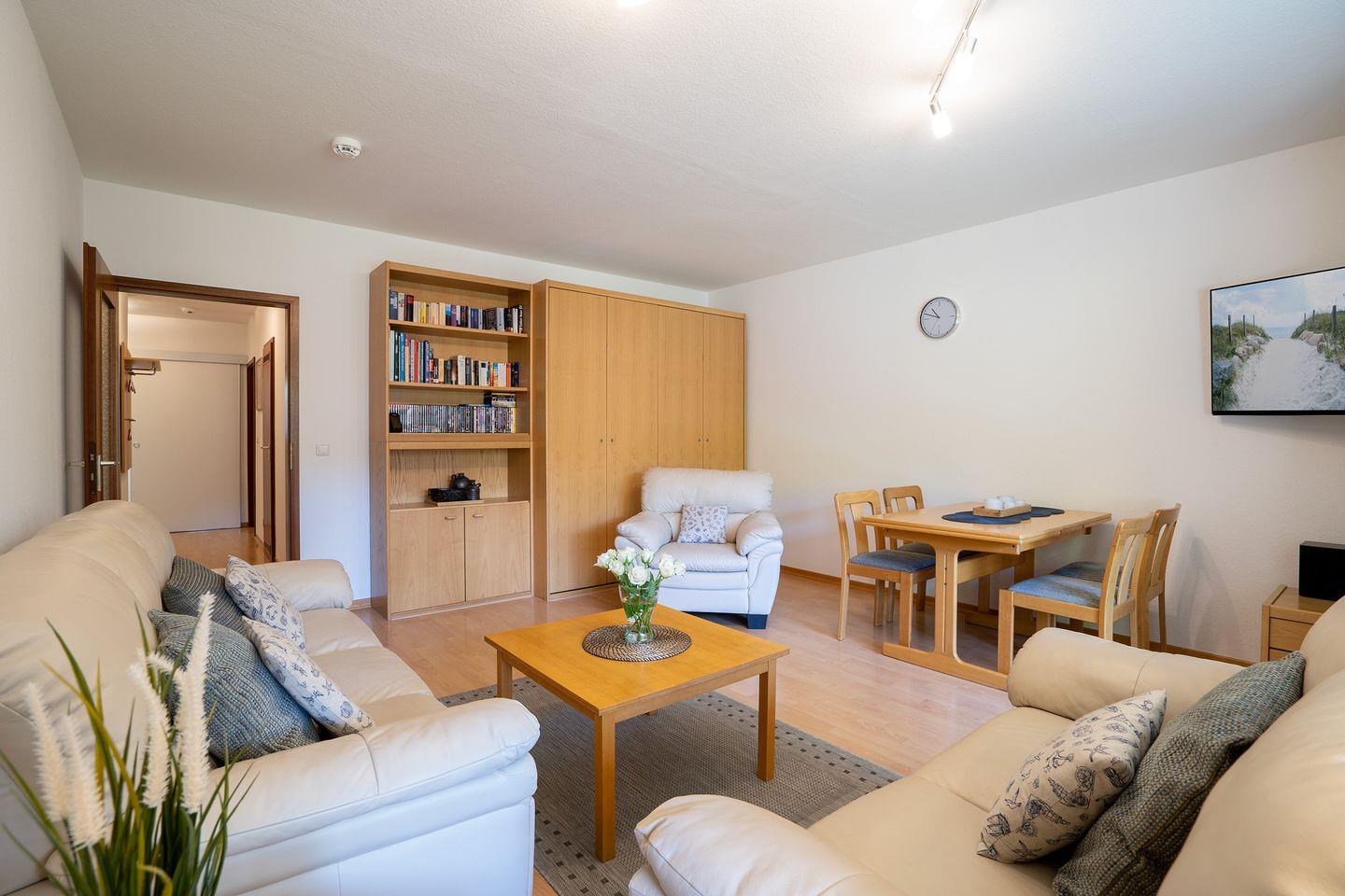 Die Wohnung besticht mit ihrem großzügigen, hellen Wohnraum und dem herrlichen Sonnenbalkon. Sie ist mit einer hellen Ledergarnitur, einem Couchtisch, 48“ LCD-Fernseher und Musikanlage ausgestattet.