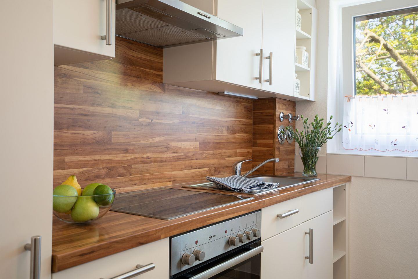 Die separate Einbauküche verfügt über einen Essplatz und Ceranfeld, Spülmaschine, Mikrowelle, Filter-Kaffeemaschine,