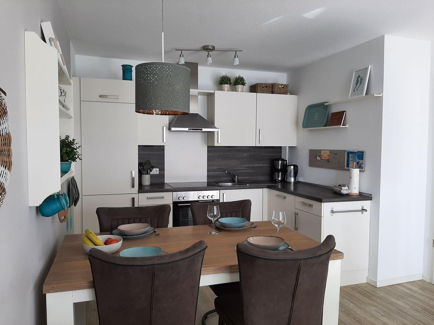 55" Smart TV, DVD-Player, Bose Sound Touch (Radio, Bluetooth Box), kostenloses WLAN High Speed Internet (bis zu 100 Mbit/s). Großes Ecksofa mit Schlaffunktion - ausklappbares Bett mit separater Matratze 1,60 x 2,00 m. Ausgang auf den Süd-Balkon mit Sitzmöbeln.