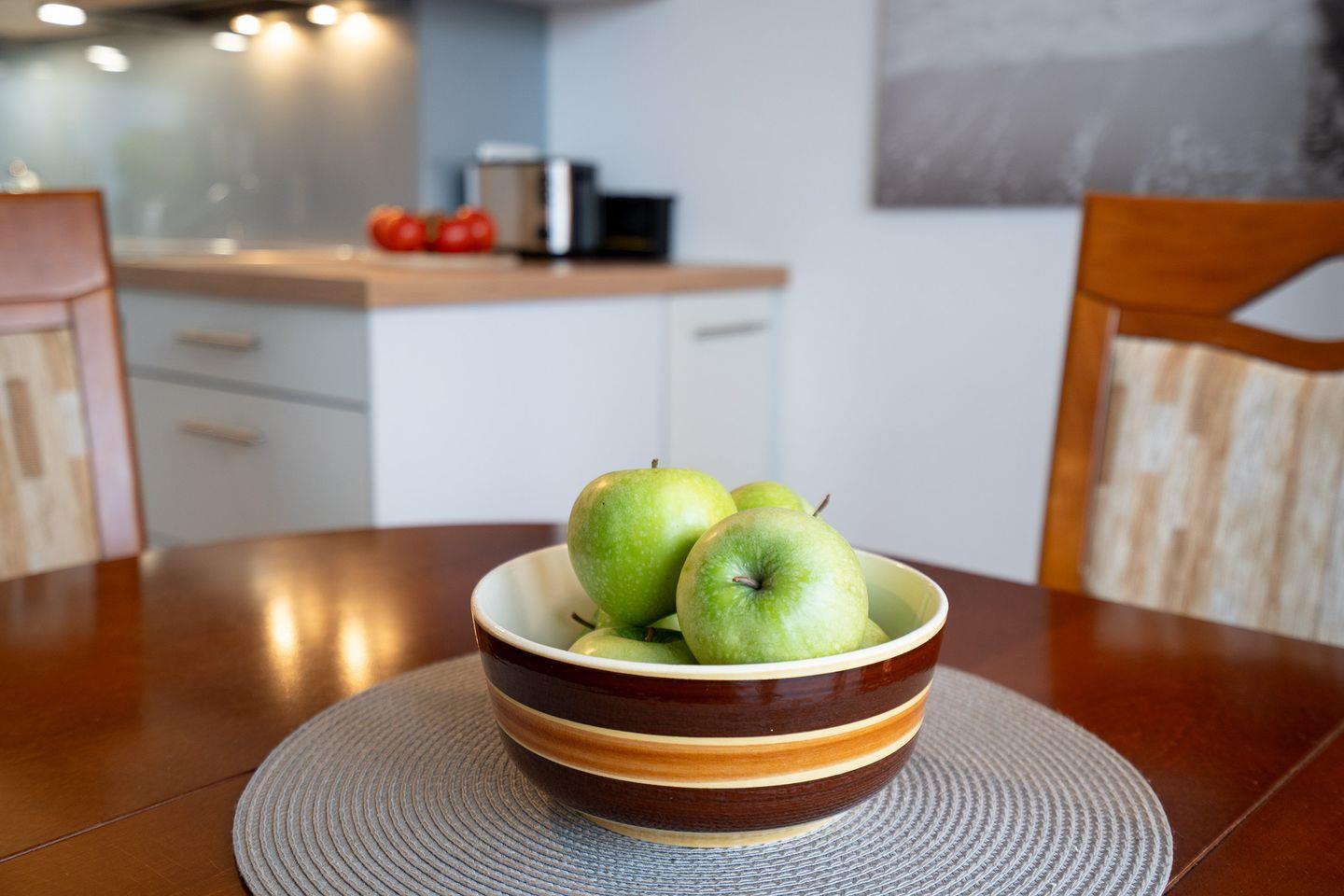 Der Wohnraum ist mit einem Designbodenbelag in Holzoptik ausgelegt. Es gibt eine Ledergarnitur mit einem Sessel, Couchtisch, Flachbild-TV, sowie ein Schrankbett. Die WLAN-Nutzung ist inkl. (bei Störung kein Ersatzanspruch). In der Einbauküche befindet sich ein Geschirrspüler, eine Mikrowelle, sowie einen Ofen. Am Essplatz ist Platz für drei Personen.