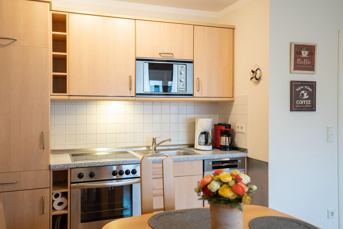 Ein großer Balkon mit Nachmittagssonne, ein lichtdurchfluteter Wohnraum mit Laminatboden alles lädt zum Bleiben ein. Im Wohnzimmer gibt es ein Polstersofa, welches auch als Schlafsofa umwandelbar ist, zwei Sessel, einen Couchtisch, einen großen Flachbild-TV, sowie ein Radio mit CD- DVD-Blue-Ray-Player. Die moderne, integrierte Einbauküche ist u.a. mit Geschirrspüler, Mikrowelle, Senseo-Kaffeepad-Automat und einer Kaffeemaschine ausgestattet. Der Essplatz bietet Platz für 4 Personen.