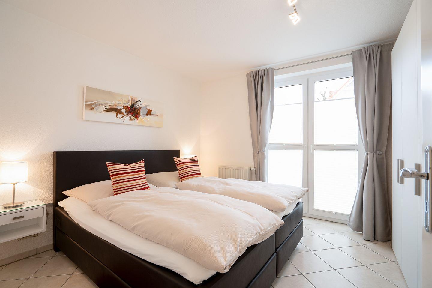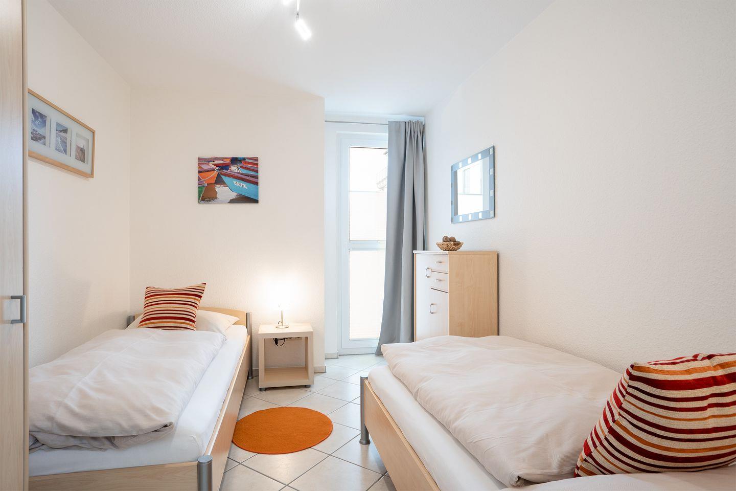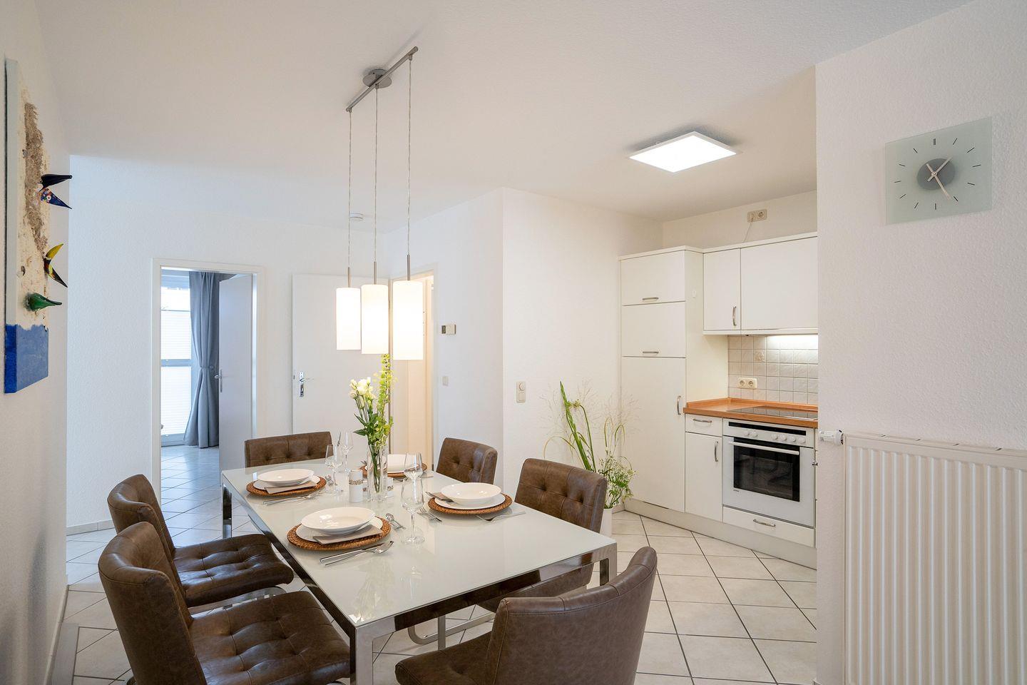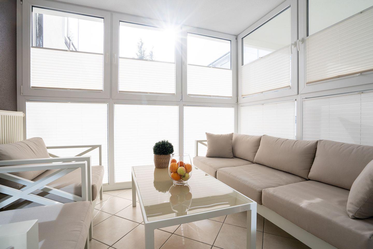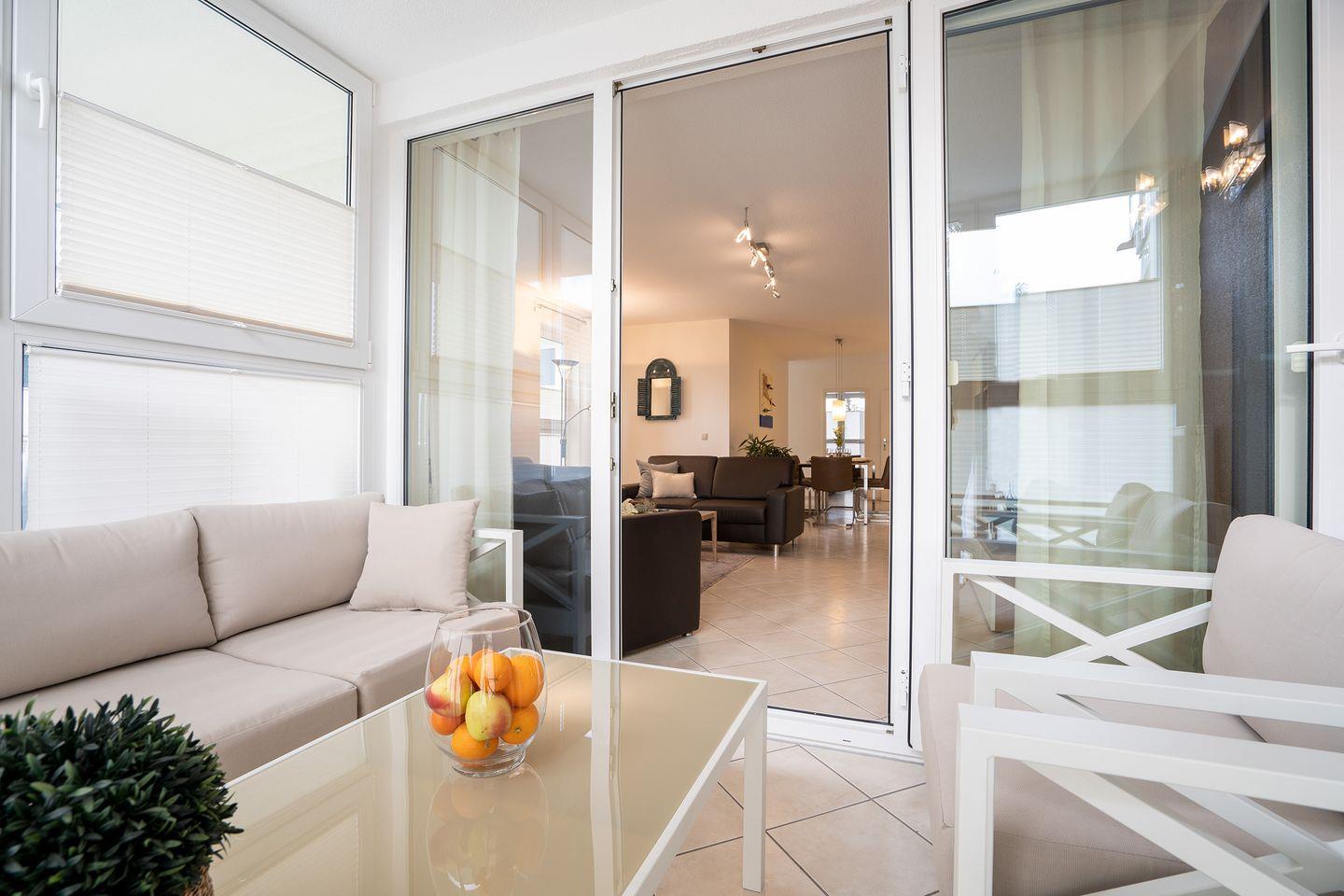 Die helle 3-Raum-Ferienwohnung Nr.4 mit Wintergarten und Balkon befindet sich in der 1. Etage und bietet auf 80 qm Urlaubskomfort für die ganze Familie. Der stilvolle Wohn- und Essbereich mit voll ausgestatteter Küche bildet das Zentrum der sehr schönen Wohnung. Der erste Schlafraum ist mit einem Boxspringbett ausgestattet, im zweiten Schlafraum stehen zwei Einzelbetten. Das moderne Bad verfügt über eine Dusche. Der Strand und die Promenade sind weniger als 5 Gehmin. entfernt. WLAN inklusive.