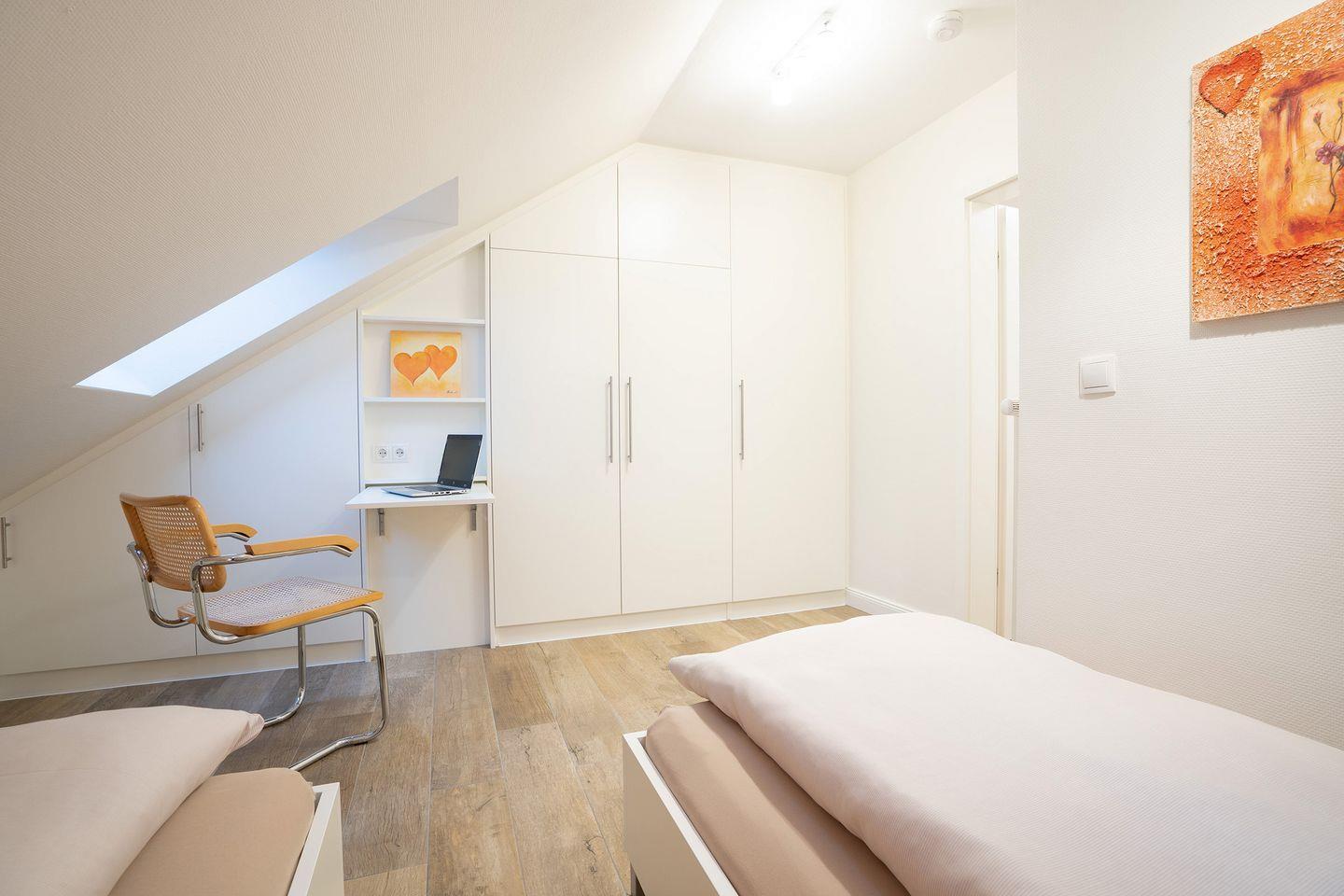 Die 3-Raum-Ferienwohnung Nr.10 befindet sich in der 3. und 4. Etage und verbreitet auf 90 qm Urlaubskomfort für die ganze Familie. Die 4. Etage ist auch das oberste Stockwerk und bietet daher Penthouse-Feeling. Wohnzimmer, Essbereich, Wintergarten, sowie ein Duschbad sind in der 3. Etage. Die Küche ist voll ausgestattet. Die beiden Schlafräume (1x Doppelbett mit TV, 1x zwei Einzelbetten) und ein Wannenbad sind in der 4. Etage. WLAN inklusive. Zum Strand und zur Promenade sind es nur 5 Gehmin.