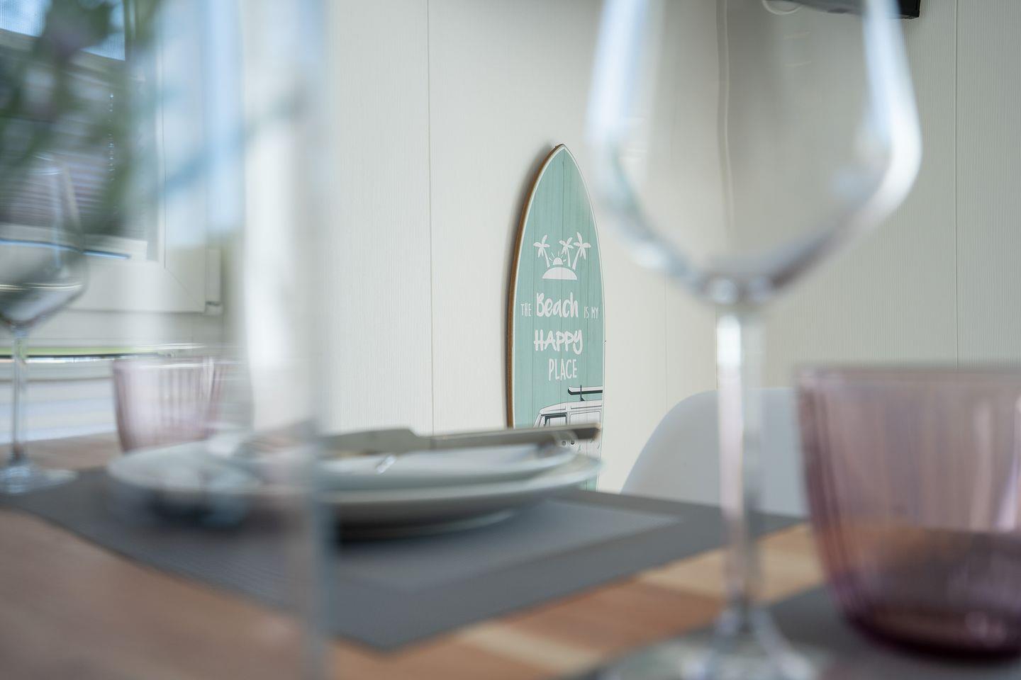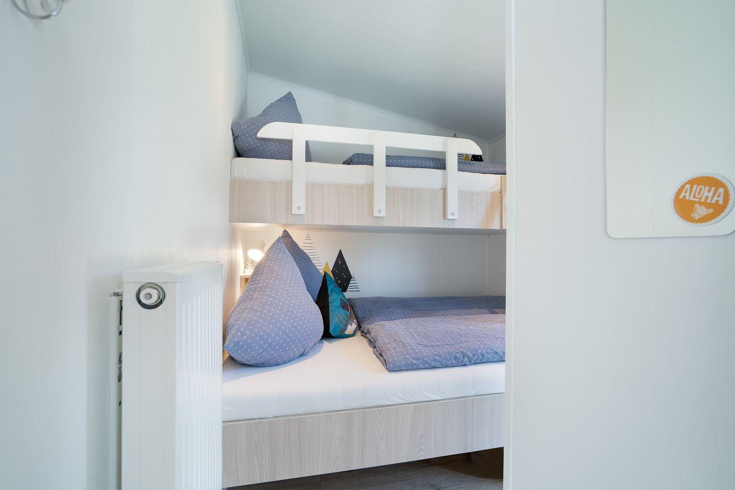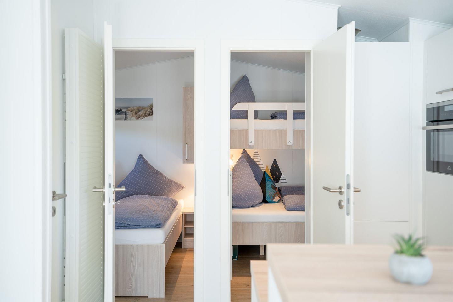 Das Mobilheim verfügt über eine gehobene Ausstattung mit 2 Schlafzimmern, einem liebevoll eingerichteten Wohn-/Essbereich mit moderner Küchenzeile (Kühlschrank mit Gefrierfach, Spülmaschine, Ceranfeld, Mikrowellen-Kompaktbackofen, Kaffeemaschine, etc.), sowie einem Badezimmer mit großer Dusche. Im Wohnbereich befindet sich der Essplatz für 4 Personen sowie ein Ecksofa und ein Flachbild-TV. Die beiden Schlafzimmer verfügen über ein Doppelbett (1,60 x 2,00 m) und ein Bunk-Bett (1,40 x 2,00 m, sowie 0,80 x 2,00 m).