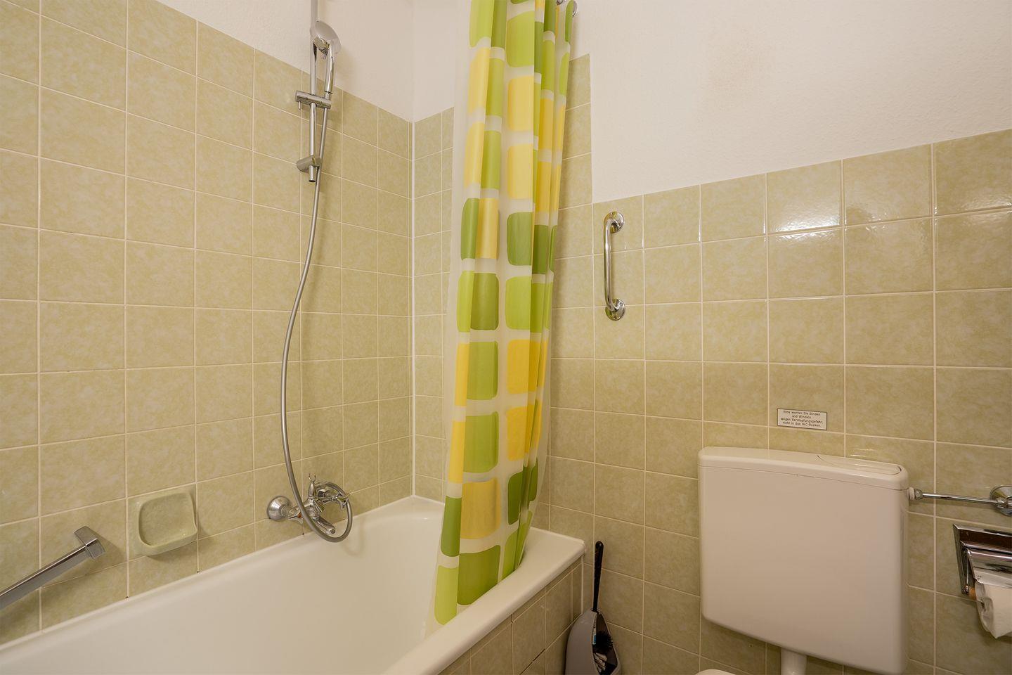 Im Badezimmer befindet sich eine Badewanne, Waschbecken sowie WC.