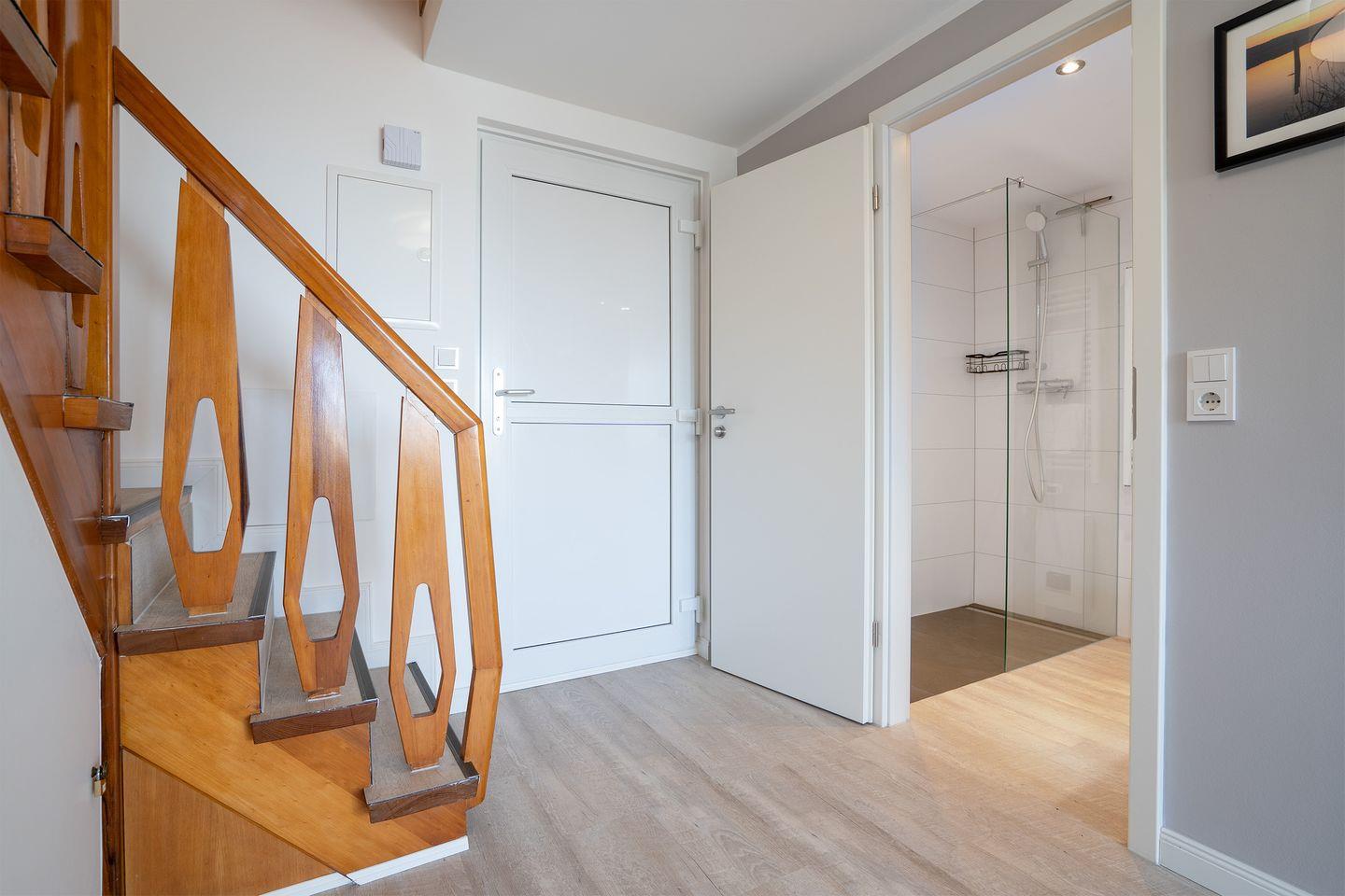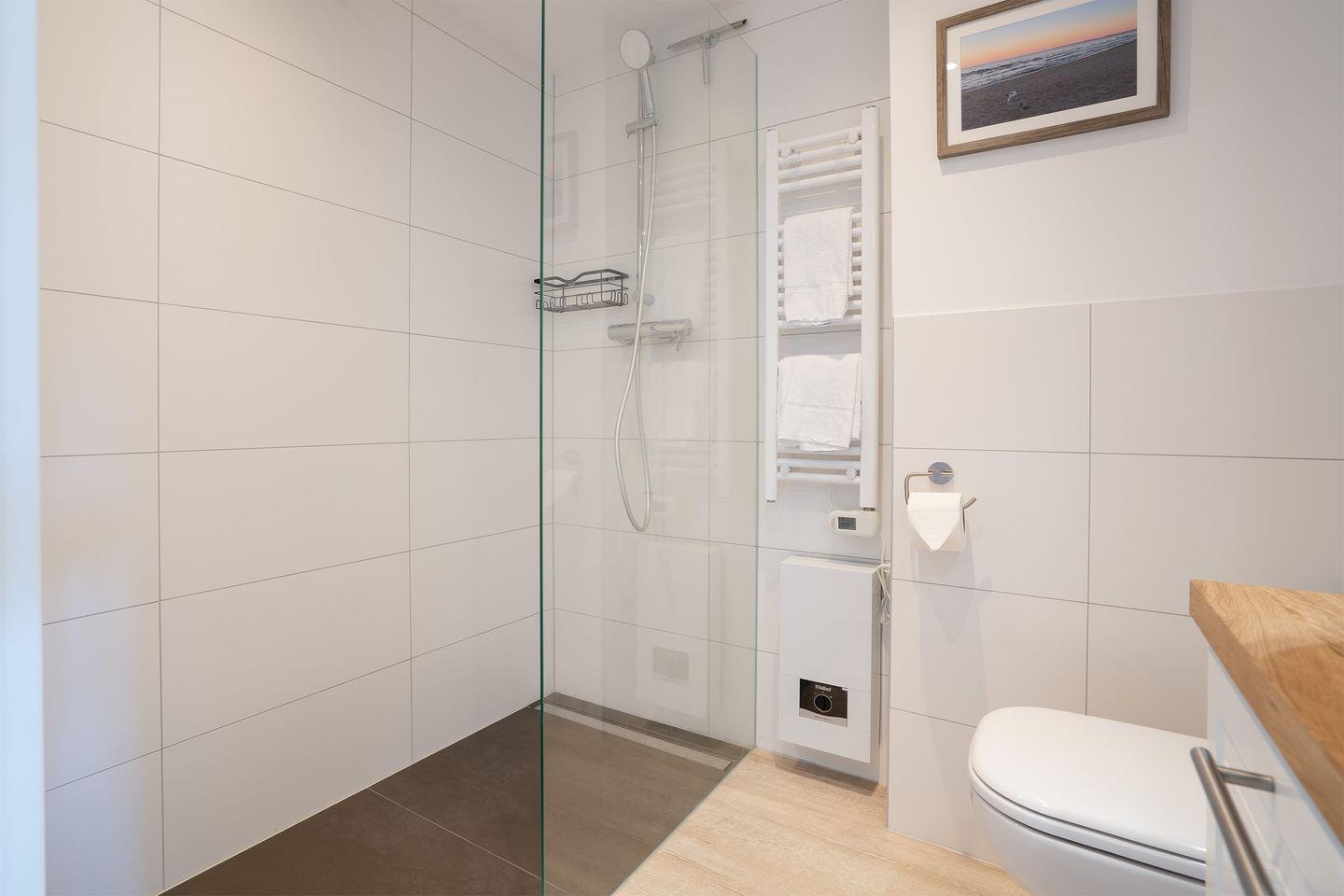 Das Badezimmer ist hell und mit einer bodengleichen Dusche mit zwei beweglichen Glaselementen zu nutzen. Im Bad befindet sich eine Fußbodenheizung und ein Handtuchheizkörper.