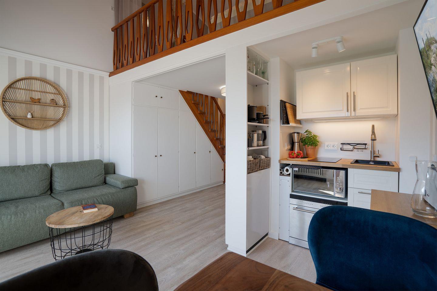 Der großzügige Wohnraum ist mit einer Schlafcouch, sowie einem Flatscreen Fernseher ausgestattet und bietet eine ebenso schöne Aussicht. Die Küche verfügt über eine gute Ausstattung (Filter-Kaffeemaschine und Wasserkocher etc.) mit Geschirrspüler, Mikrowelle (Heißluft mit Grillfunktion) und einem Induktionsherd. Der erhöhte Essbereich mit einem Esstisch und Stühlen schließt sich der Küche an.