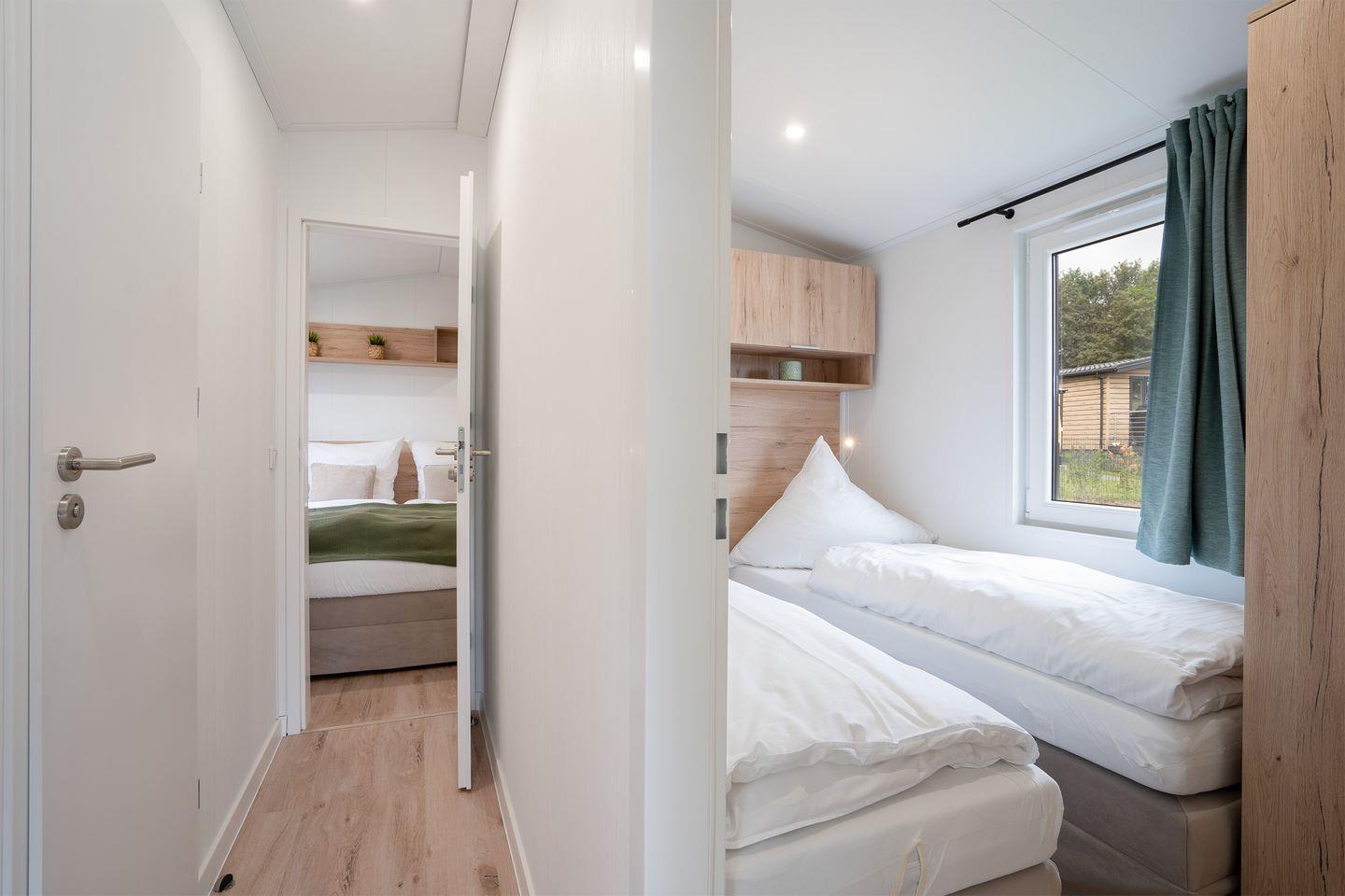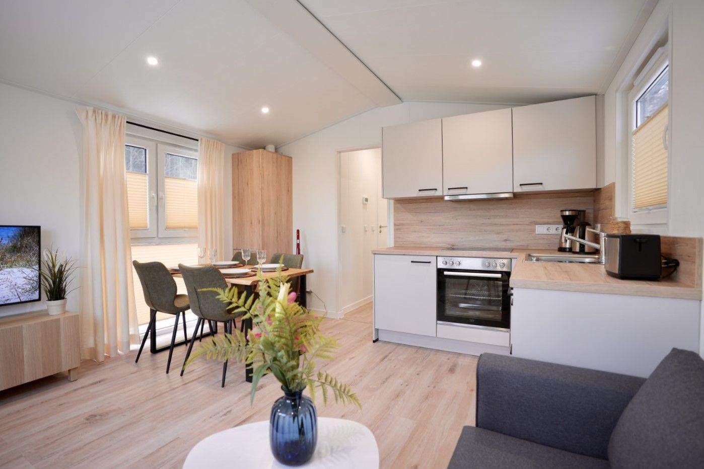 Die moderne Wohnküche ist bestens ausgestattet und lädt zum kulinarischen experimentieren ein. Eine Kaffeemaschine, ein Wasserkocher sowie einen Toaster stehen für Sie bereit. Ein Esstisch aus naturbelassener Eiche sowie gemütliche Stühle schaffen ein Ambiente, dass gemeinsame Mahlzeiten zu einem Fest der Sinne macht. Das Sofa verwandelt sich bei Bedarf in ein zusätzliches Bett, während der 43“ Smart-TV an regnerischen Tagen für Unterhaltung sorgt. Großzügige Fenster bieten Blicke auf den umliegenden Wald oder das Ostseecamp Lübecker Bucht.