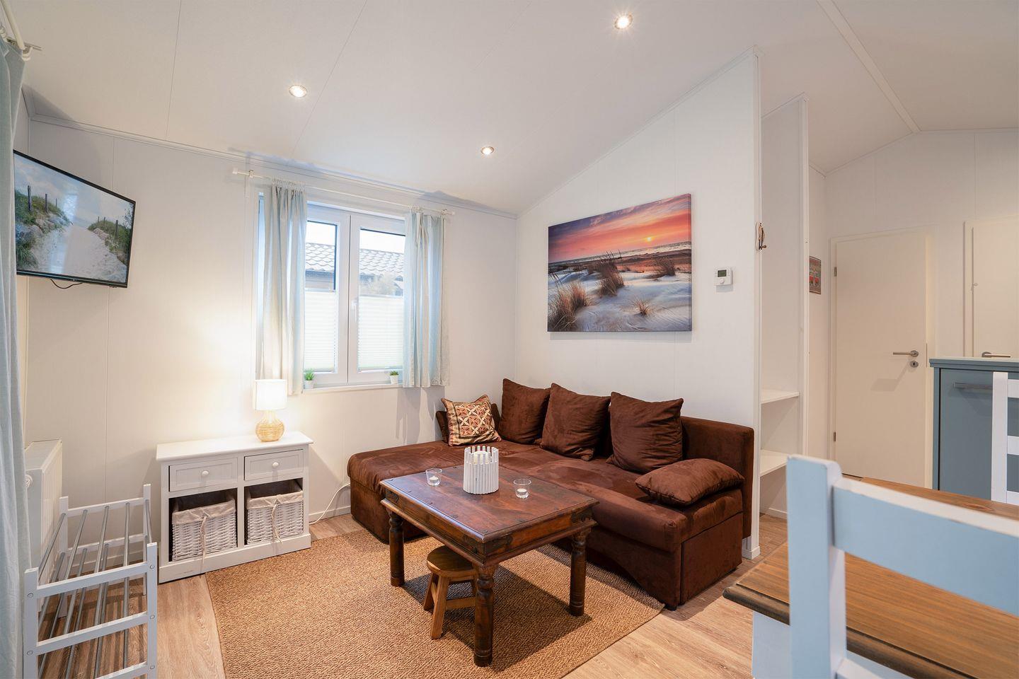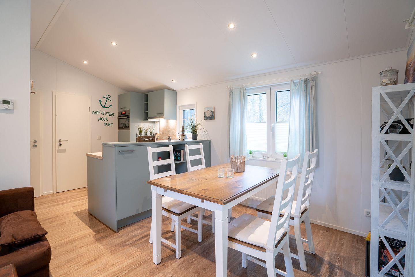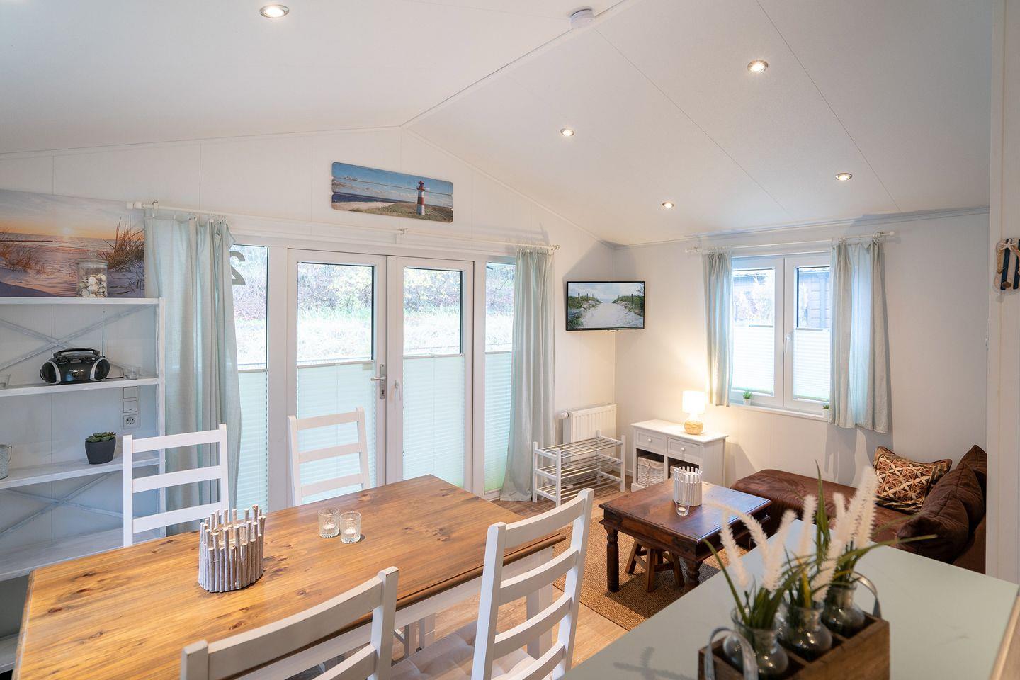 Die Einrichtung des Hauses zeichnet sich durch eine offene, helle Gestaltung aus. Das Wohnzimmer ist mit einer gemütlichen Sofaecke ausgestattet und bietet mit einem 35- bis 44-Zoll-Satellitenfernseher sowie WLAN eine angenehme Atmosphäre zum Entspannen. Der Vinylboden in Wohn- und Schlafzimmern unterstreicht die moderne Ausstattung der Räume. Eine Heizungsanlage mit Gas sorgt auch an kühleren Tagen für wohlige Wärme.