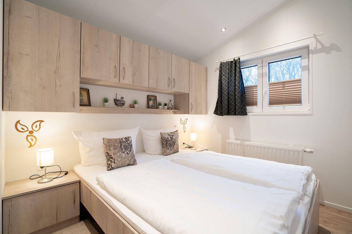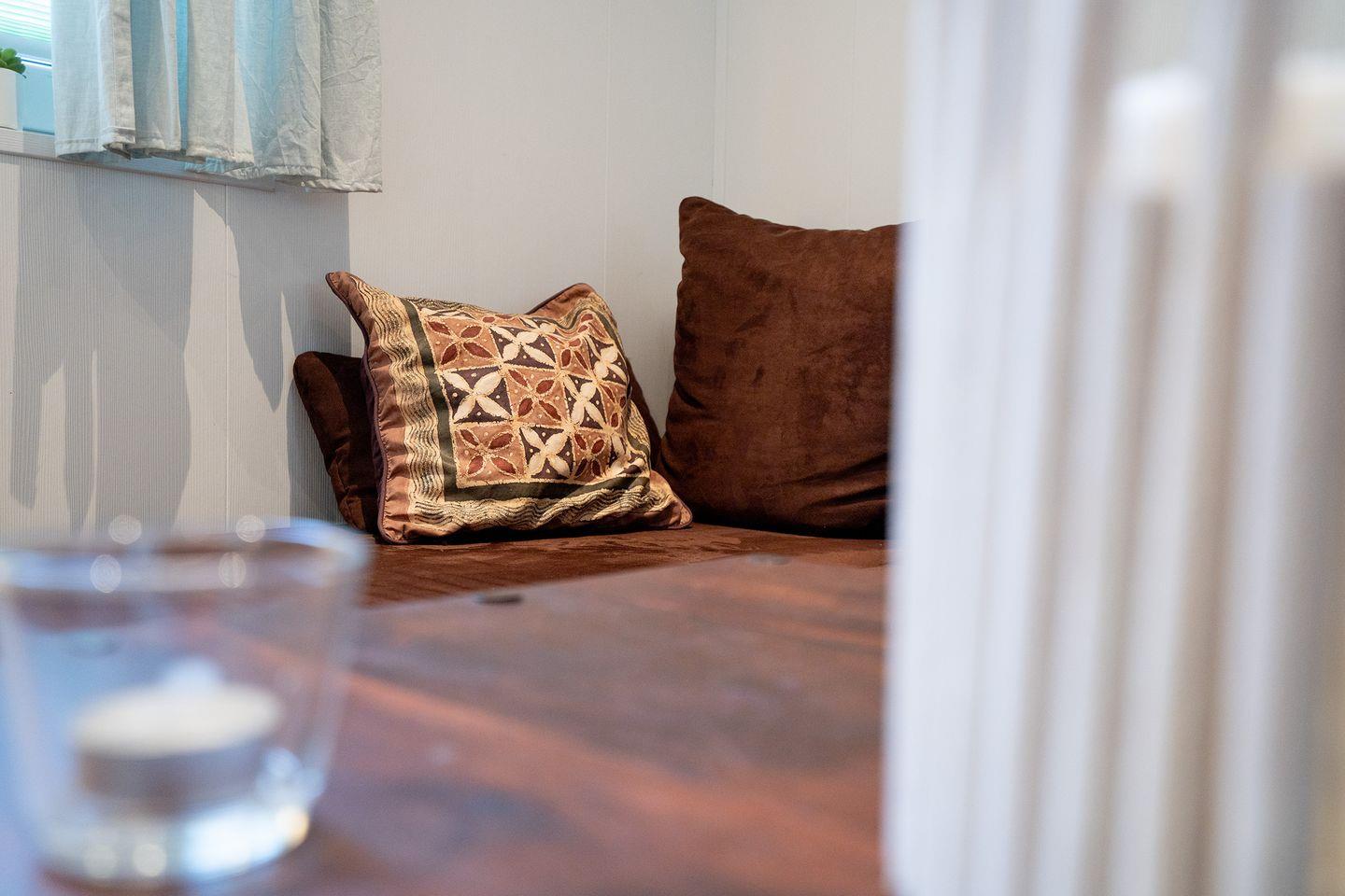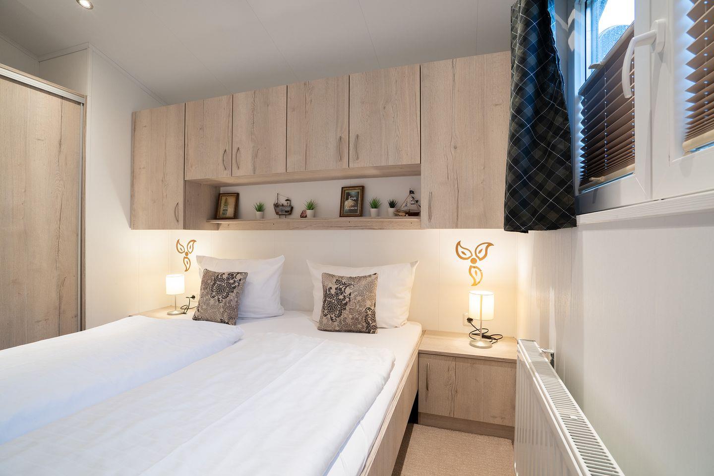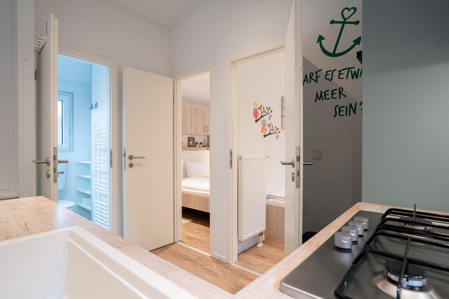 Die Einrichtung des Hauses zeichnet sich durch eine offene, helle Gestaltung aus. Das Wohnzimmer ist mit einer gemütlichen Sofaecke ausgestattet und bietet mit einem 35- bis 44-Zoll-Satellitenfernseher sowie WLAN eine angenehme Atmosphäre zum Entspannen. Der Vinylboden in Wohn- und Schlafzimmern unterstreicht die moderne Ausstattung der Räume. Eine Heizungsanlage mit Gas sorgt auch an kühleren Tagen für wohlige Wärme.